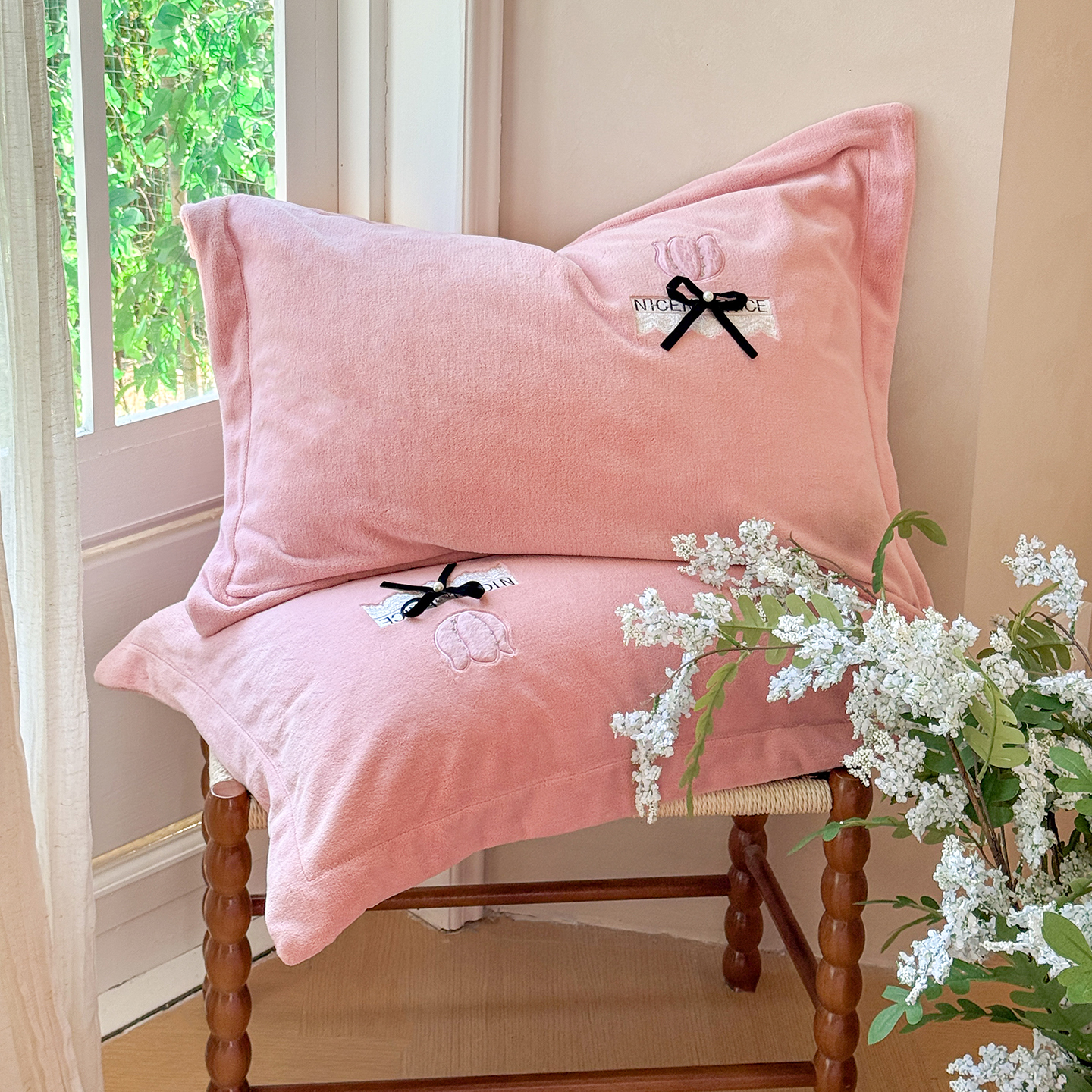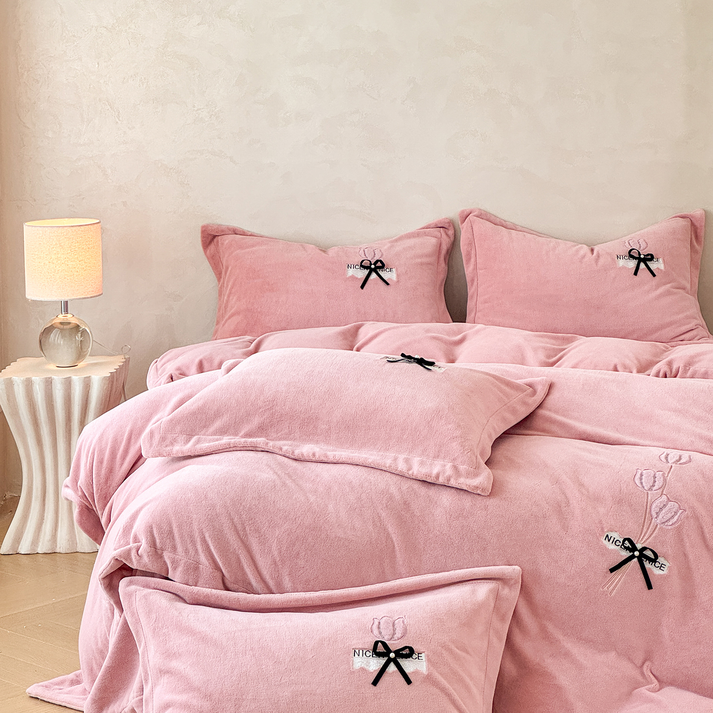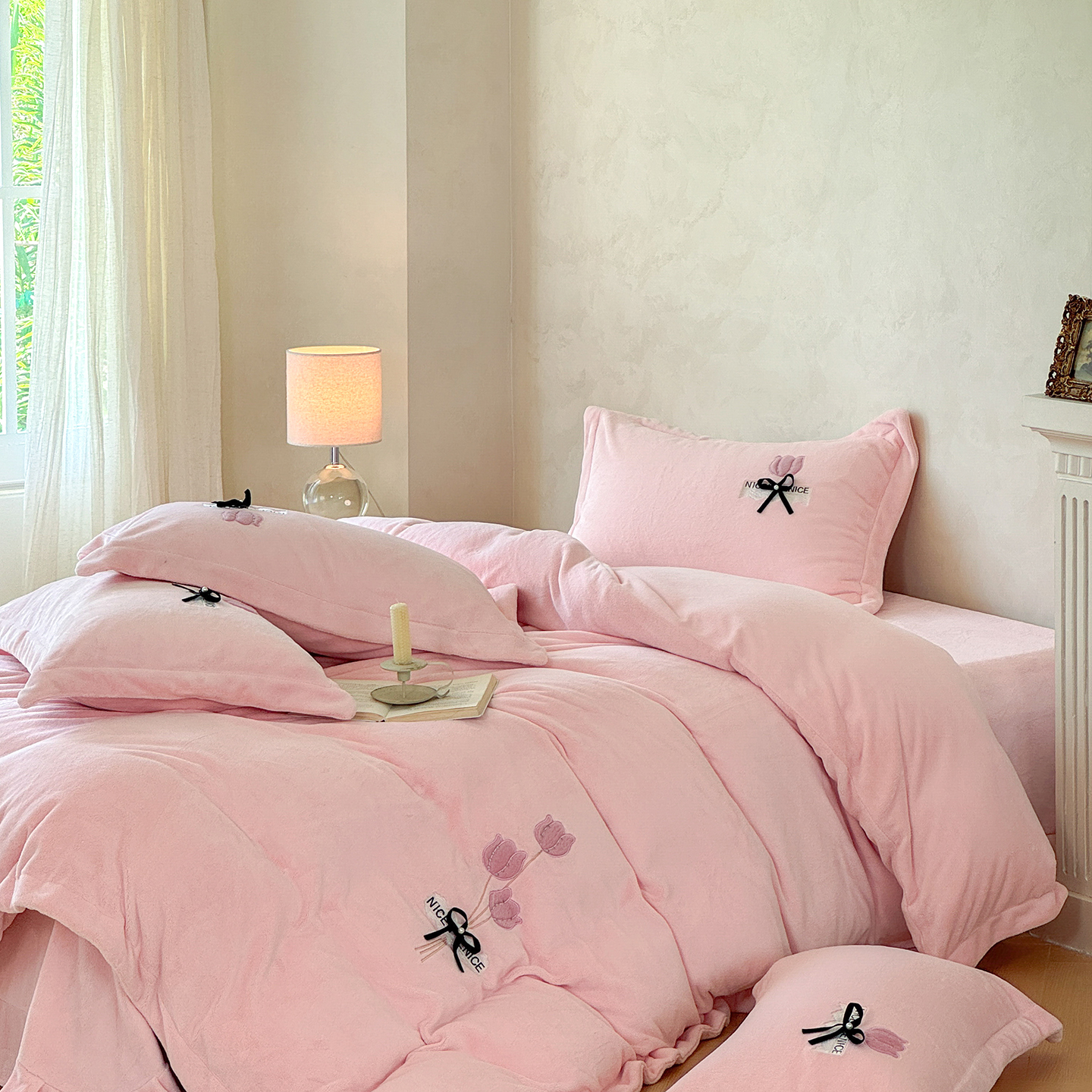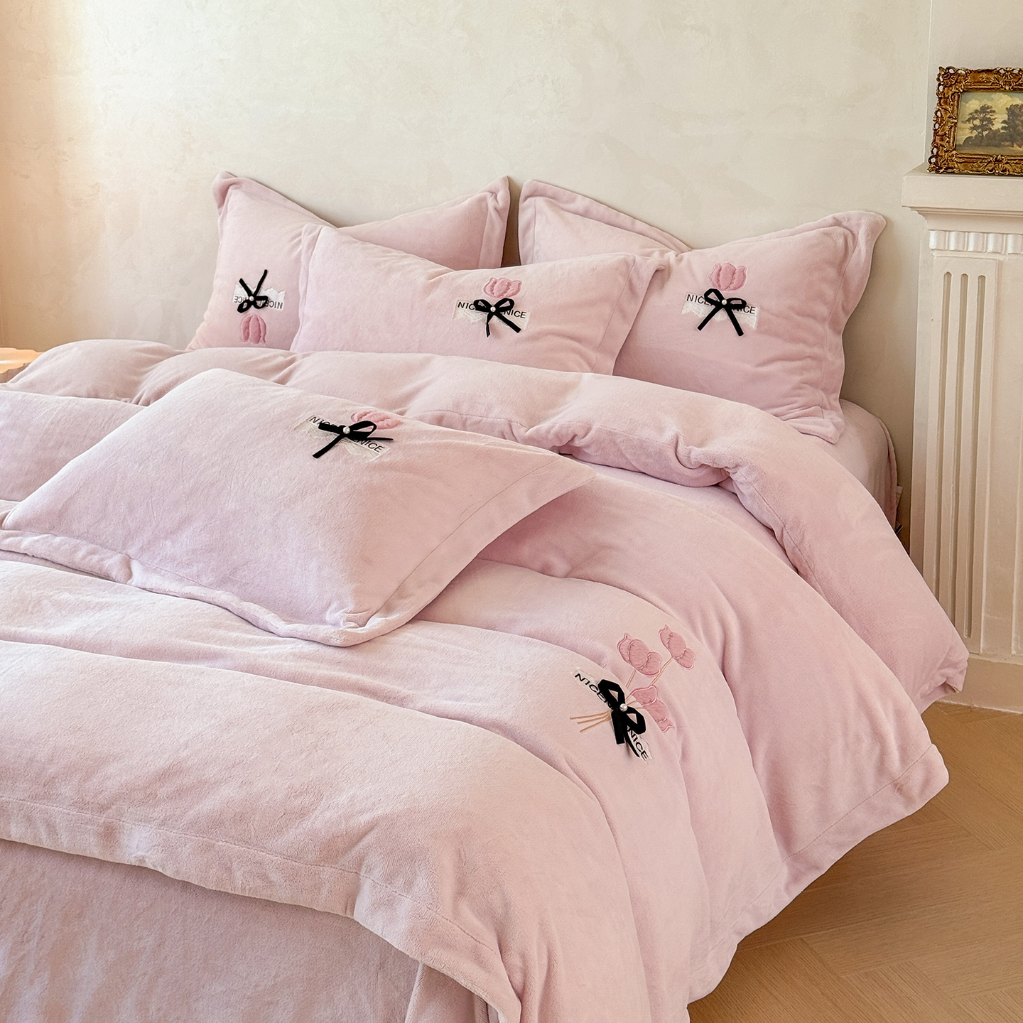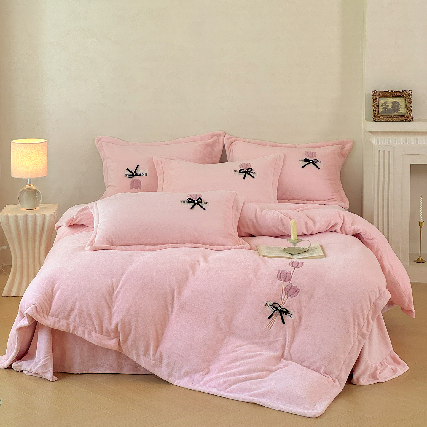 商品名称:恋尚羽家纺 2025新款加厚全消光绣花牛奶绒宽边四件套 粉色