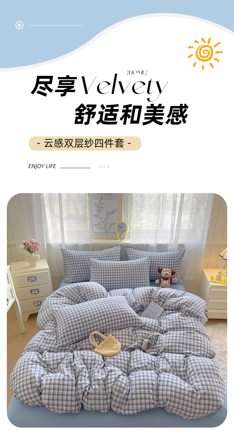 当前位置: 91家纺网 > 商品网购 > 床品套件 > 四件套 > 双层纱四件套 > 好亿来家纺 2025新款加厚A类云感双层纱四件套 麦斯-蓝