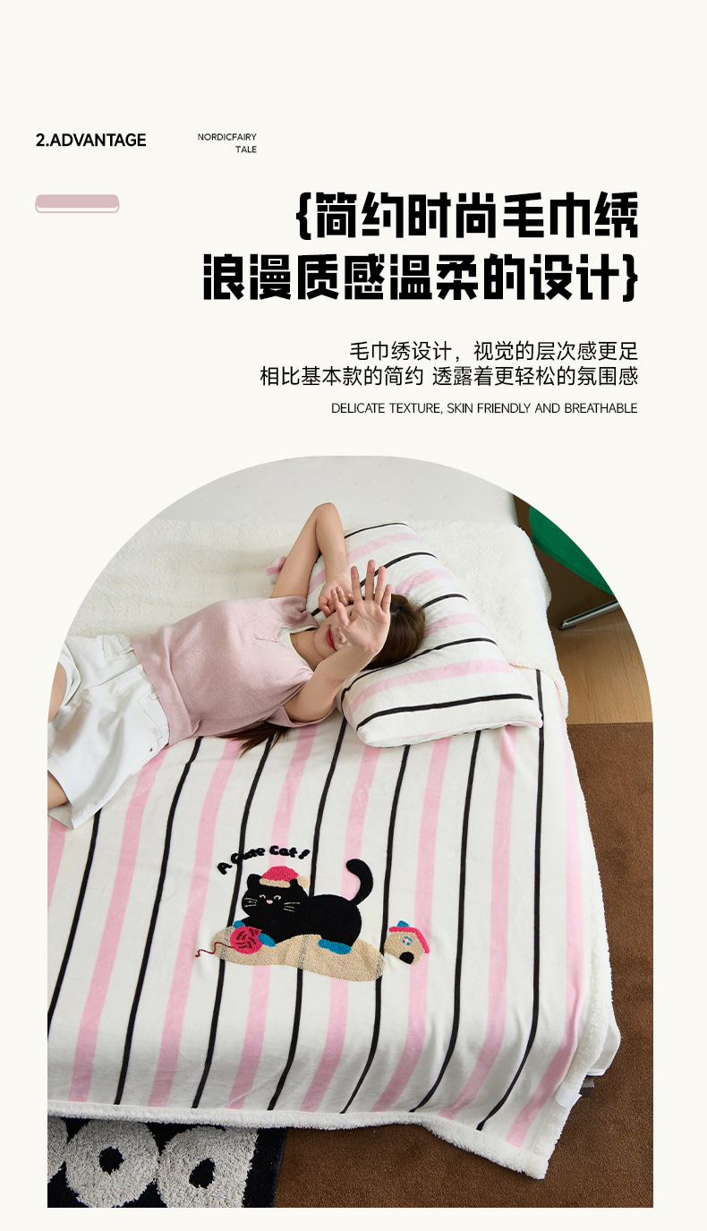 商品名称:呗旺鹿 2025新款高克重羊羔绒牛奶绒毛巾绣双层毯 黑白条纹小猫