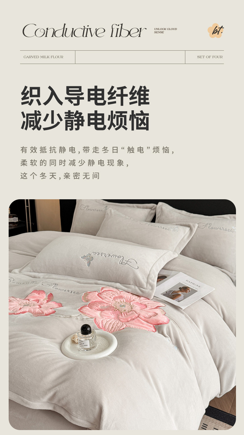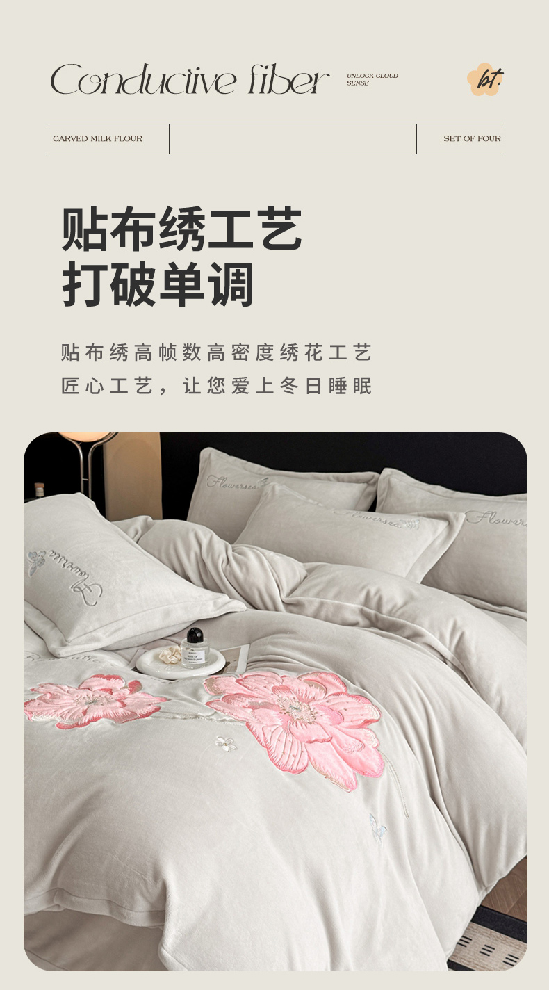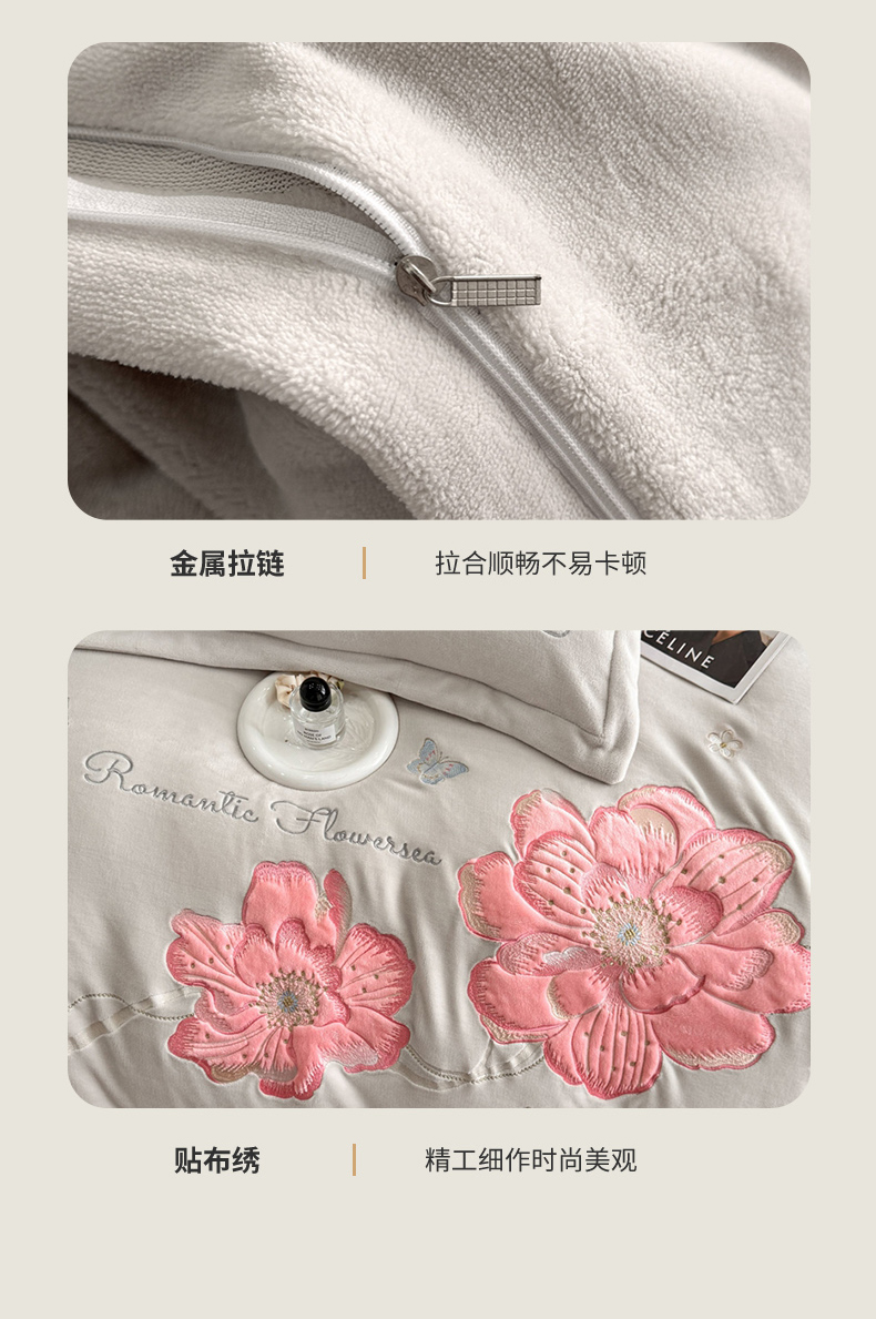 商品名称:喜梦缘家纺 2025新款牛奶绒大版贴布绣四件套 富贵花开-米杏