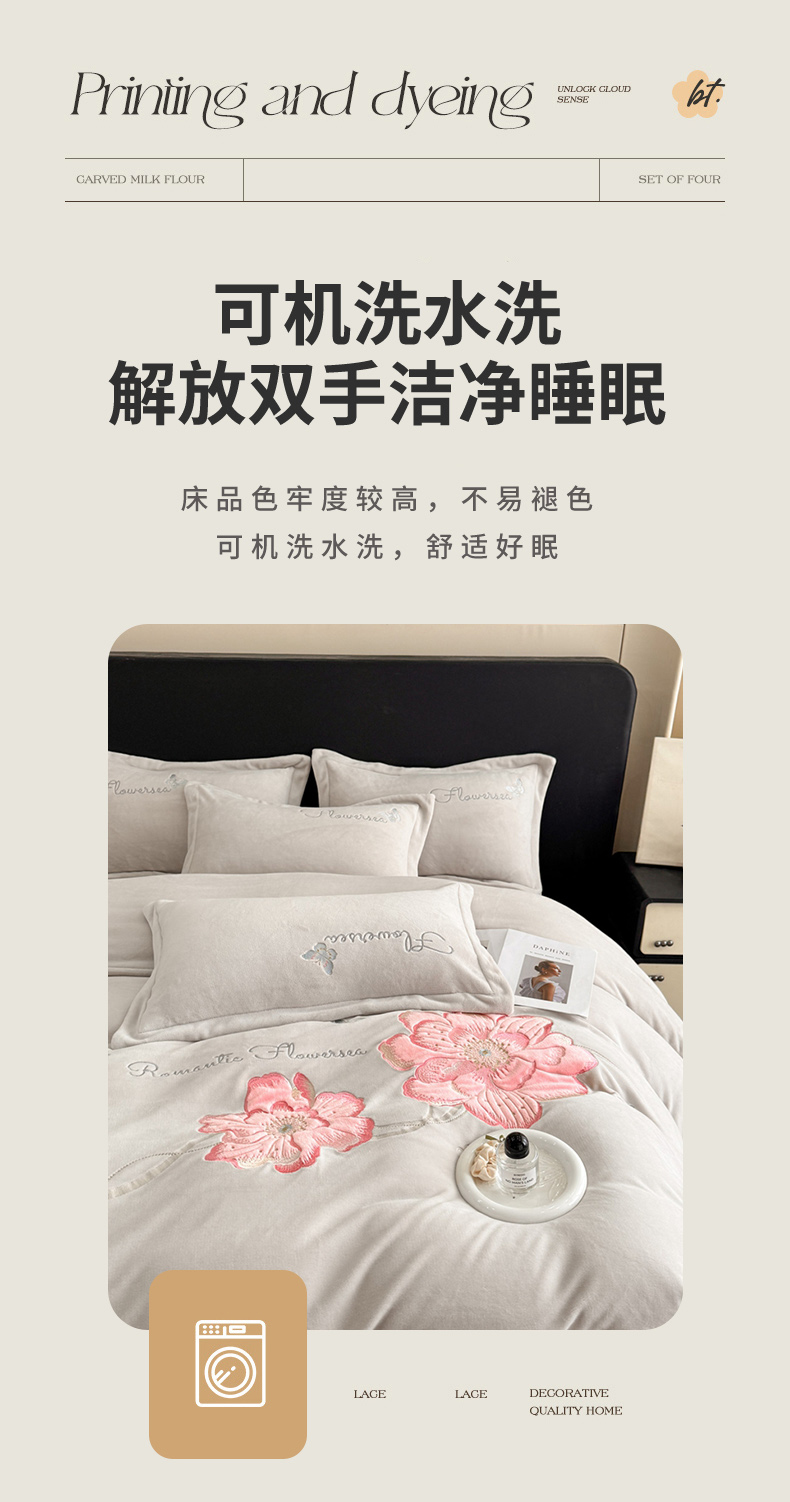 喜梦缘家纺 2025新款牛奶绒大版贴布绣四件套 富贵花开-米杏