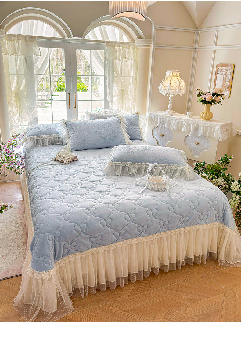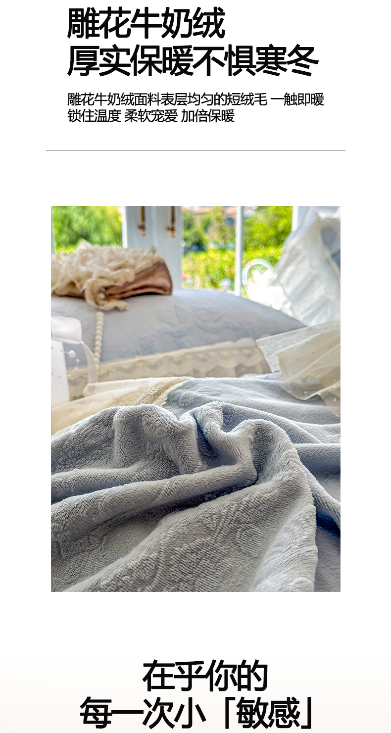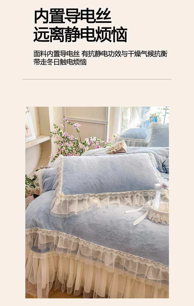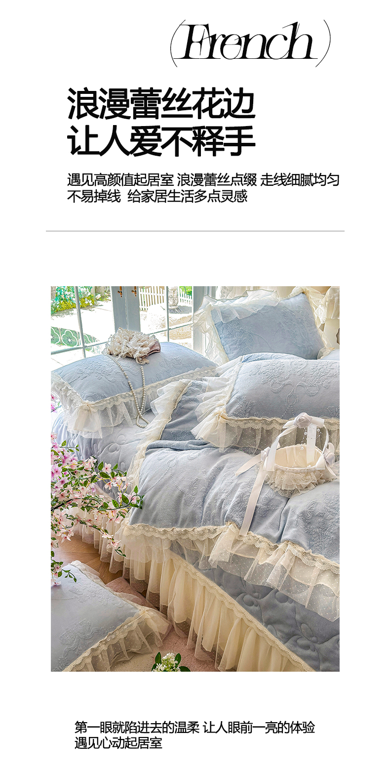 商品名称:虹星家纺 2025新款法式雕花牛奶绒花边床盖四件套-星光碟影 星光蝶影-海盐蓝
