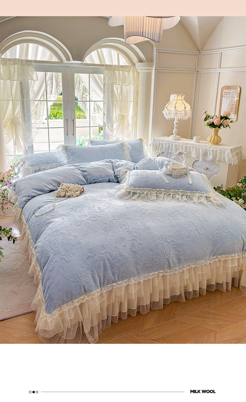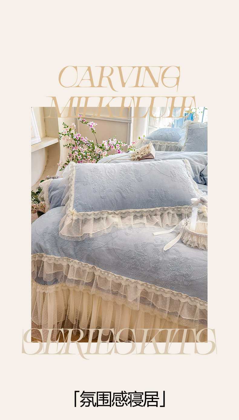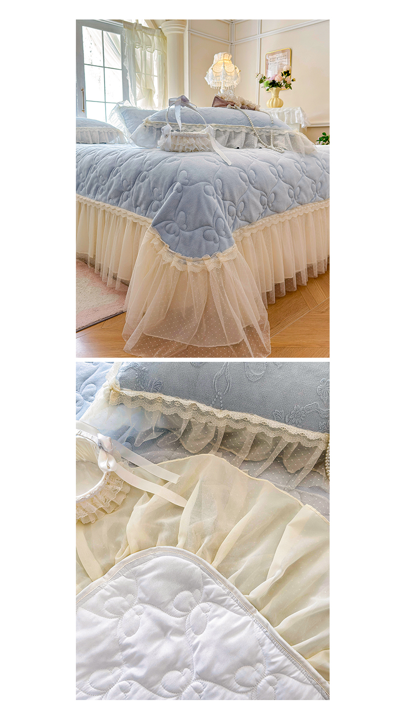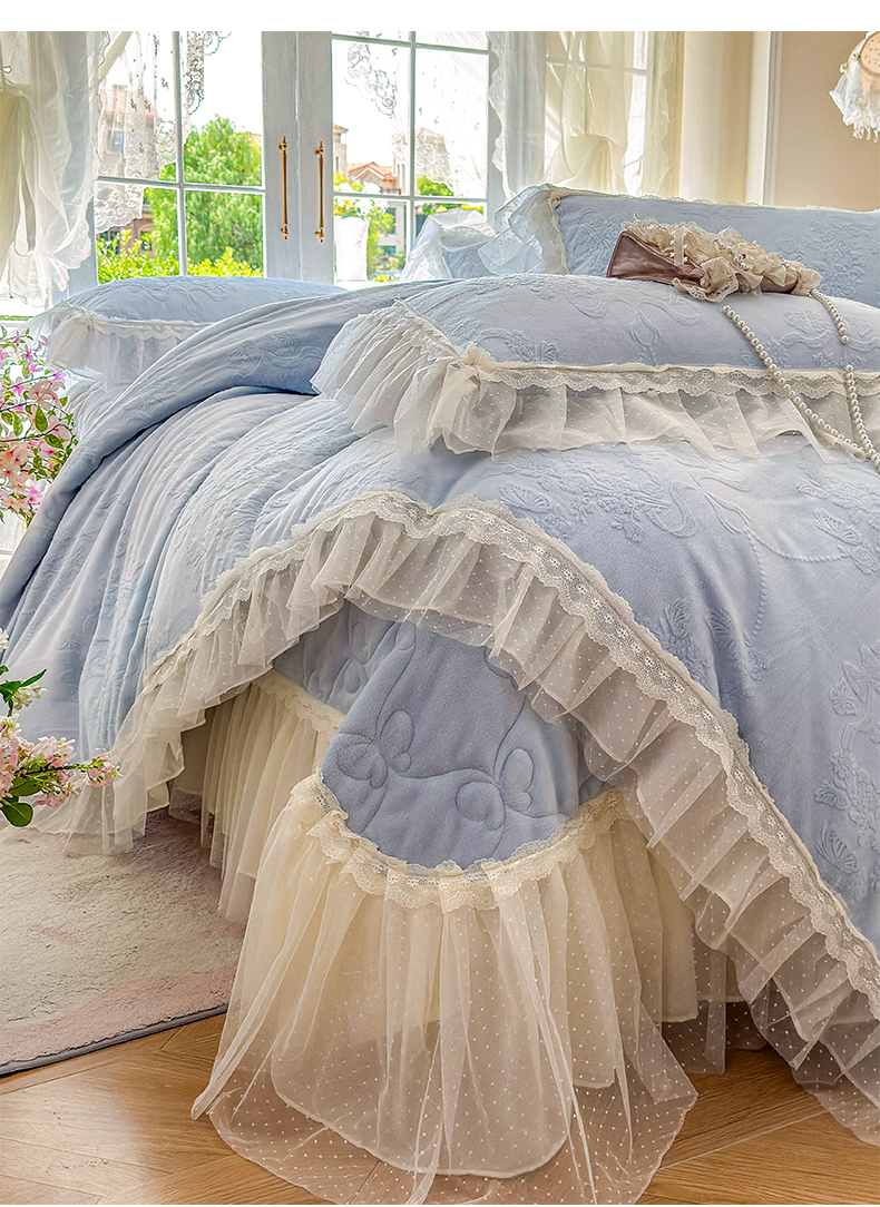 商品名称:虹星家纺 2025新款法式雕花牛奶绒花边床盖四件套-星光碟影 星光蝶影-海盐蓝