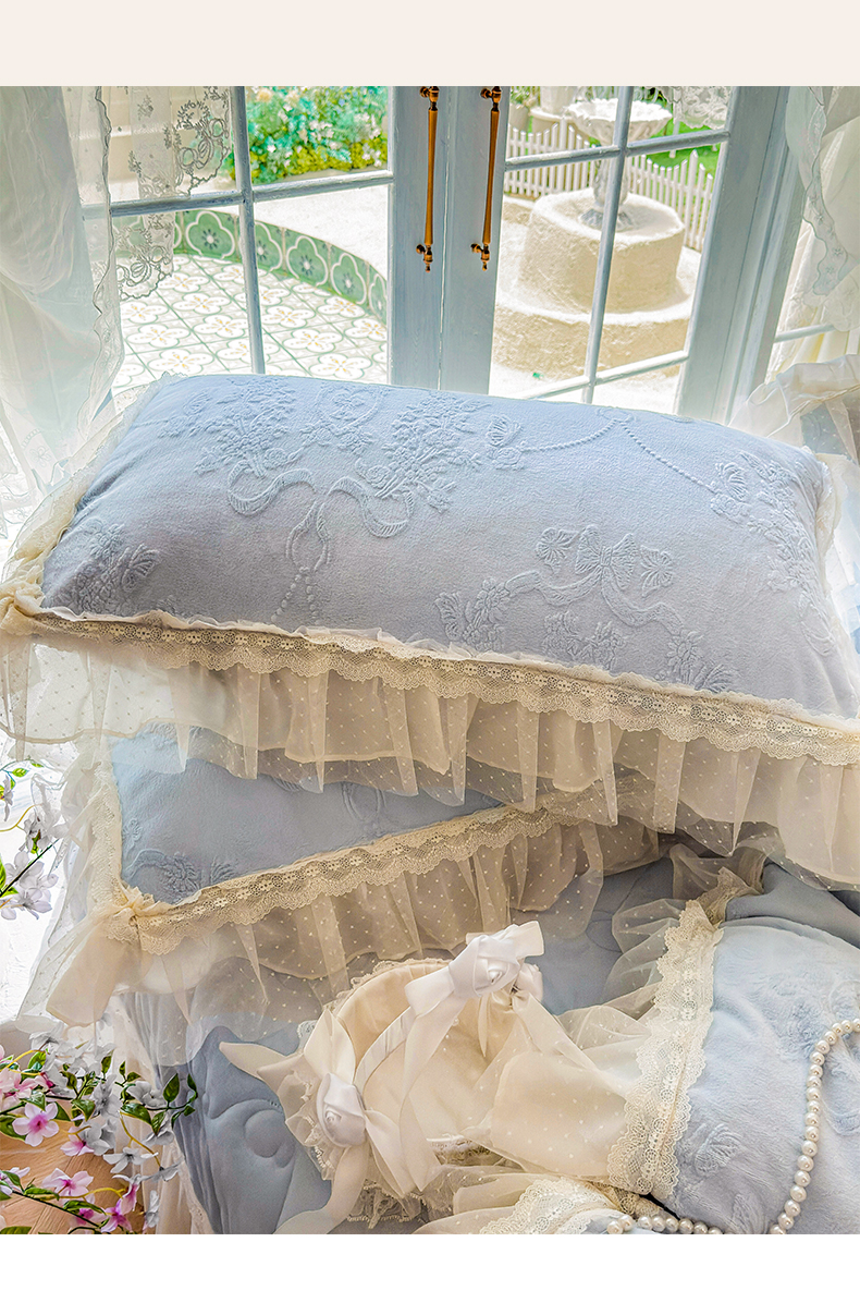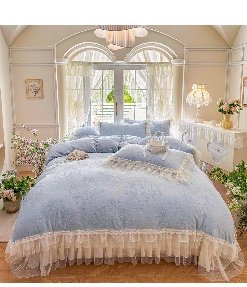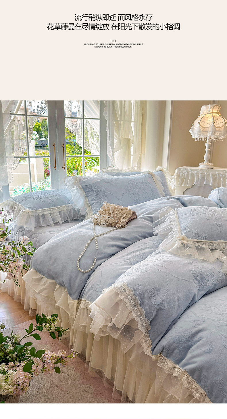 虹星家纺 2025新款法式雕花牛奶绒花边床盖四件套-星光碟影 星光蝶影-海盐蓝