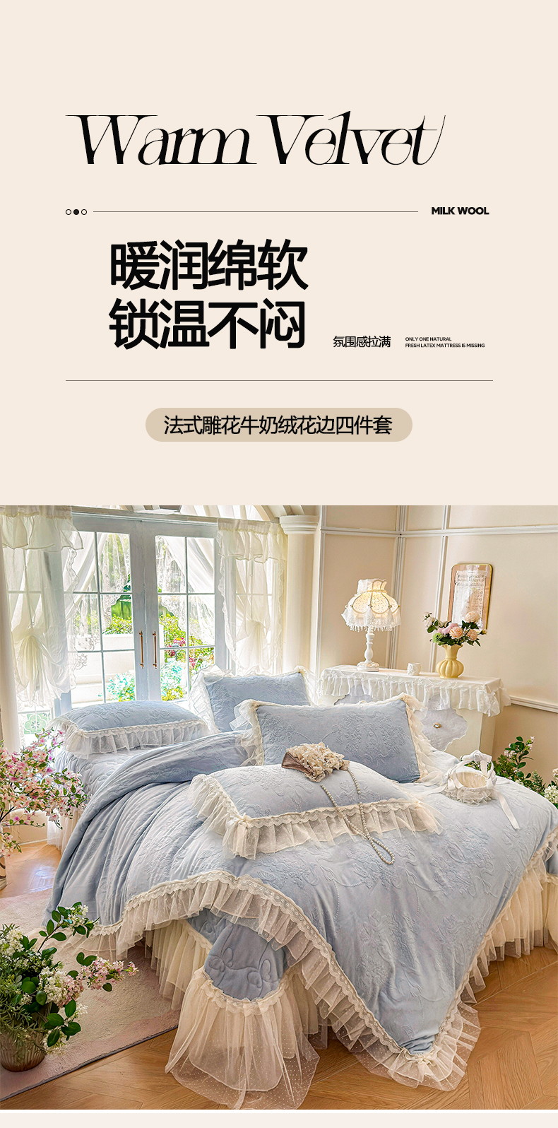 (总)虹星家纺 2025新款法式雕花牛奶绒花边床盖四件套-星光碟影,星光蝶影-海盐蓝,星光蝶影-丁香紫,星光蝶影-浅米白,星光蝶影-青石绿,星光蝶影-紫雾色,星光蝶影-樱花粉