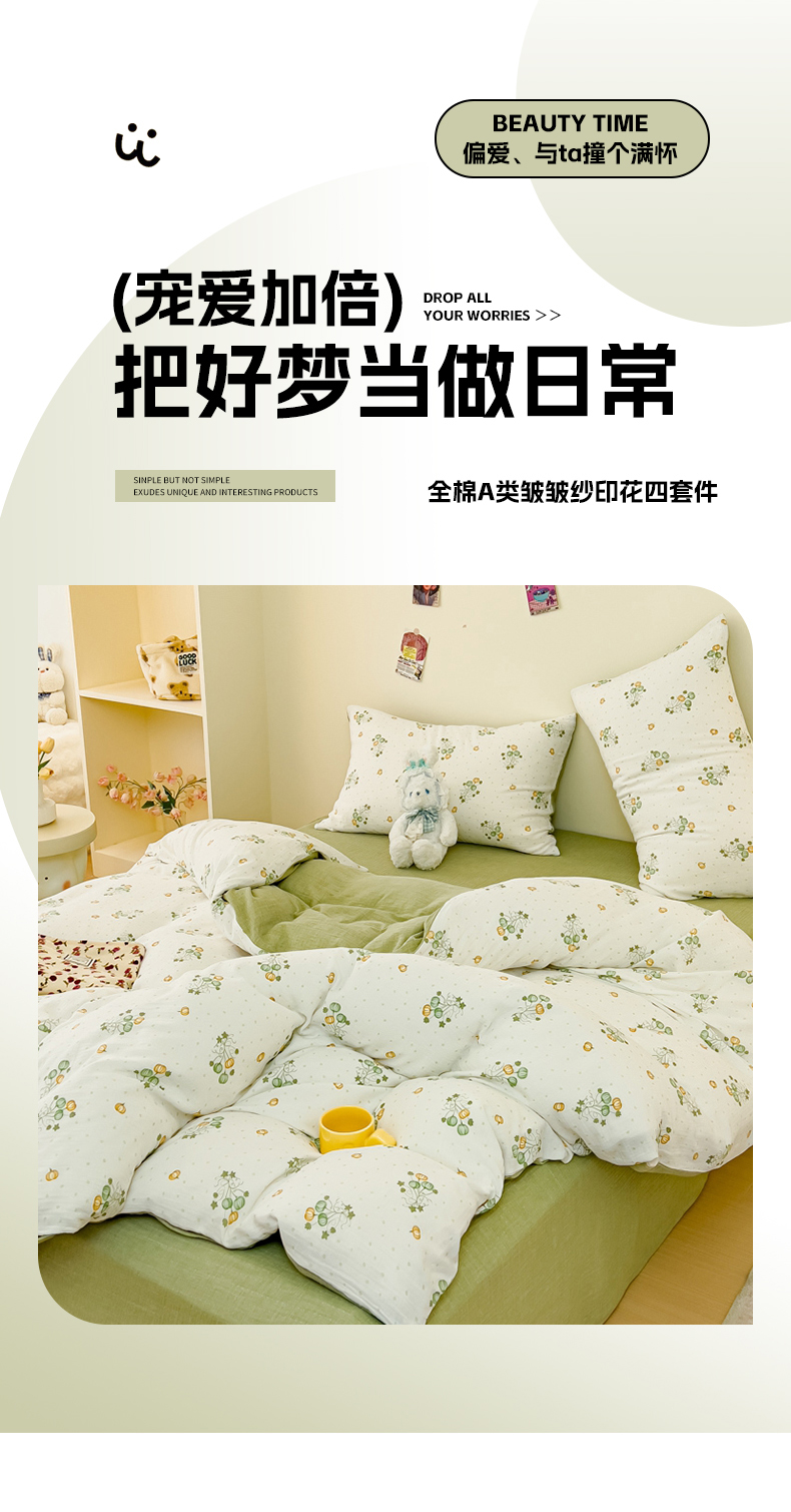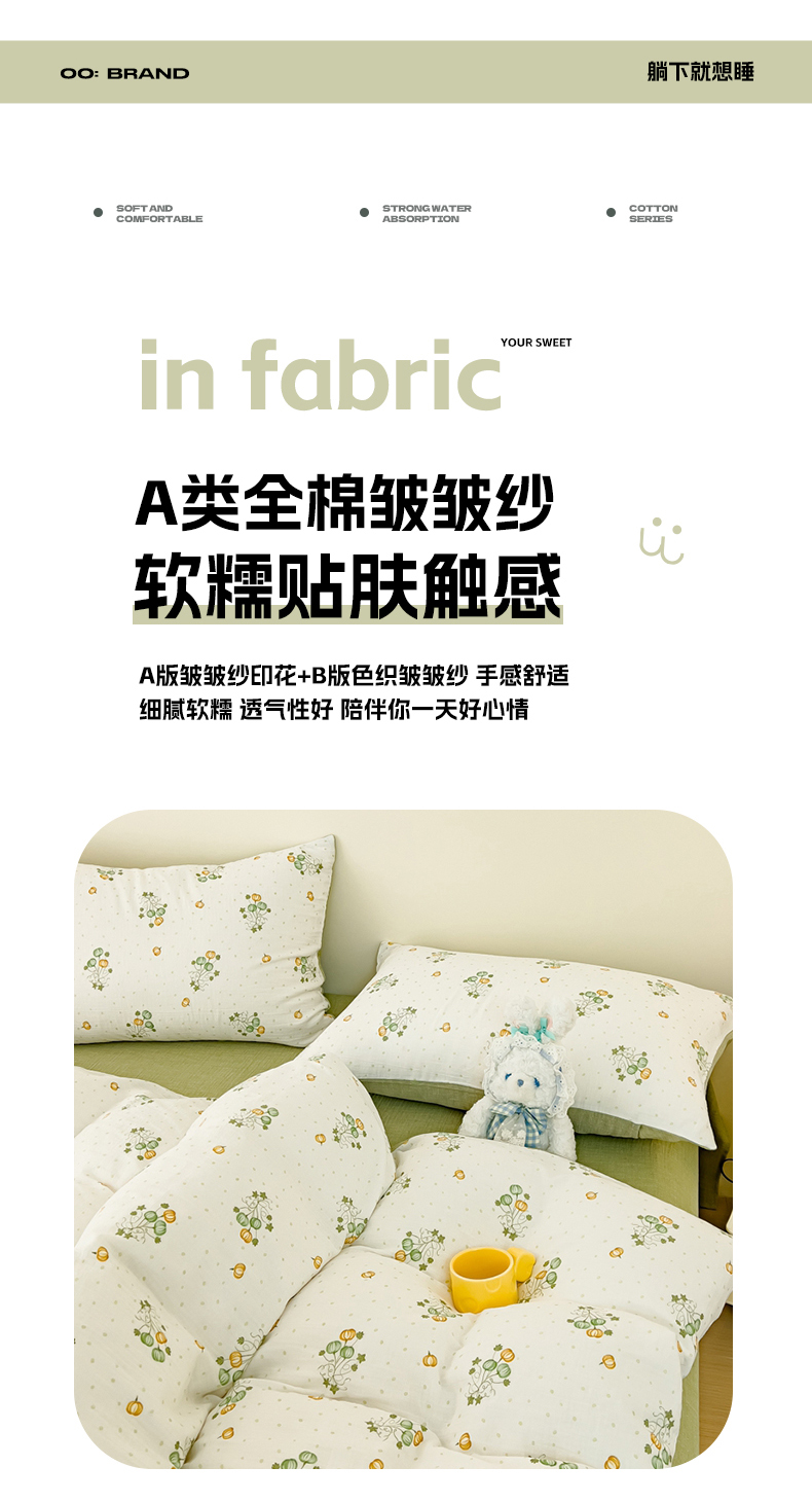 商品名称:木楌家居 2025春夏新品全棉A类皱皱纱印花四件套 小南国