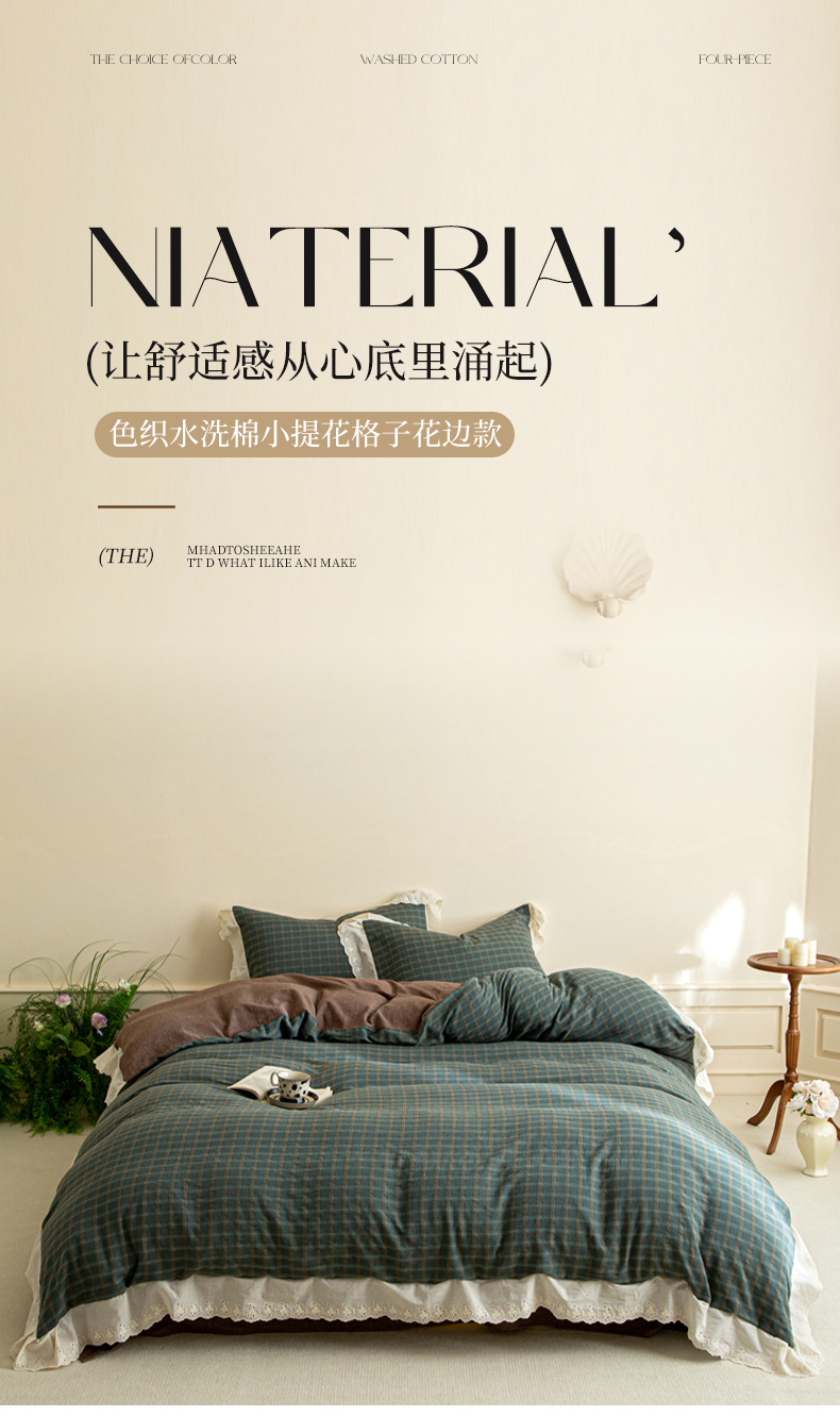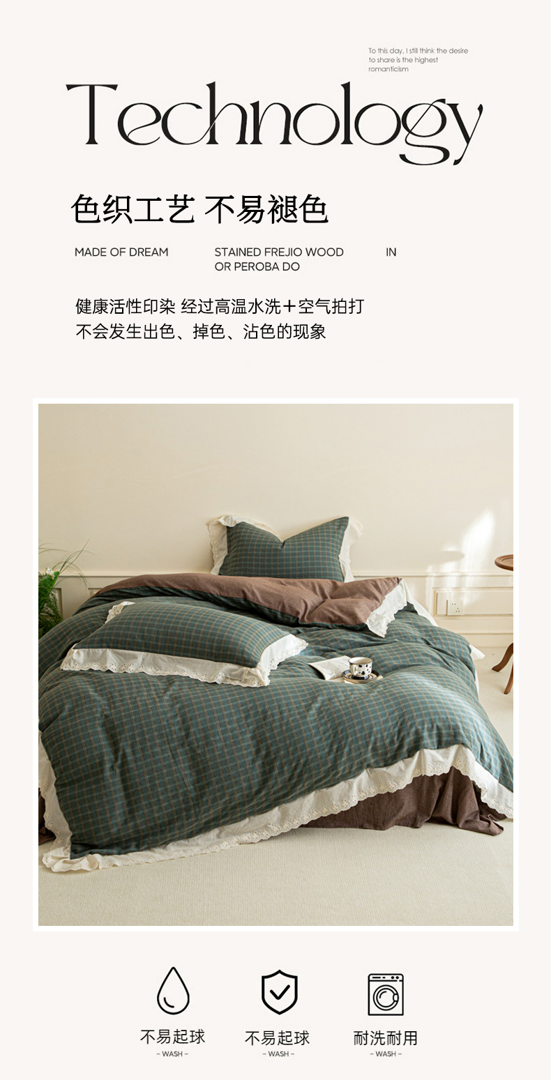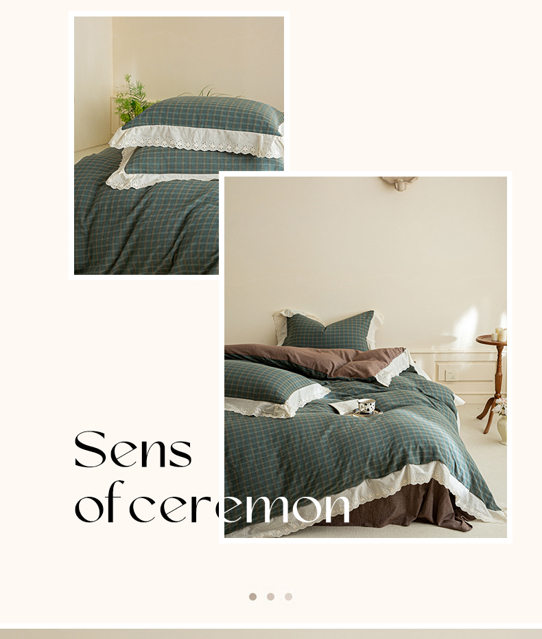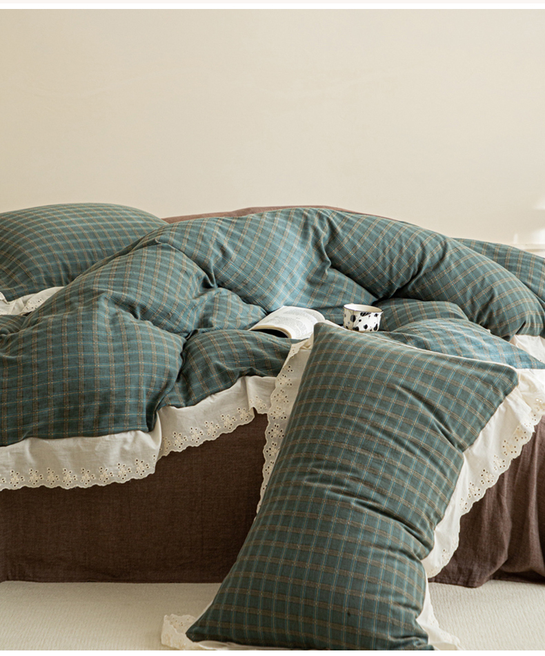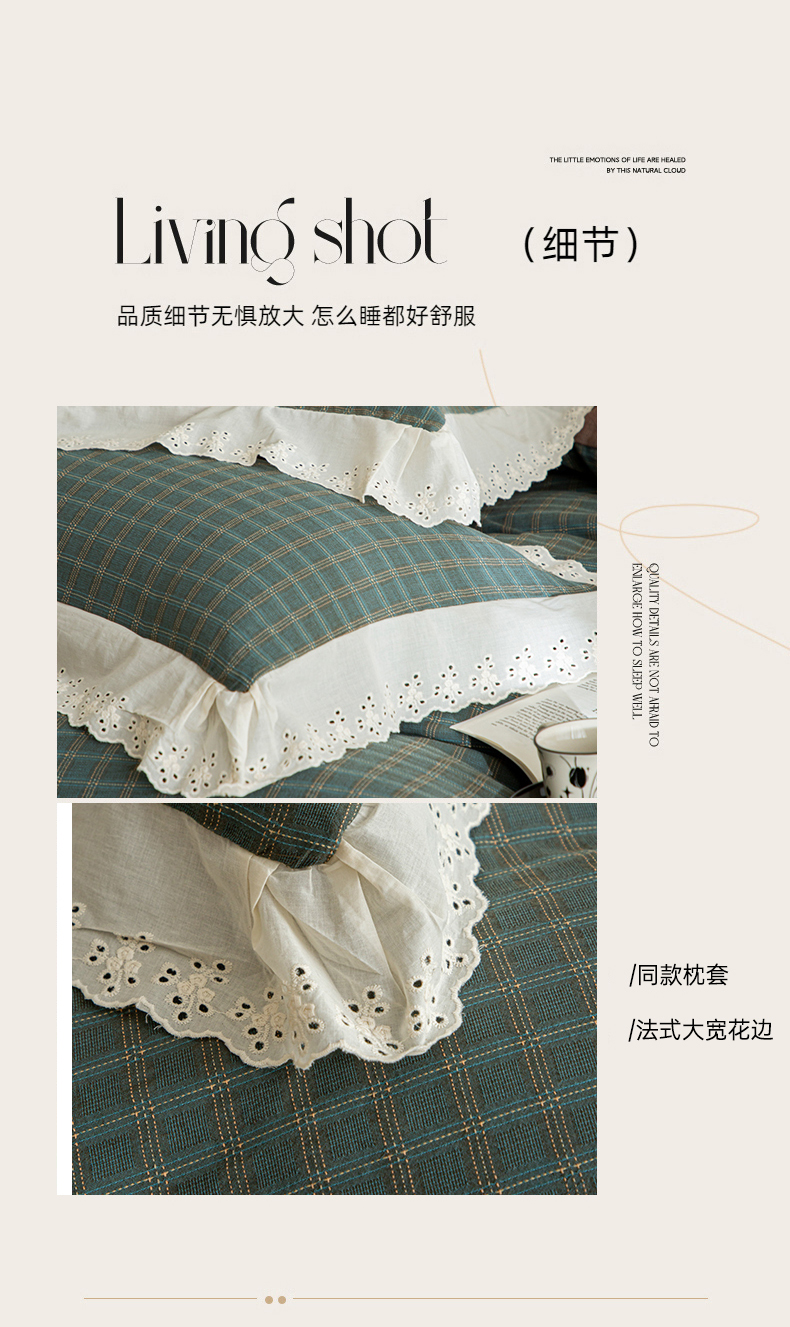 商品名称:棉眠 2025新款全棉色织双层纱格子法式大花边款 海莉-绿