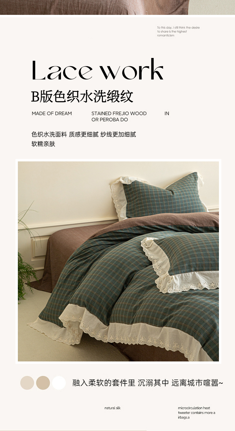 (总)棉眠 2025新款全棉色织双层纱格子法式大花边款,海莉-黑咖,海莉-绿,蕾拉