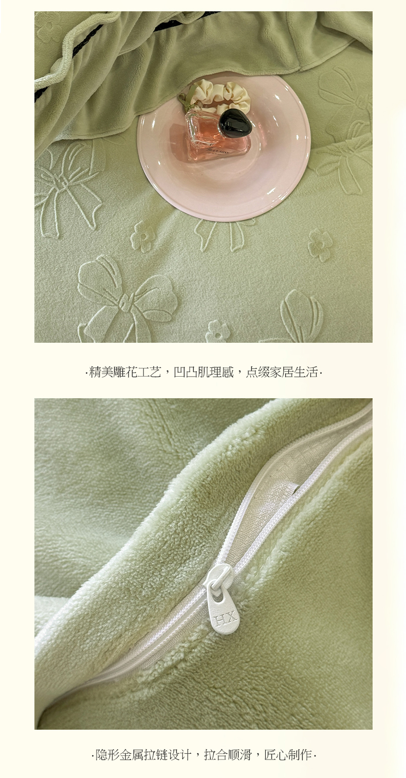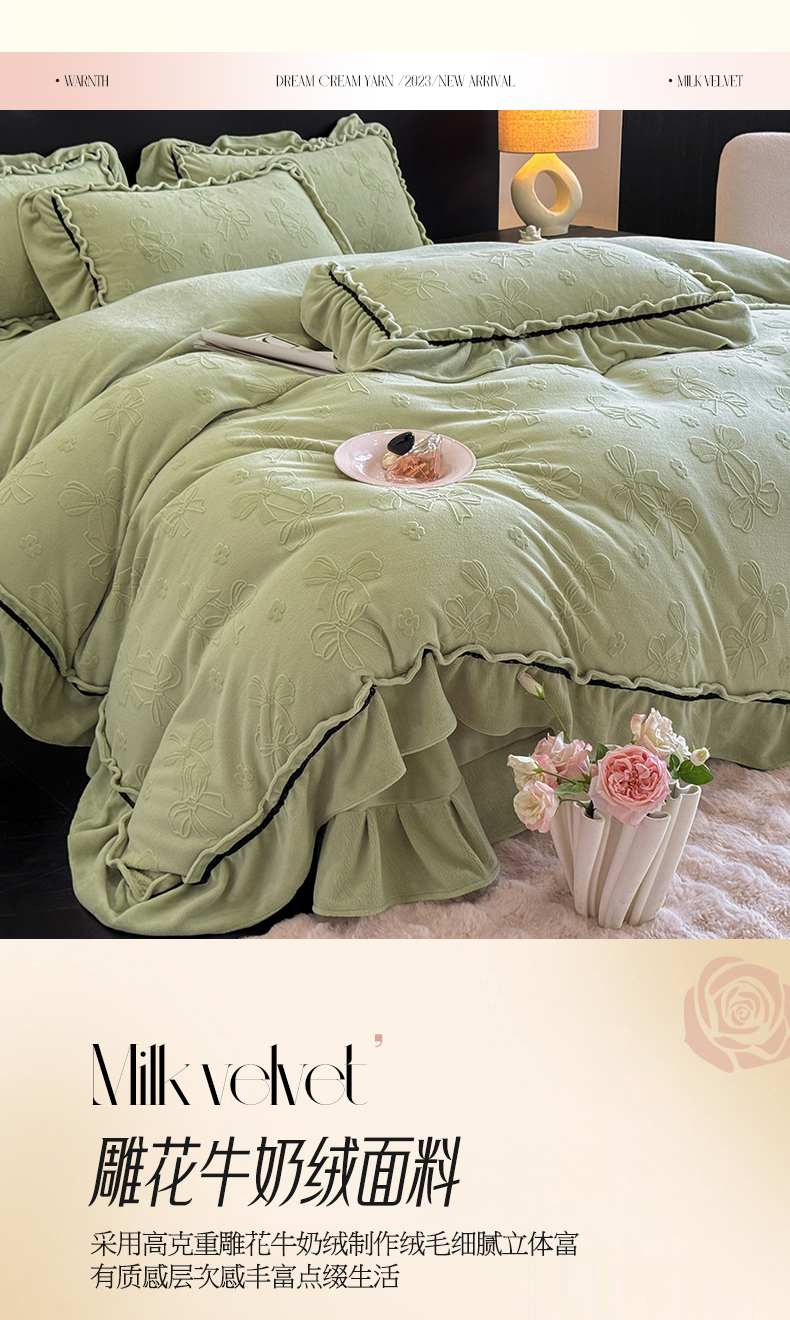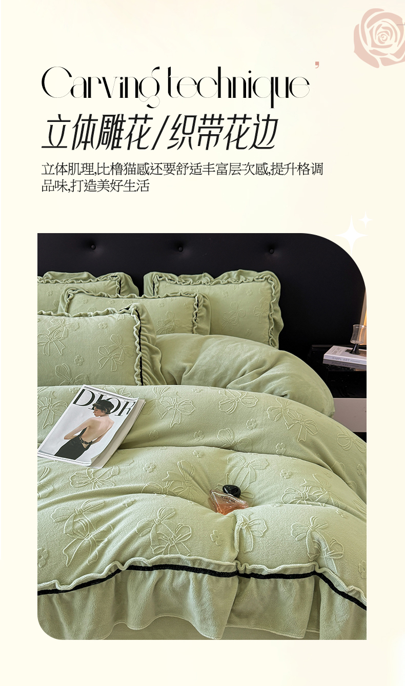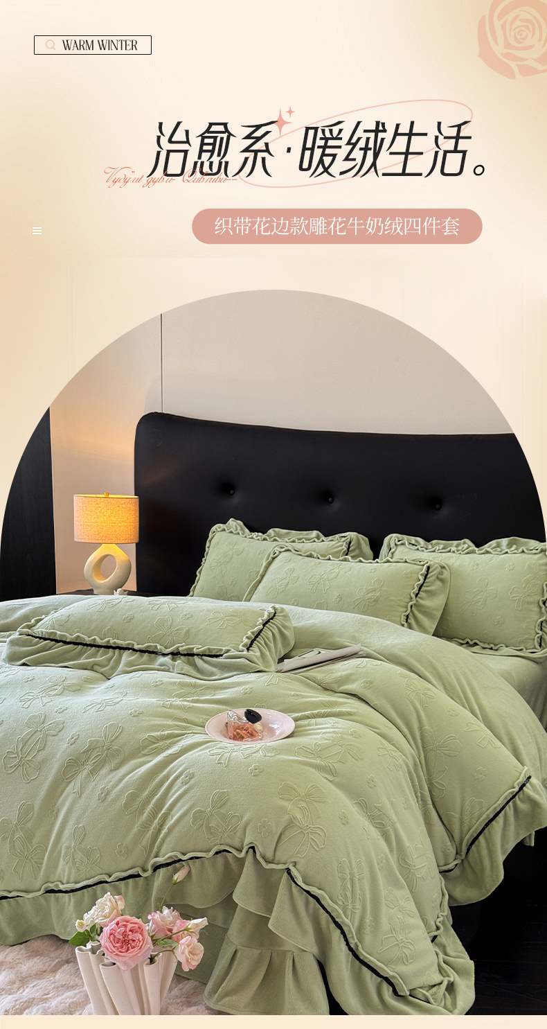 绘萱家居 2025新款新品爆款高密消光织带花边款雕花牛奶绒四件套 薇薇安-绿