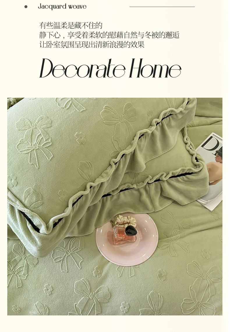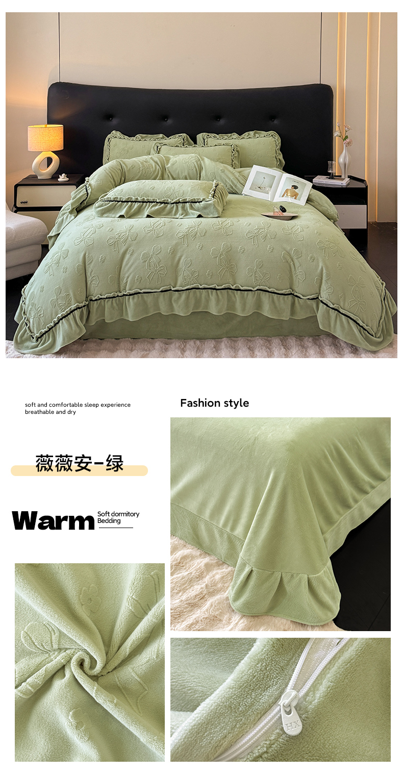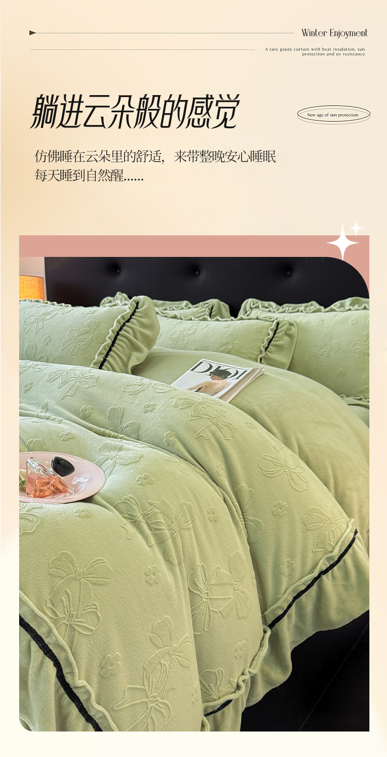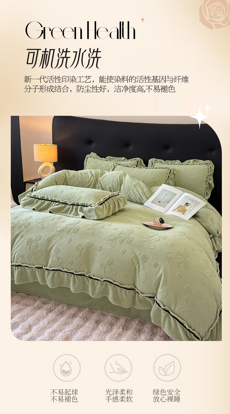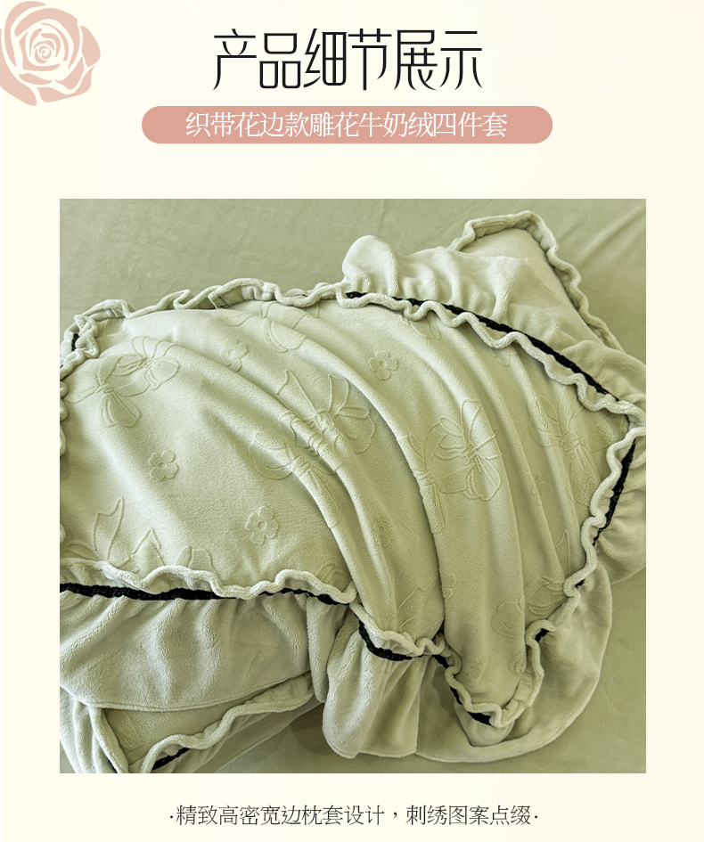 商品名称:绘萱家居 2025新款新品爆款高密消光织带花边款雕花牛奶绒四件套 薇薇安-绿