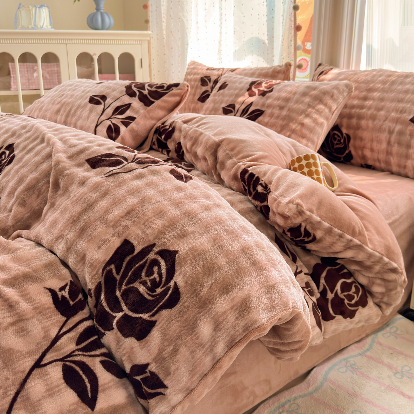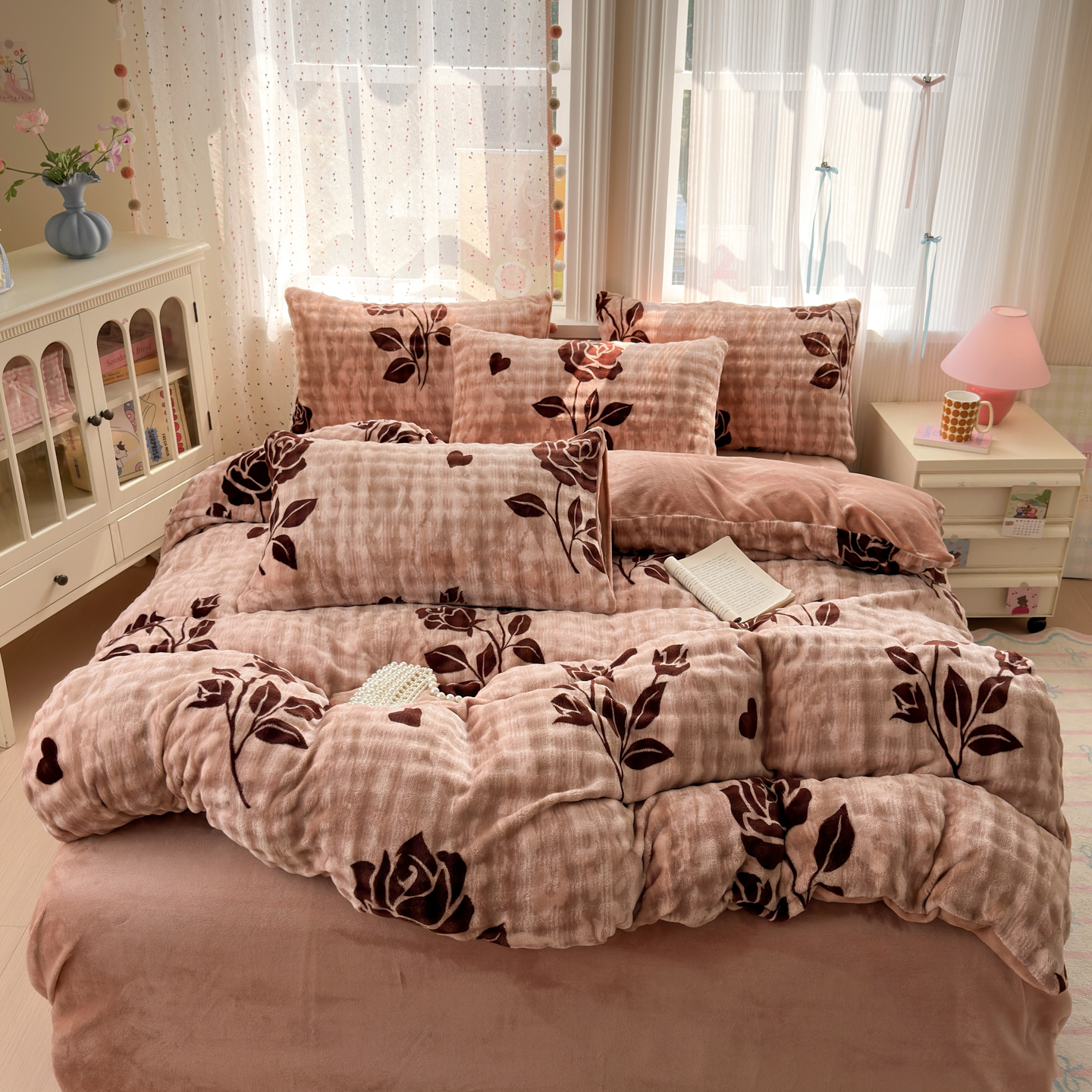 (总)德比尔斯 2025新款韩版白边黑边赫本风牛奶绒床盖四件套,爱心小熊,安妮粉,蝶恋花粉,法风小香,赫本-蝴蝶结粉,赫本-蝴蝶结咖,盛夏丛林,晕染花曳