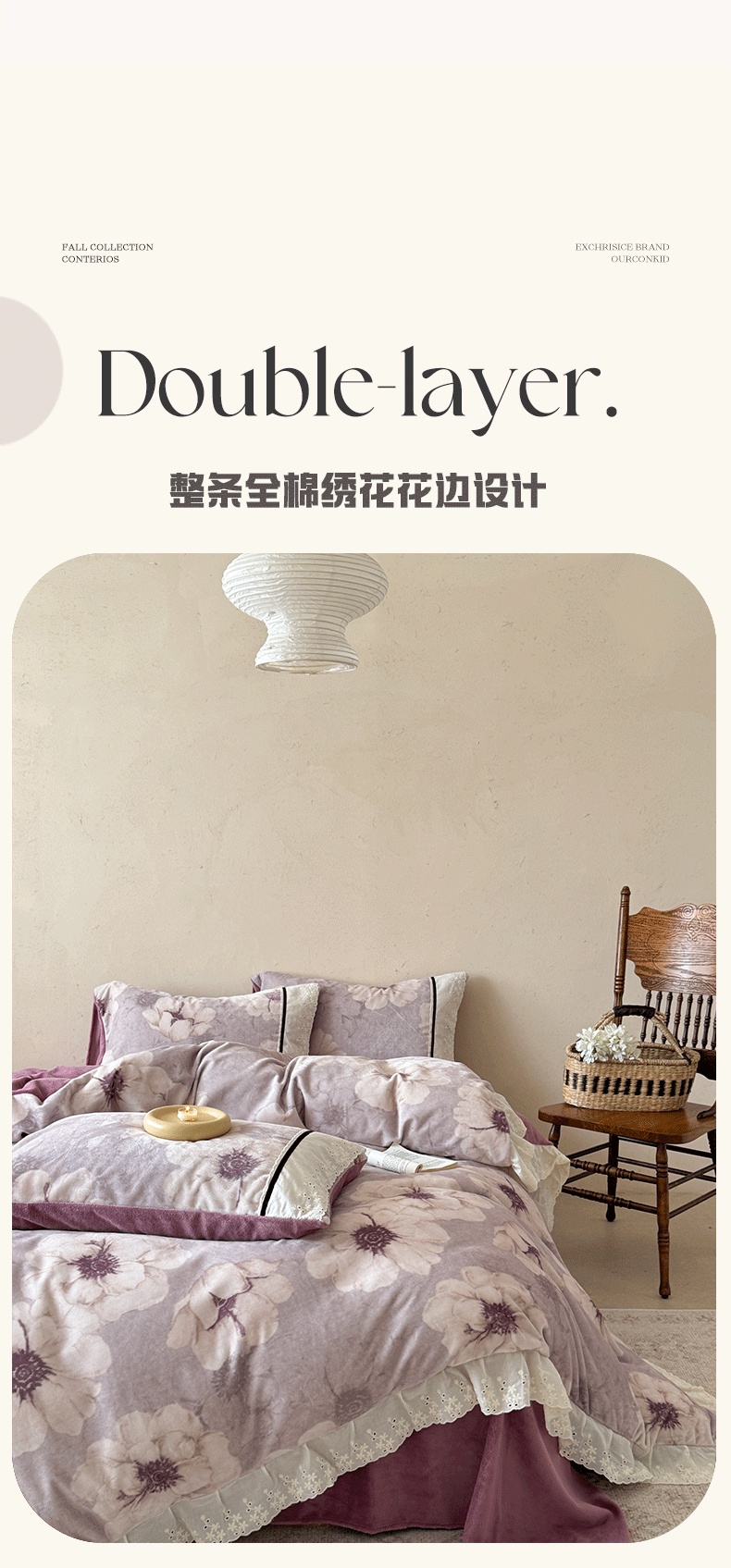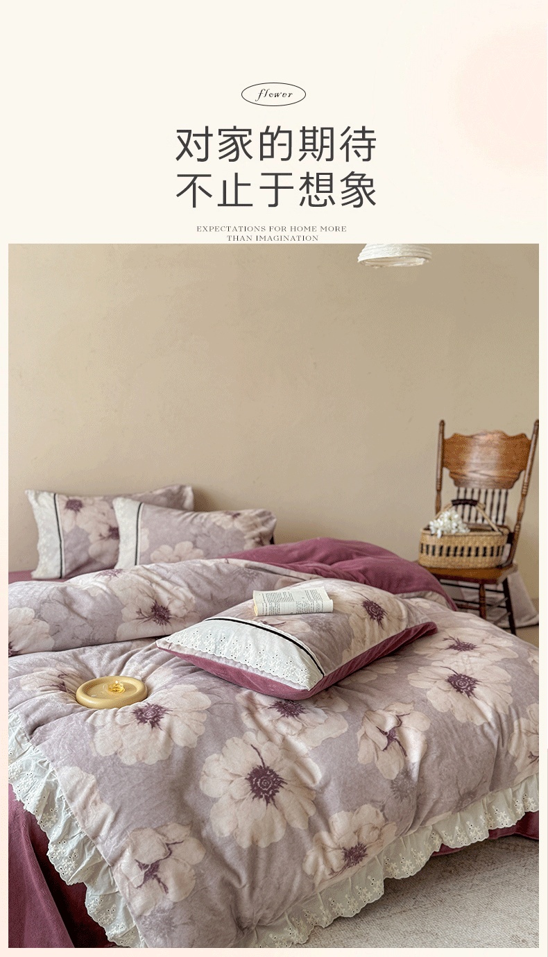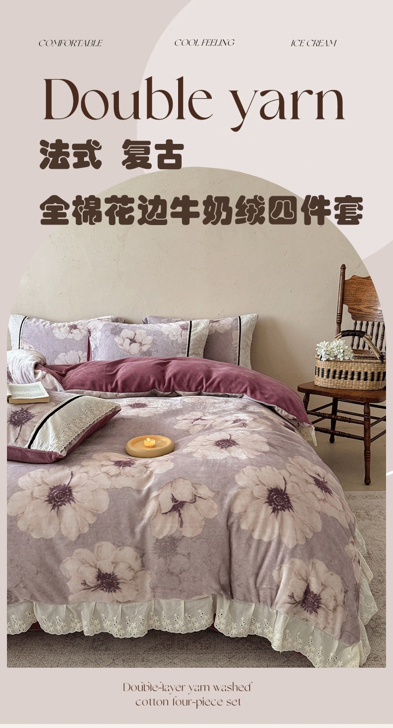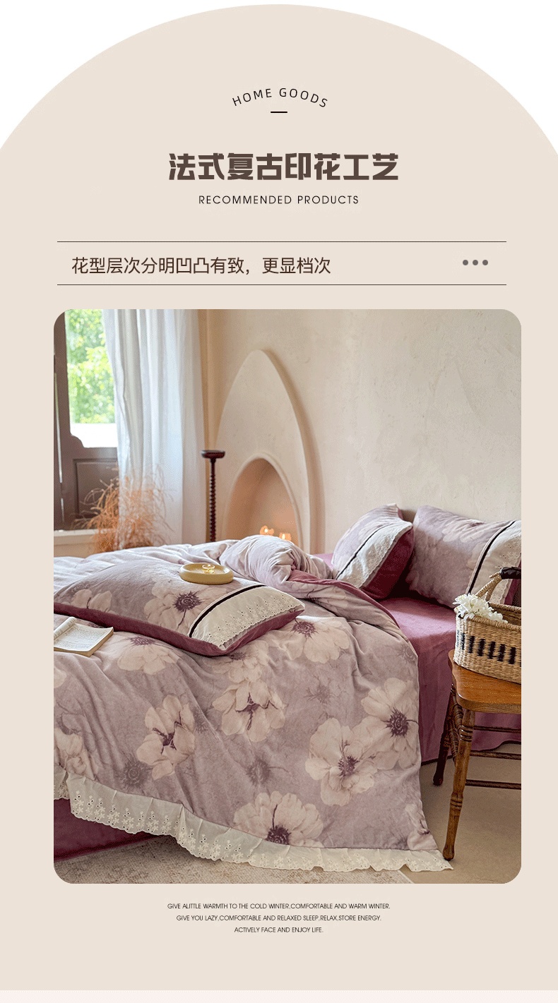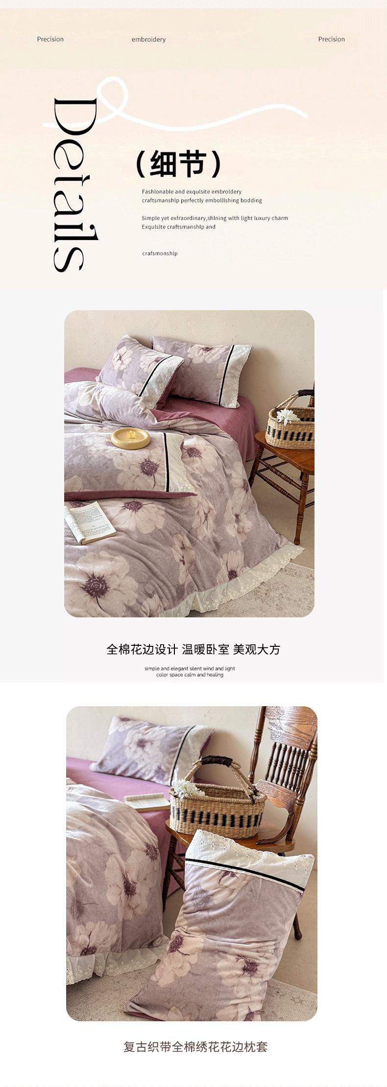 当前位置: 91家纺网 > 商品网购 > 床品套件 > 四件套 > 牛奶绒四件套 > 花漾家居 2025新款法式复古绣花花边款牛奶绒四件套 虞美人