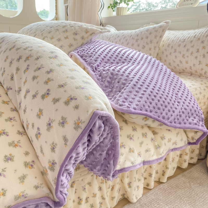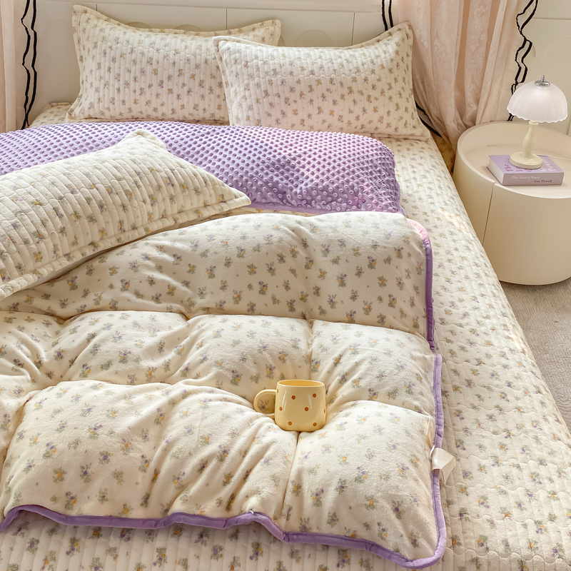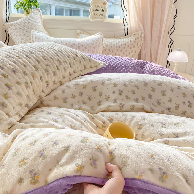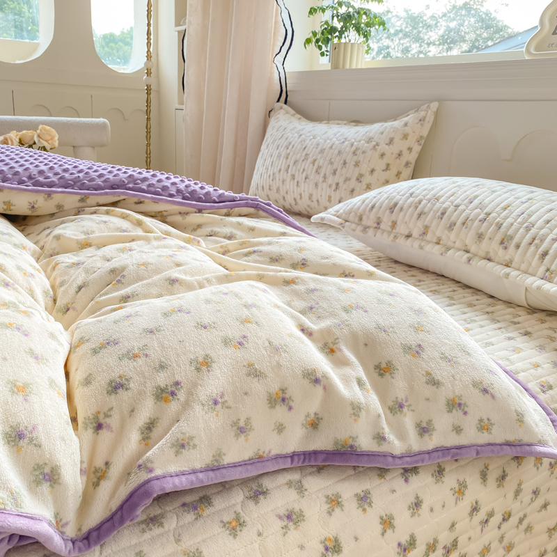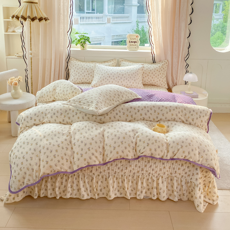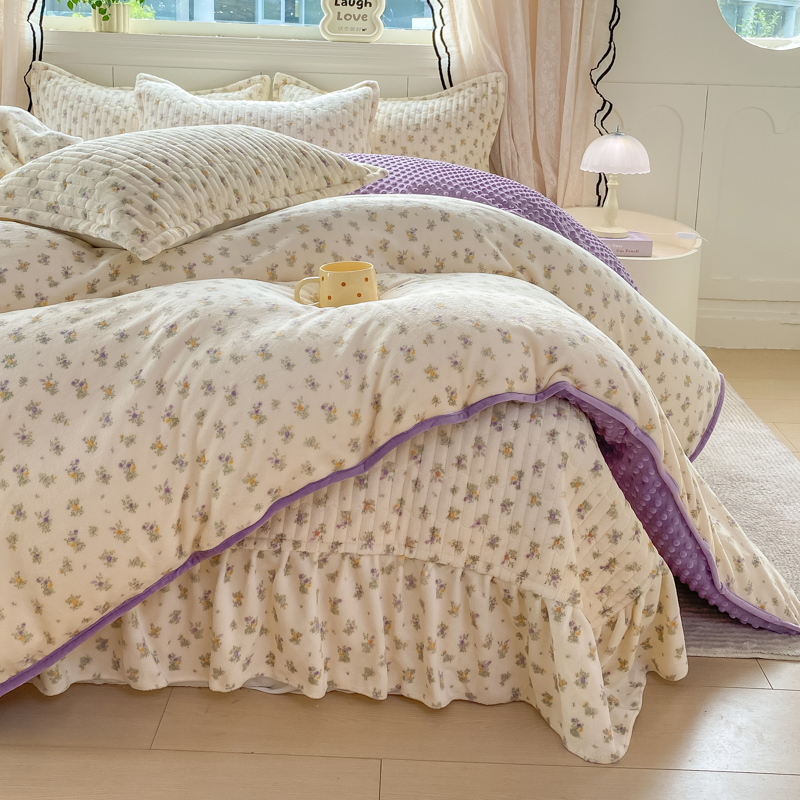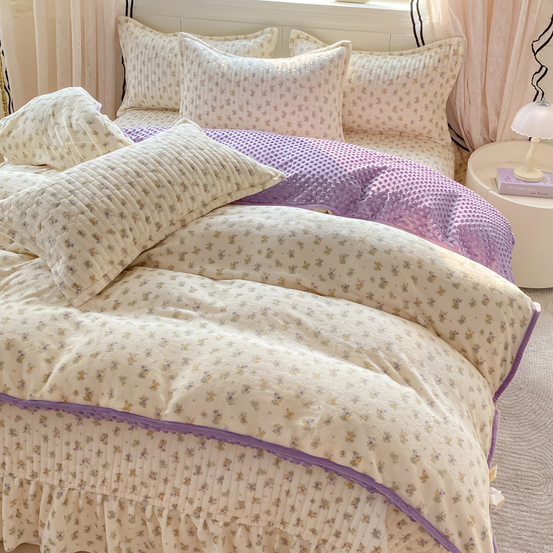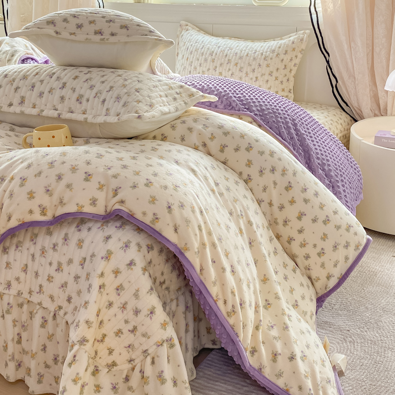 商品名称:尚美 2025新款豆豆绒牛奶绒大花边床盖四件套-系列2(床盖花边随机) 花紫
