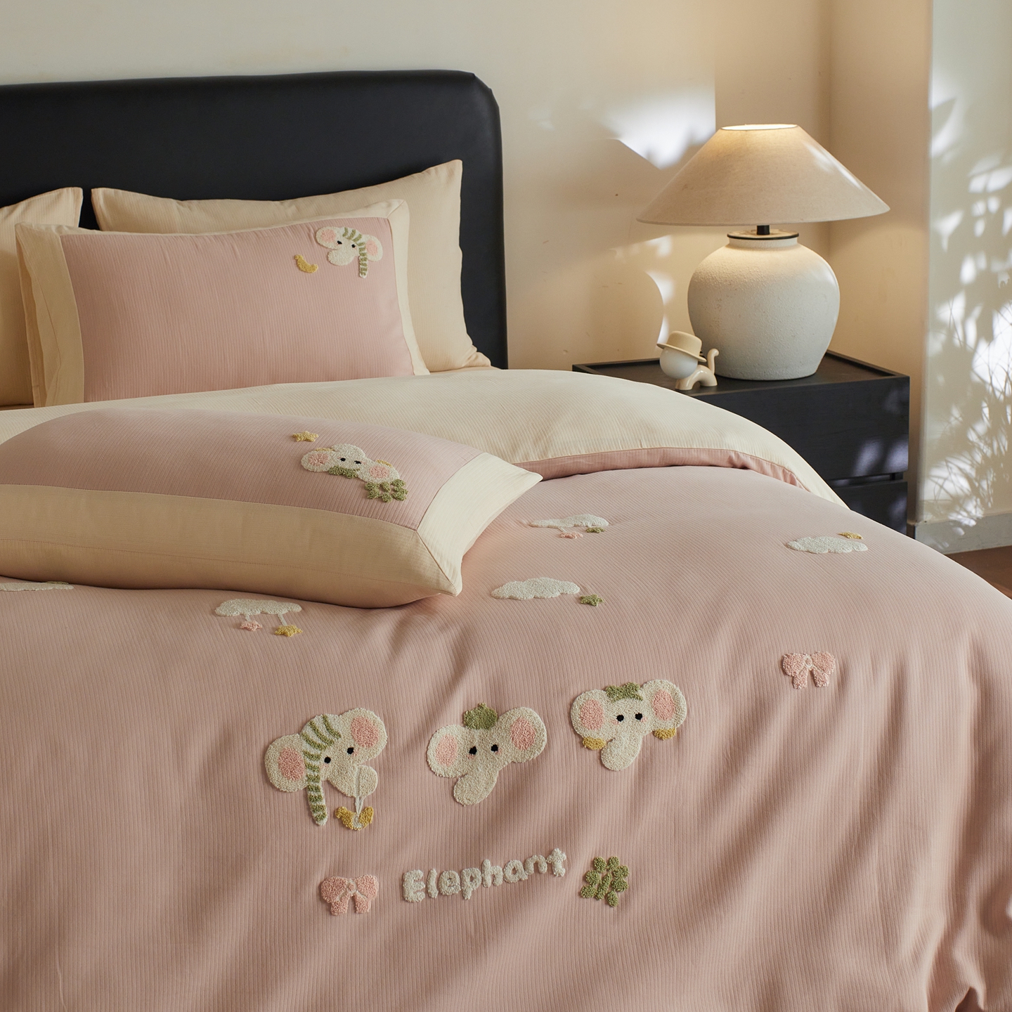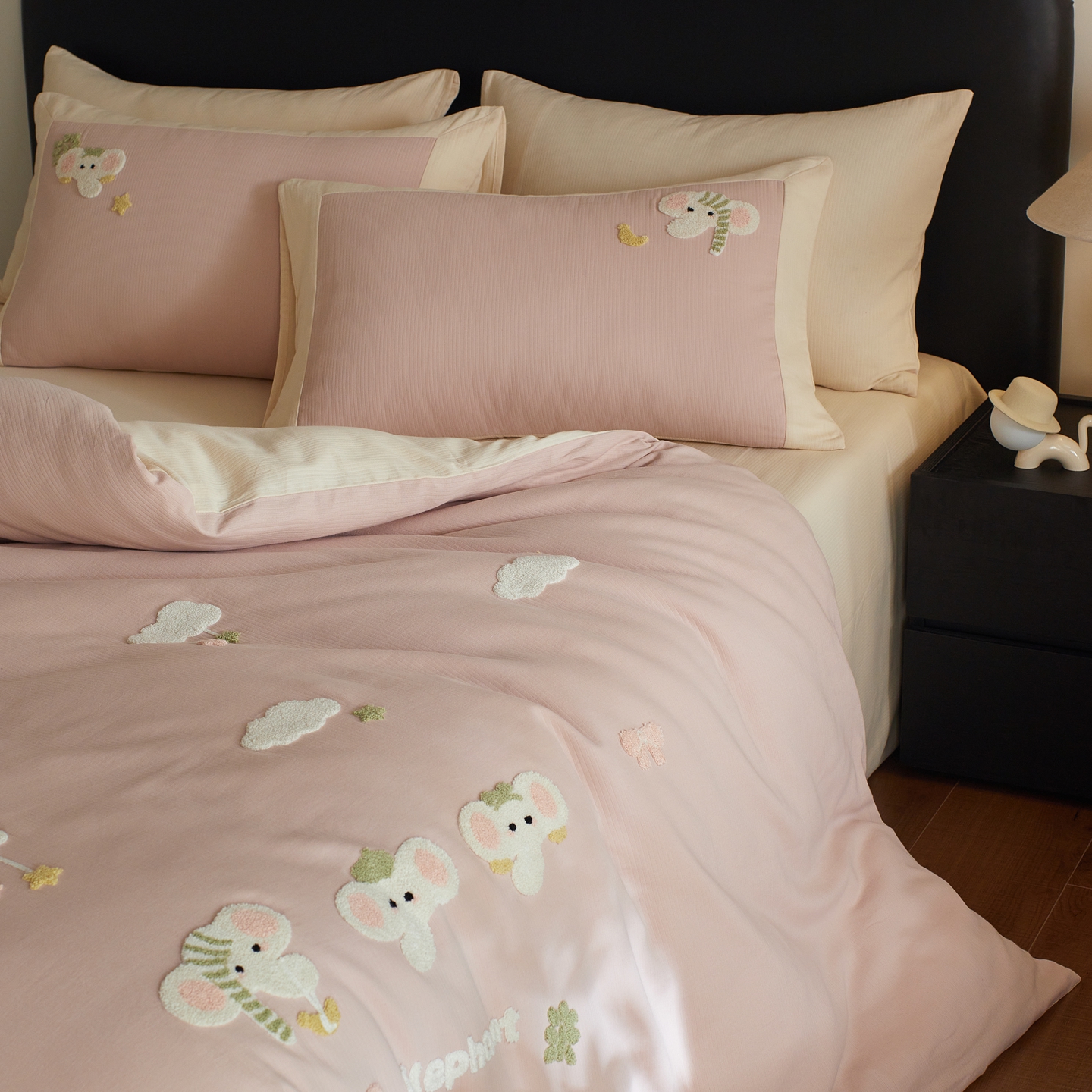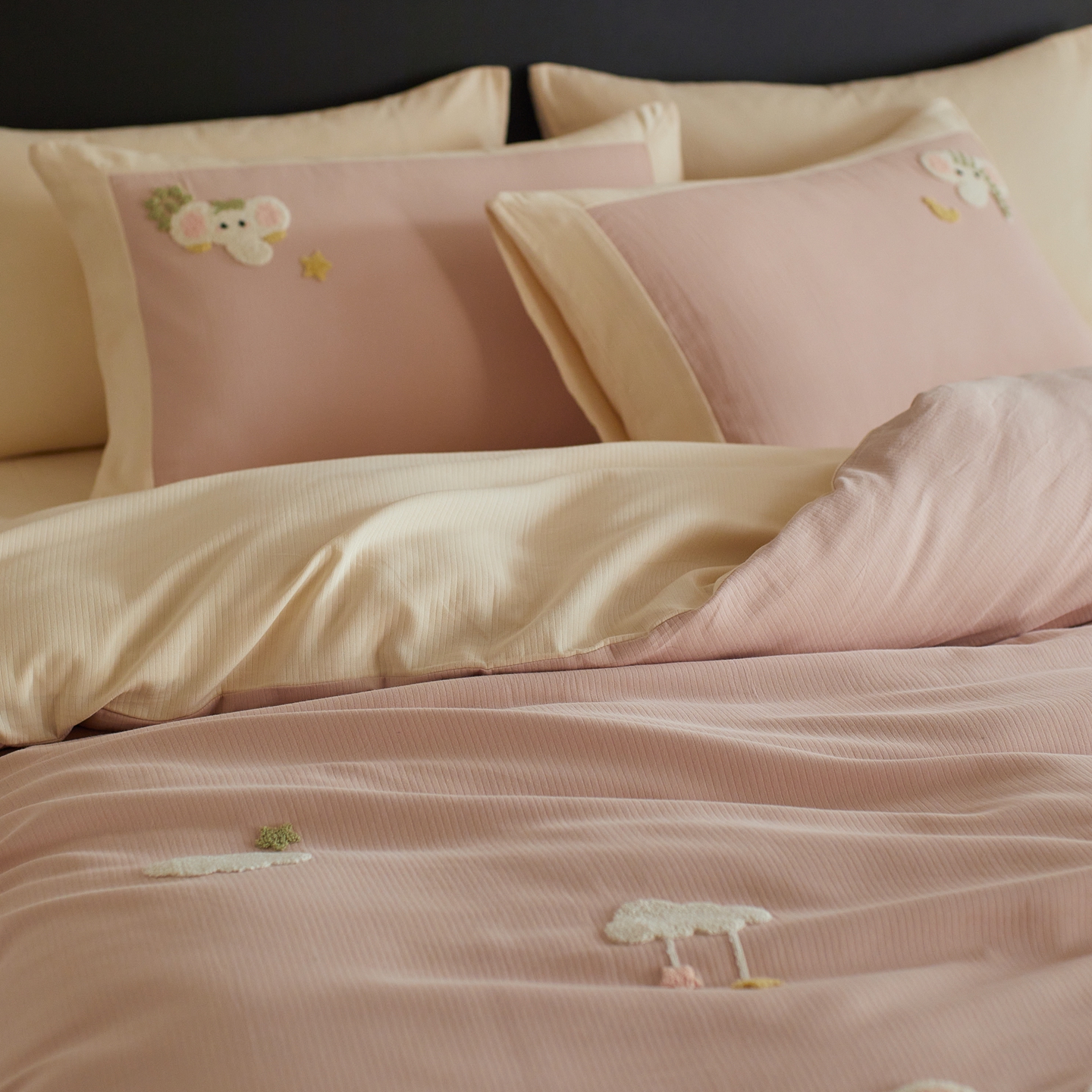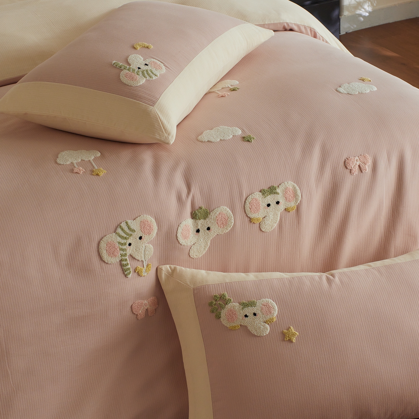 当前位置: 91家纺网 > 商品网购 > 床品套件 > 四件套 > 普通磨毛四件套 > 风向标家纺 2025新款透气软织提花磨毛卡通毛巾绣四件套-风格三 云朵小象