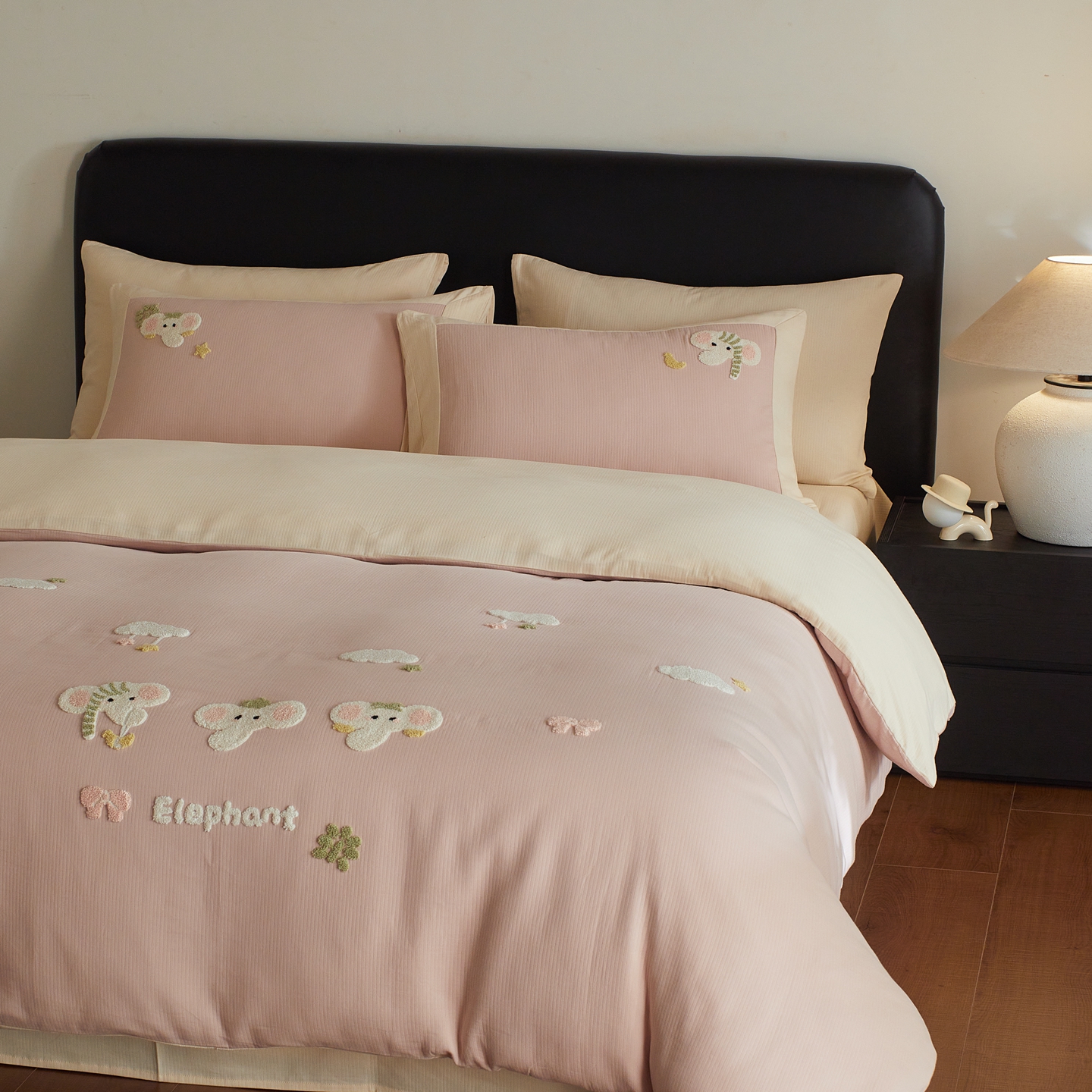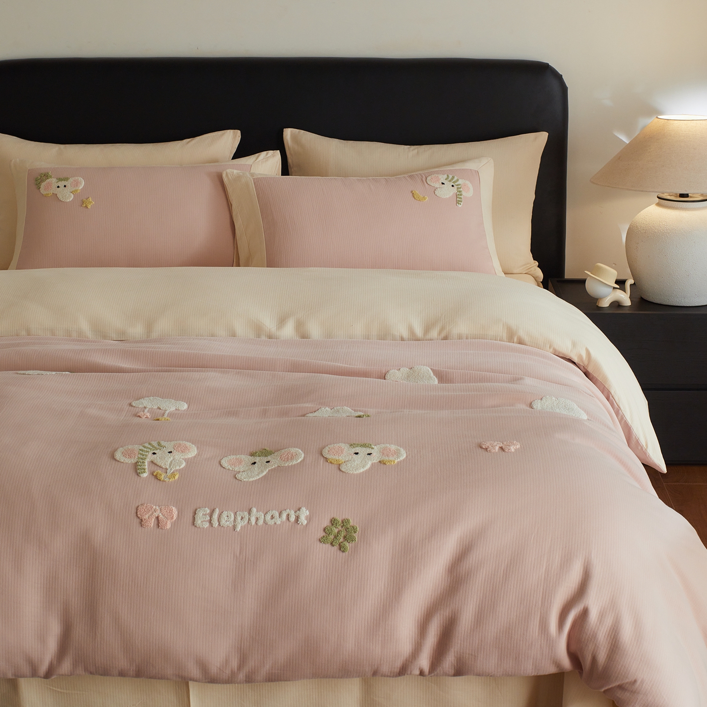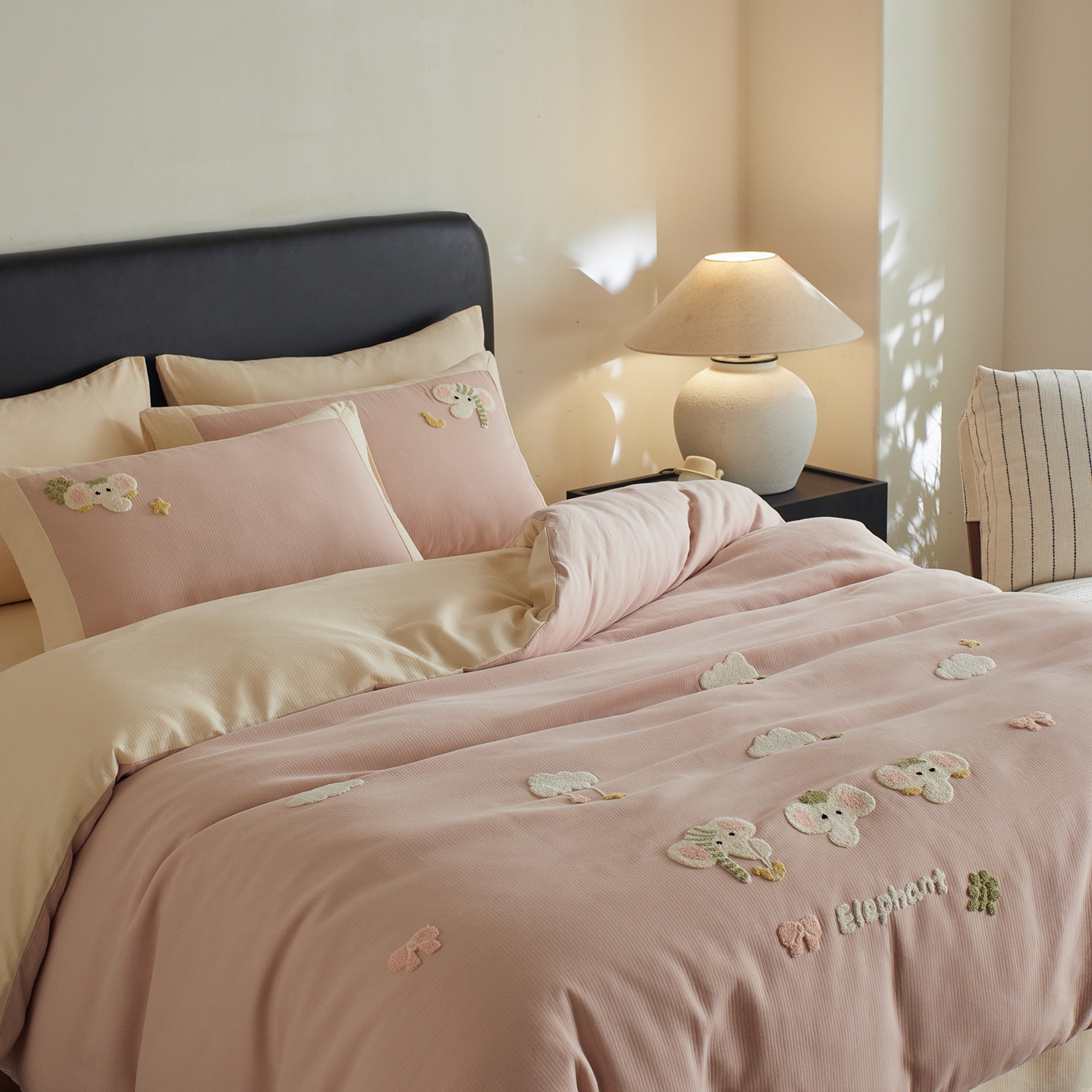 当前位置: 91家纺网 > 商品网购 > 床品套件 > 四件套 > 普通磨毛四件套 > 风向标家纺 2025新款透气软织提花磨毛卡通毛巾绣四件套-风格三 云朵小象