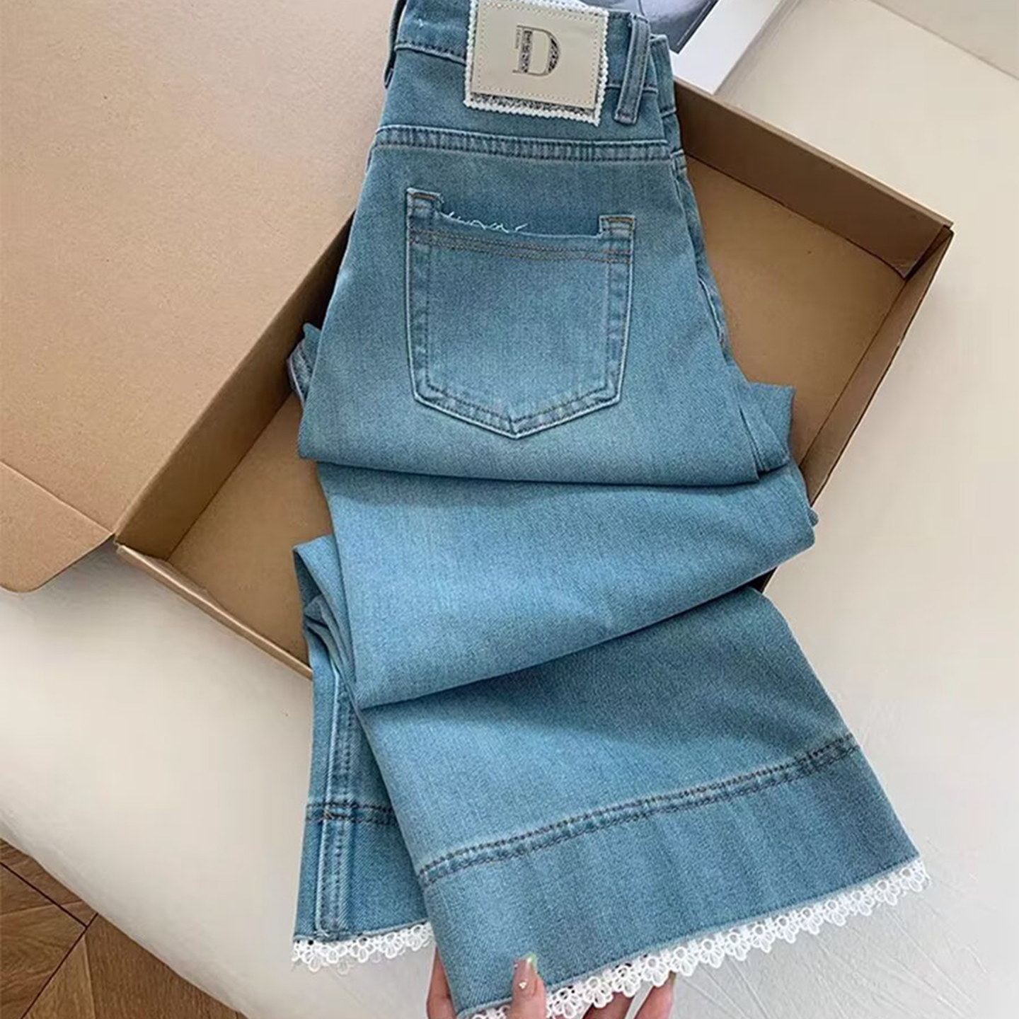 (总)洛兰沙家居馆【只代发】【只代发】 2025新款蕾丝花边直筒牛仔裤女夏薄款小个子九分裤大码胖mm显瘦浅色阔腿牛仔裤5