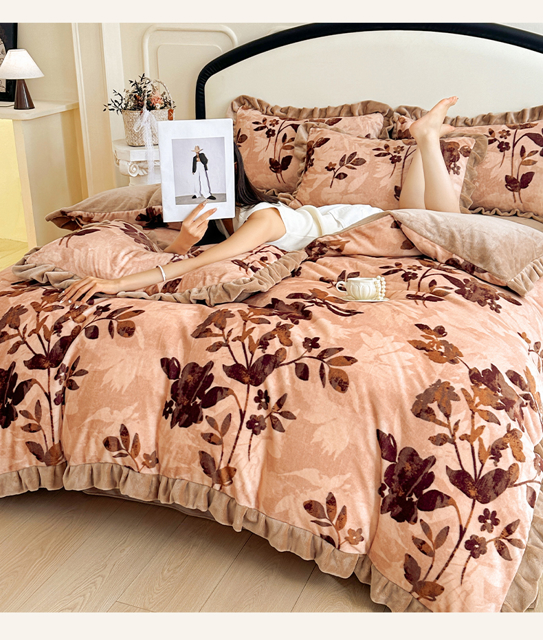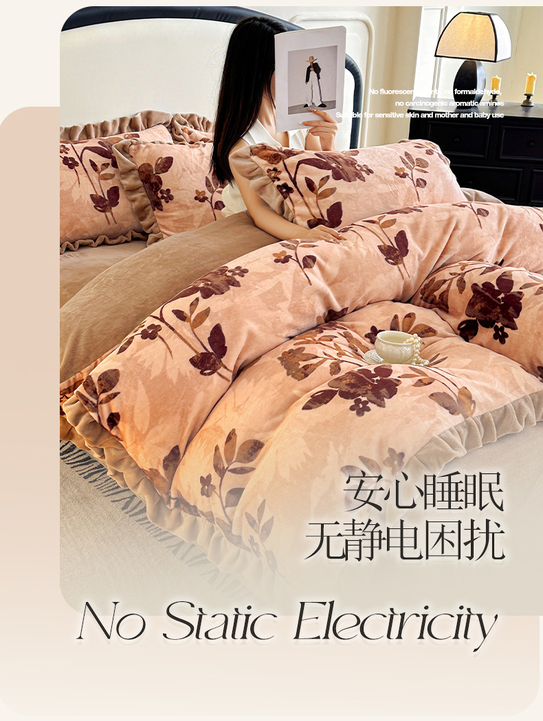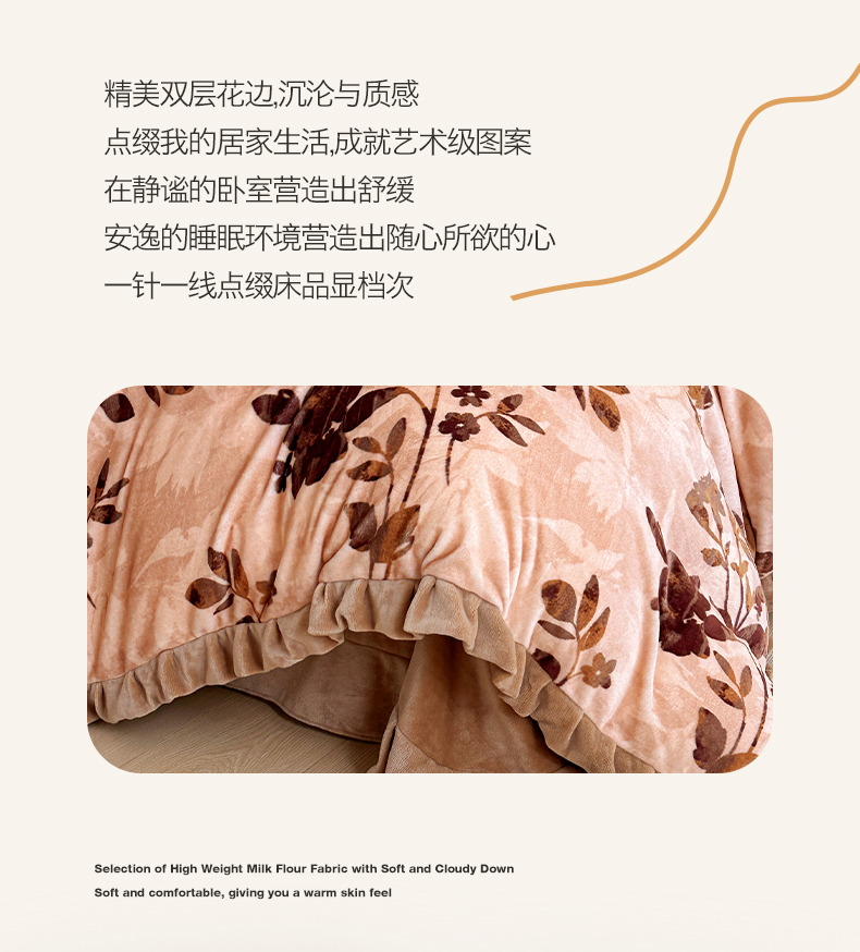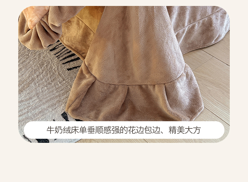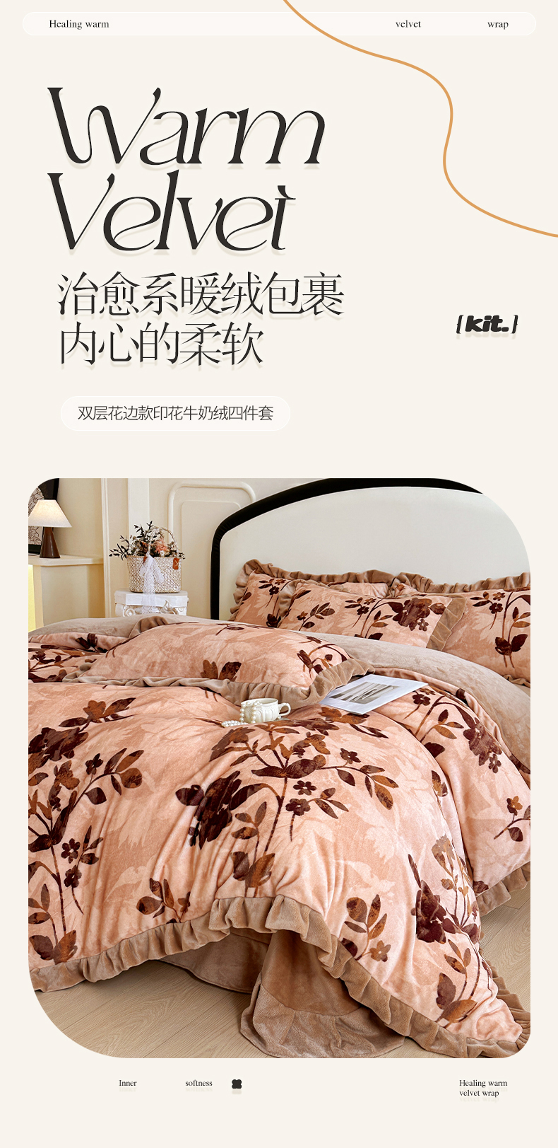 绘萱家居 2025新款爆款高密消光双层花边牛奶绒四件套印花 美拉德