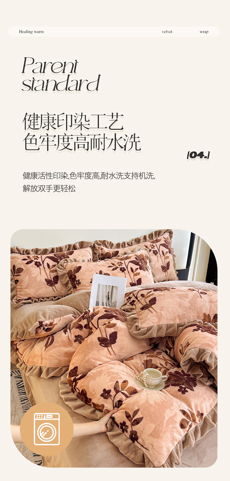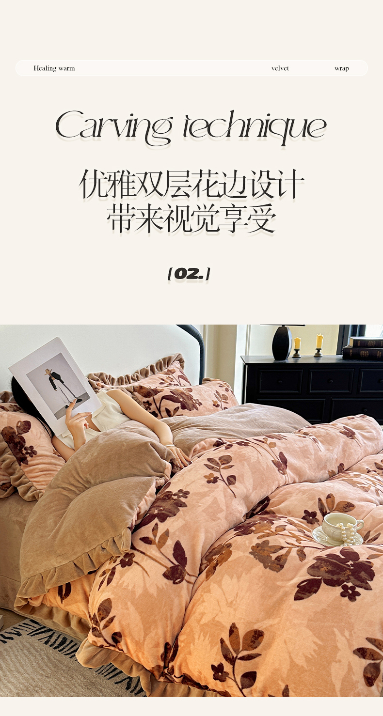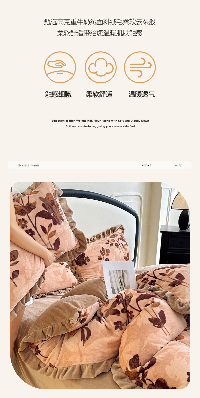 商品名称:绘萱家居 2025新款爆款高密消光双层花边牛奶绒四件套印花 美拉德