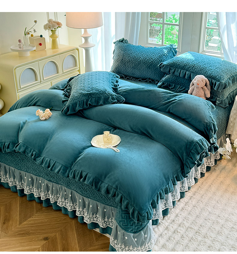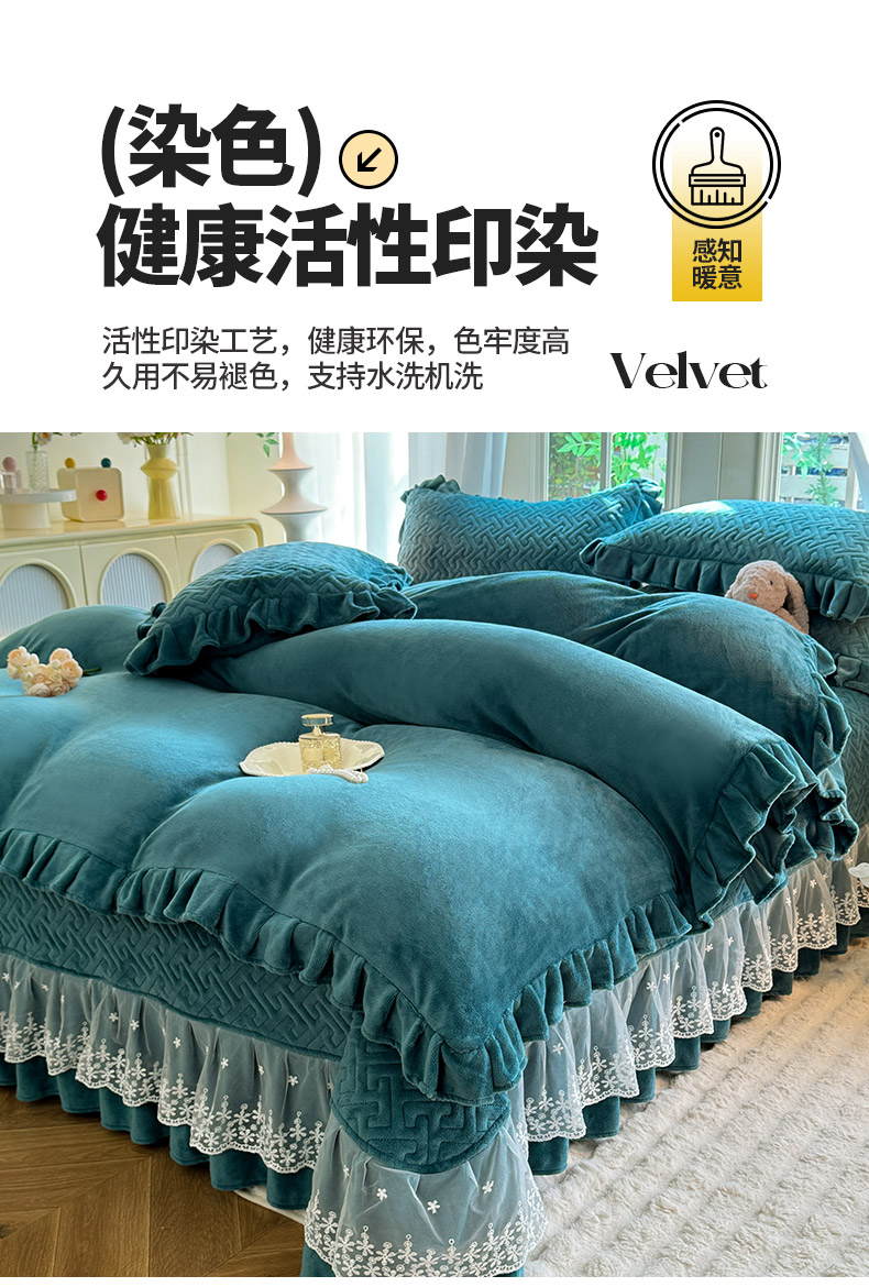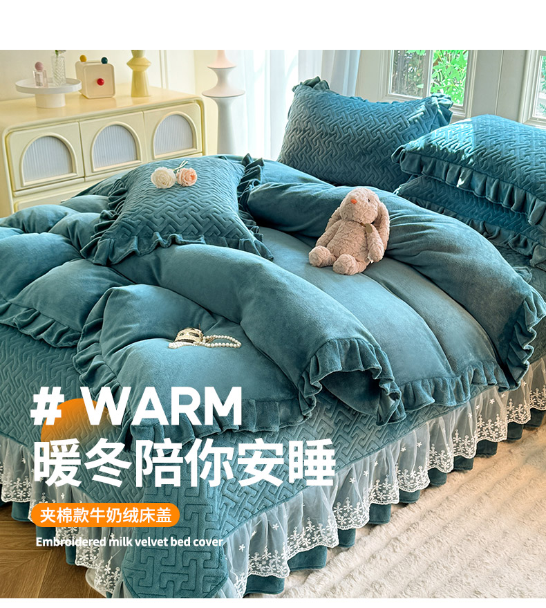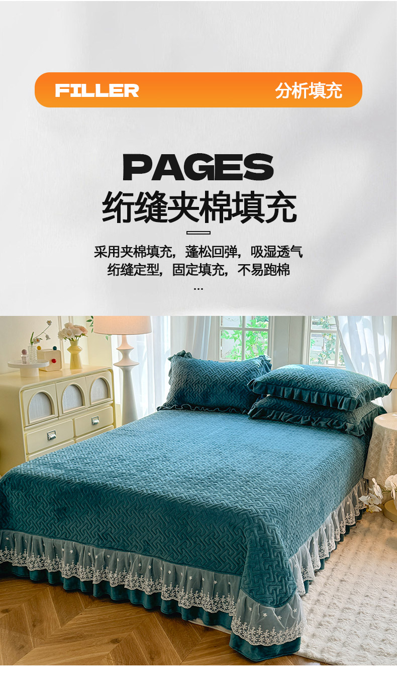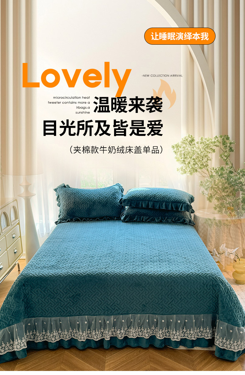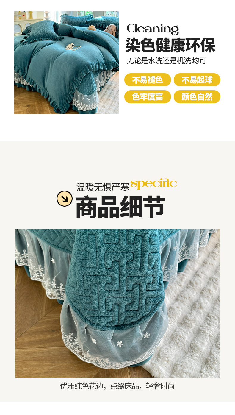 商品名称:优家居 2025秋冬高克重牛奶绒床盖夹棉床裙纯色蕾丝边花边刺绣法式公主风床罩夹棉床盖 灰湖绿