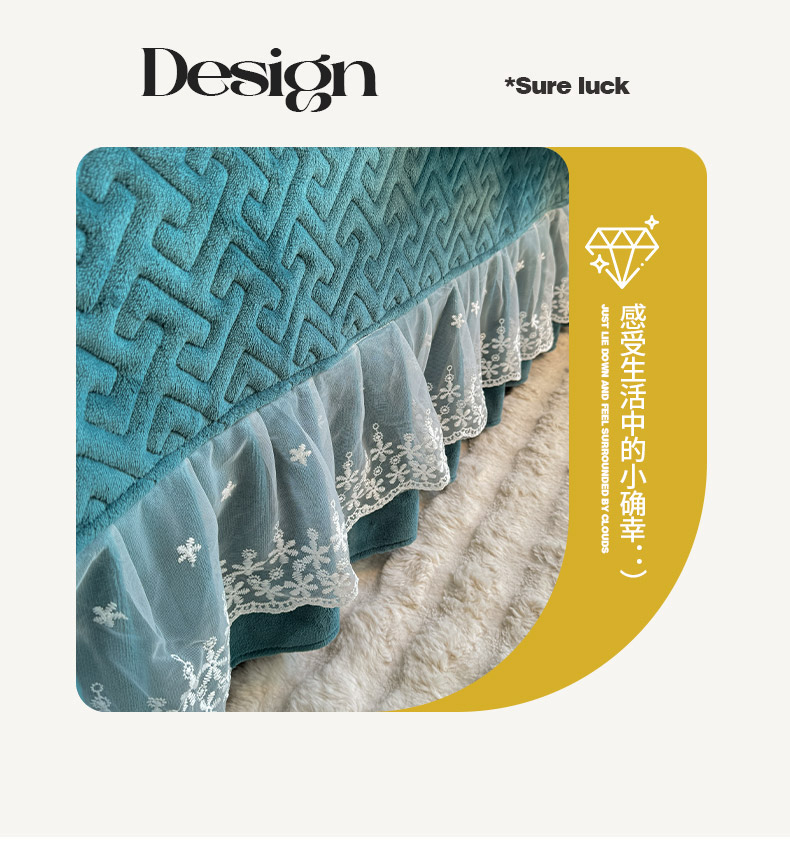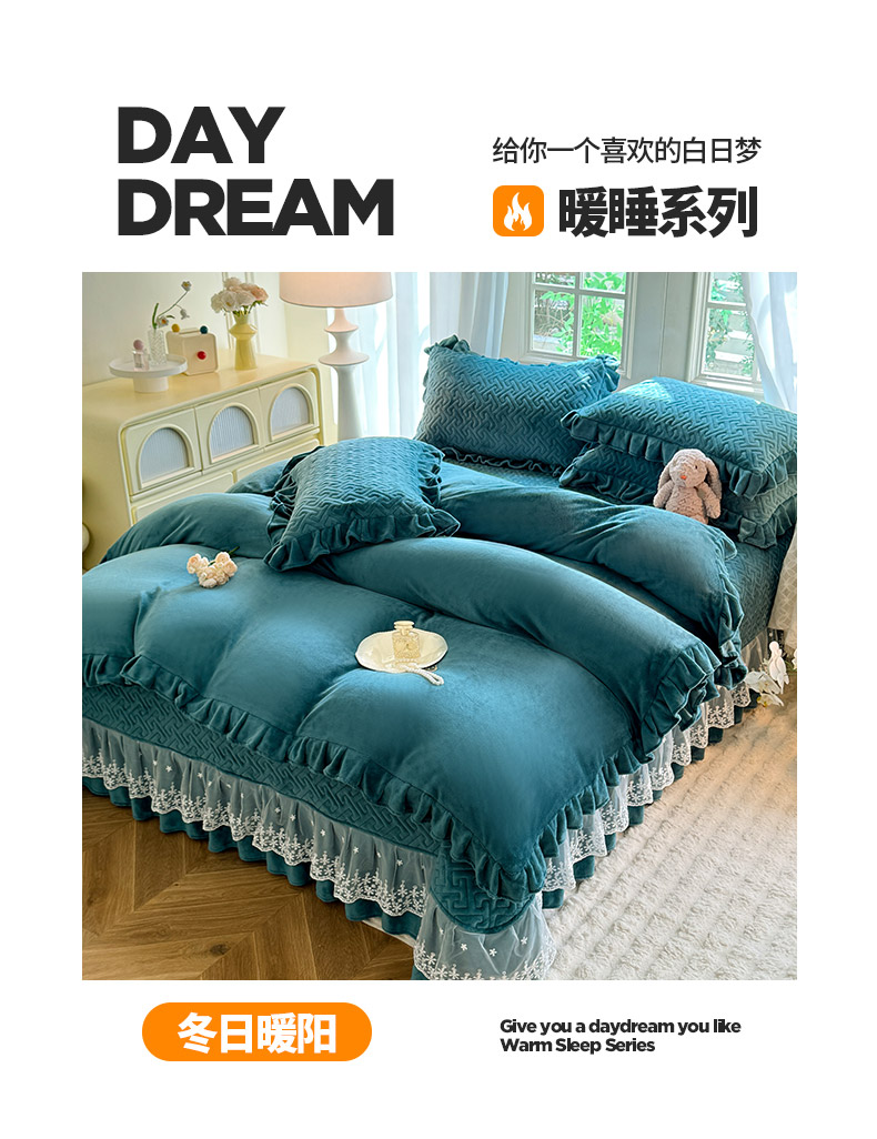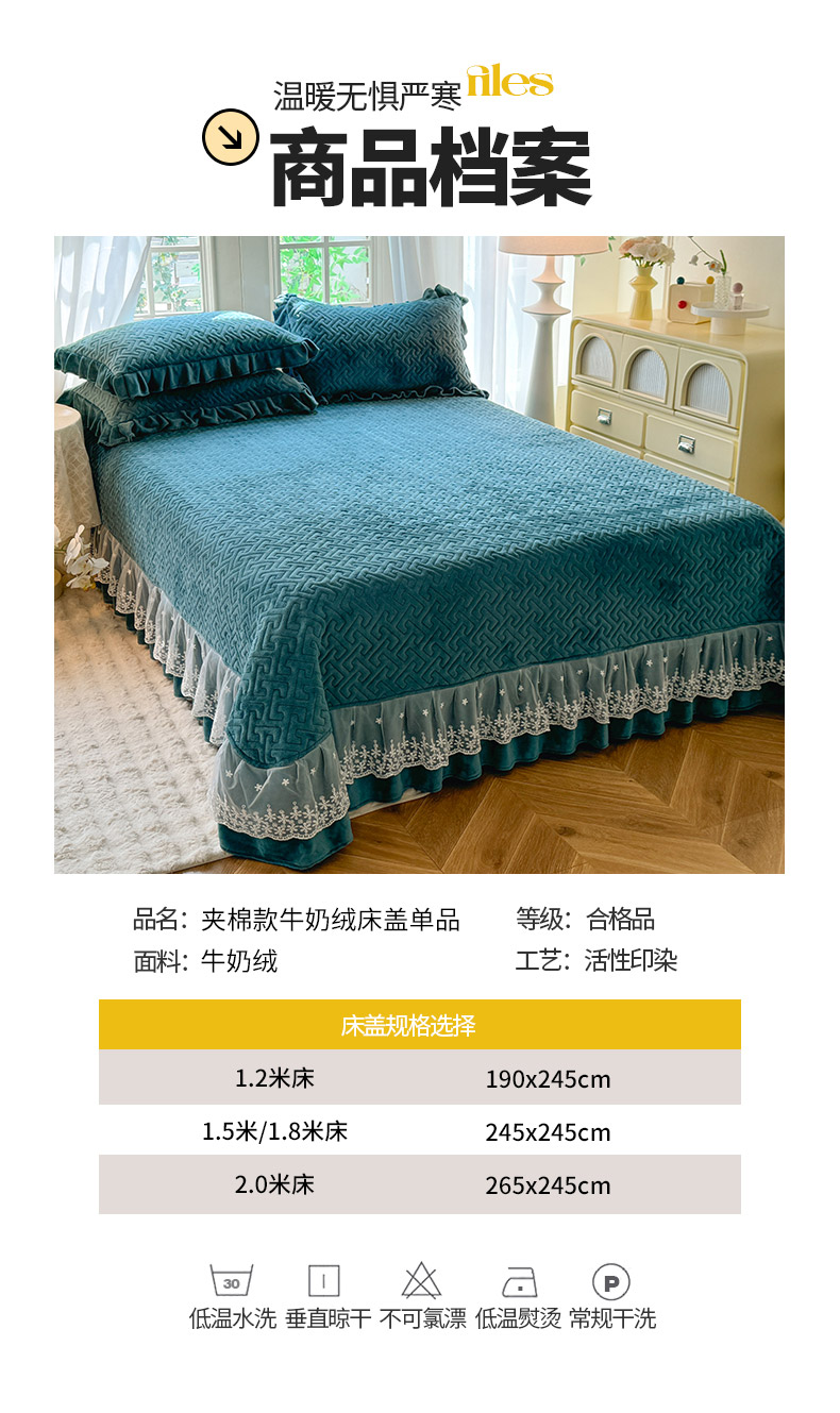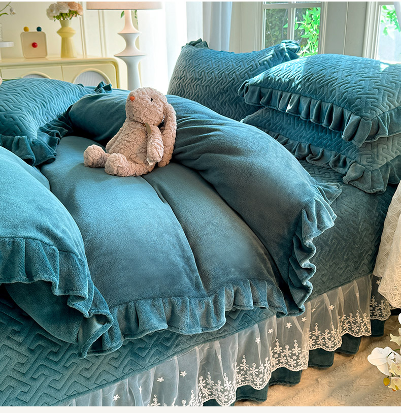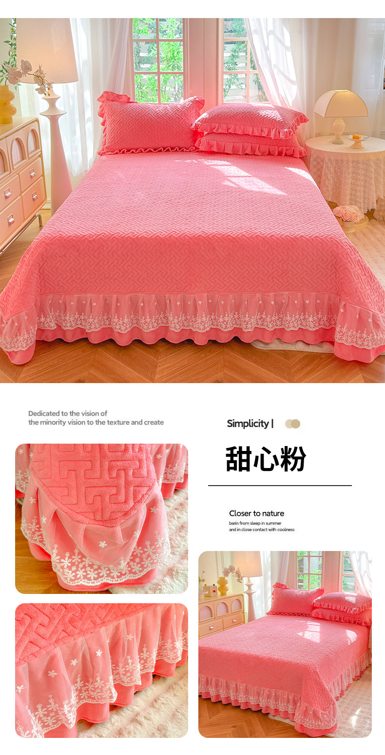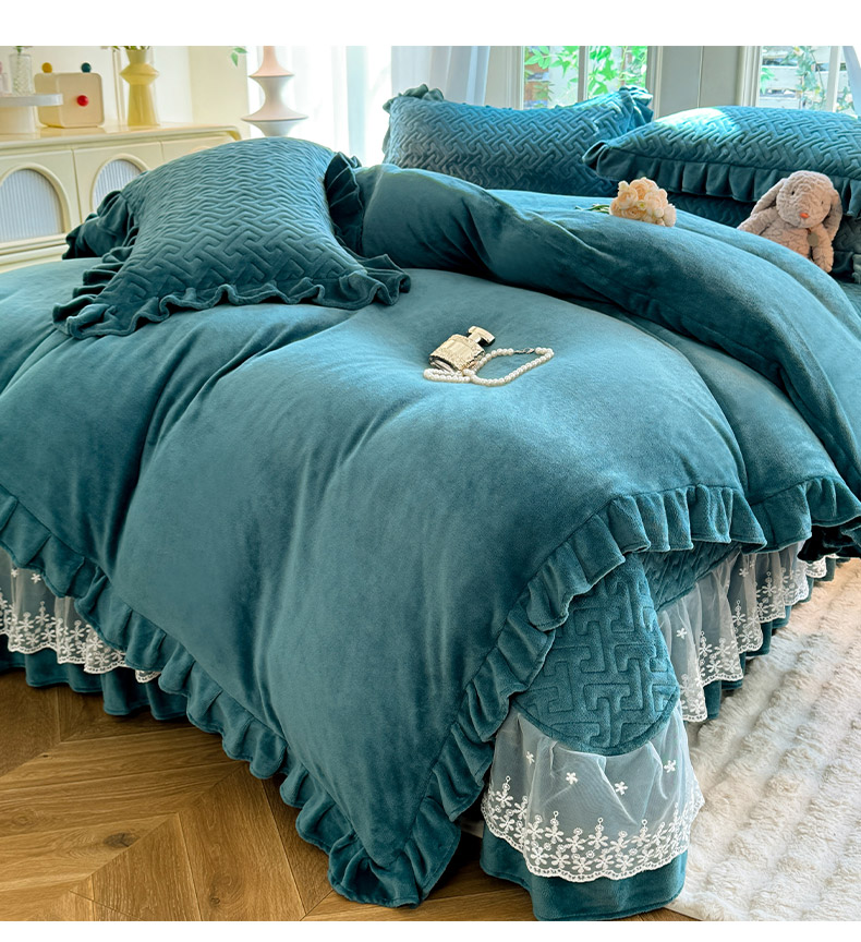 商品名称:优家居 2025秋冬高克重牛奶绒床盖夹棉床裙纯色蕾丝边花边刺绣法式公主风床罩夹棉床盖 灰湖绿