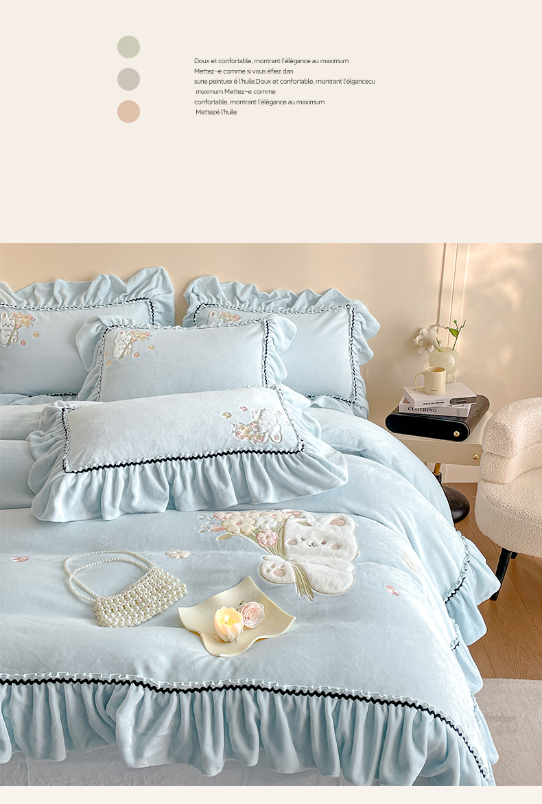 畅畅家纺 2025新款轻奢高档冬季工艺款牛奶绒毛巾绣床单床笠四件套 梦境-浅蓝