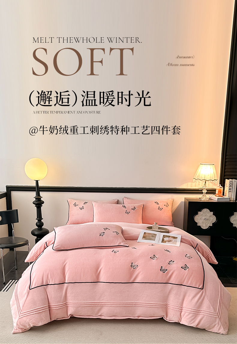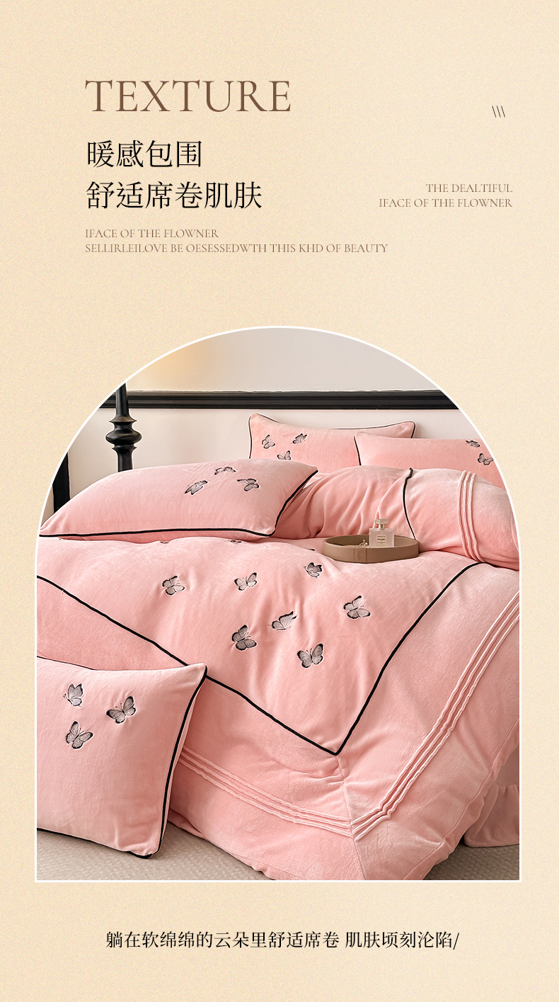 当前位置: 91家纺网 > 商品网购 > 床品套件 > 四件套 > 牛奶绒四件套 > 凯美家居 2025新款牛奶绒重工刺绣特种工艺四件套-可露丽 可露丽-粉玉