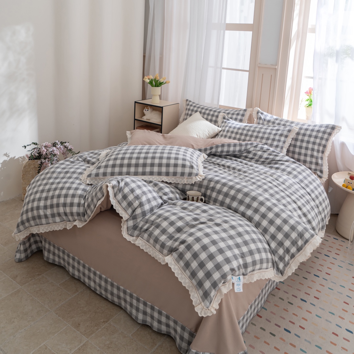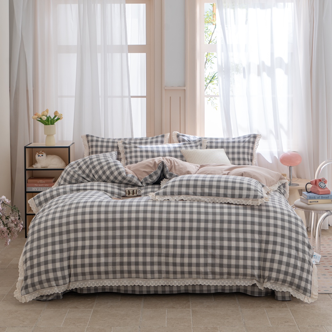 玖琳家纺 2025新款云朵水洗棉皱皱纱精致花边款四件套 森系格韵