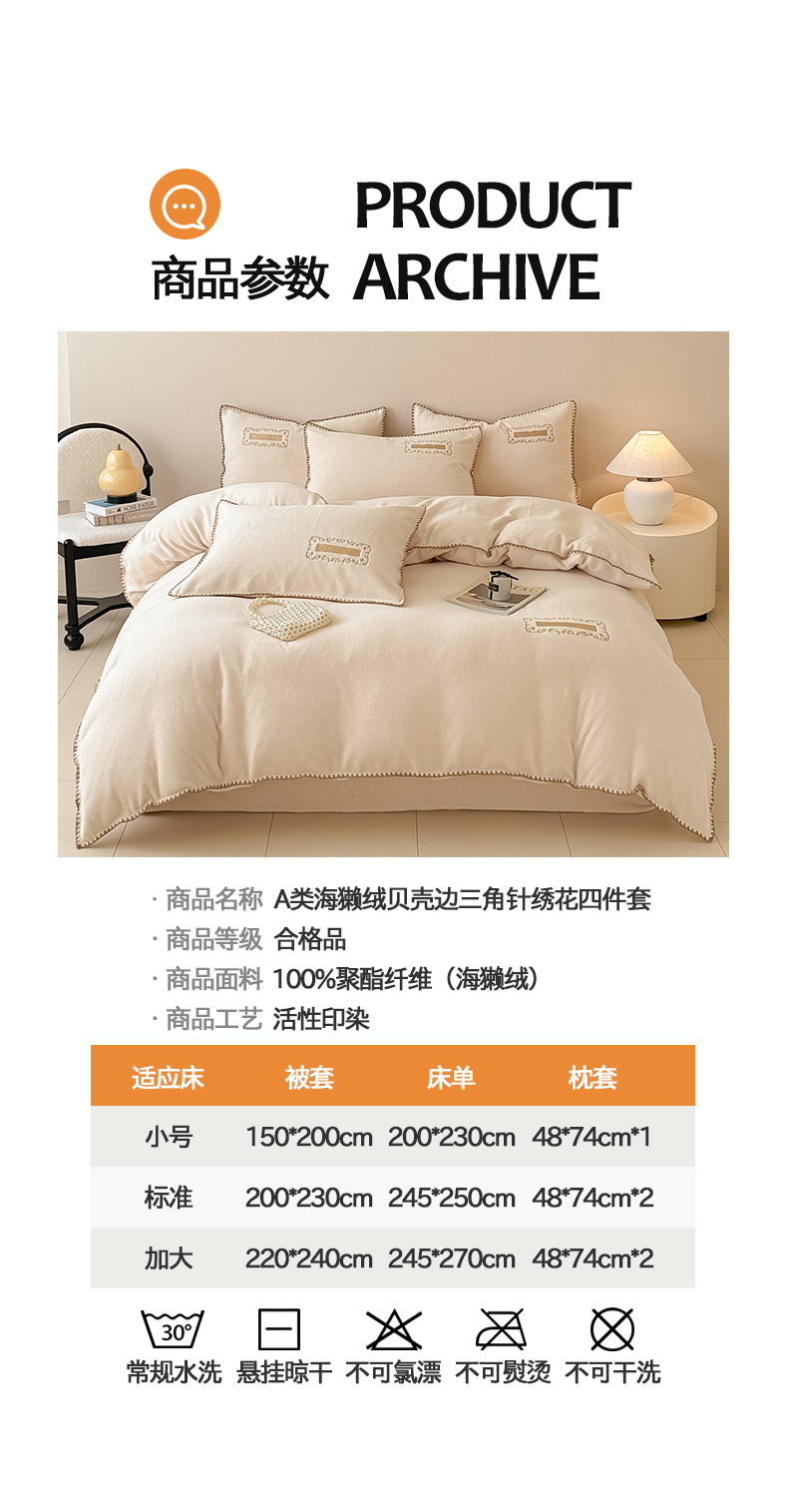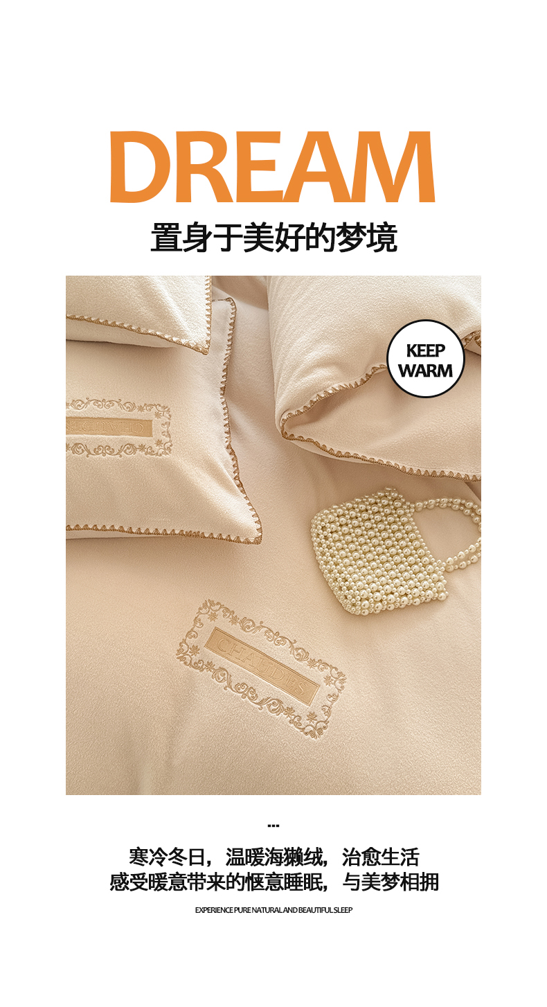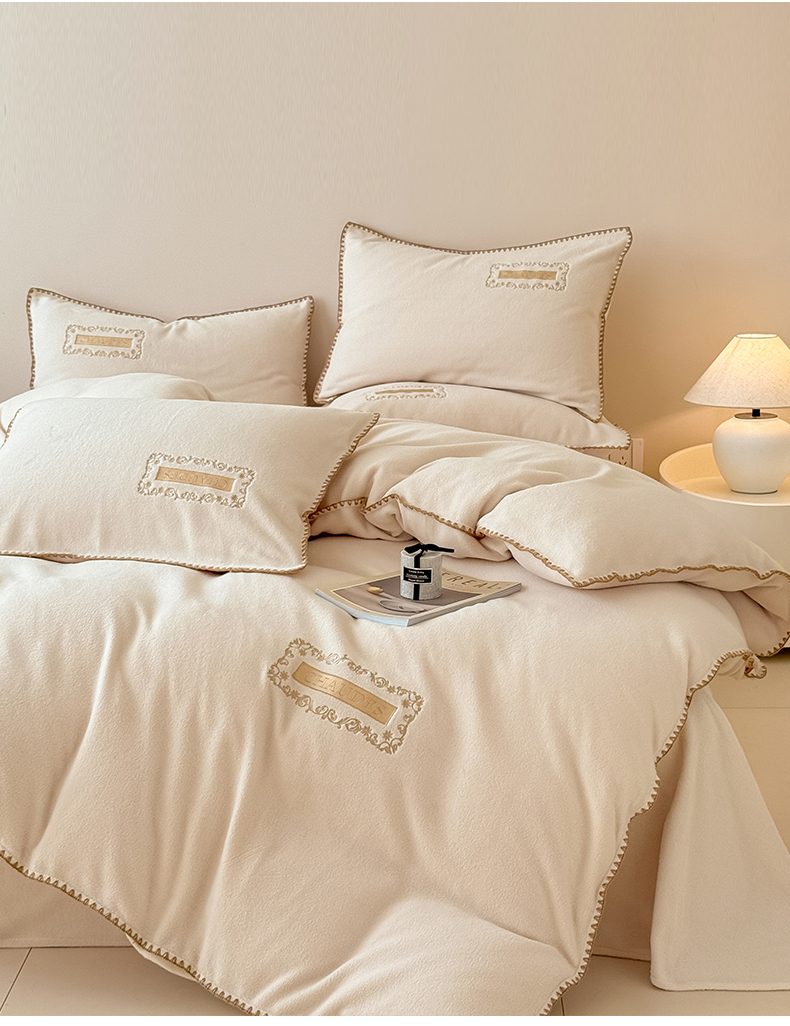 当前位置: 91家纺网 > 商品网购 > 床品套件 > 四件套 > 其它四件套 > 典曼家纺 2025新款A类贝壳绣纯色海獭绒四件套 杏仁白