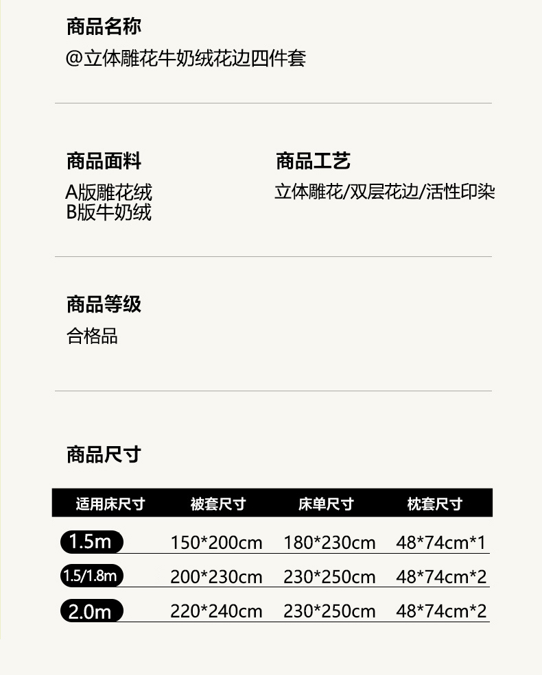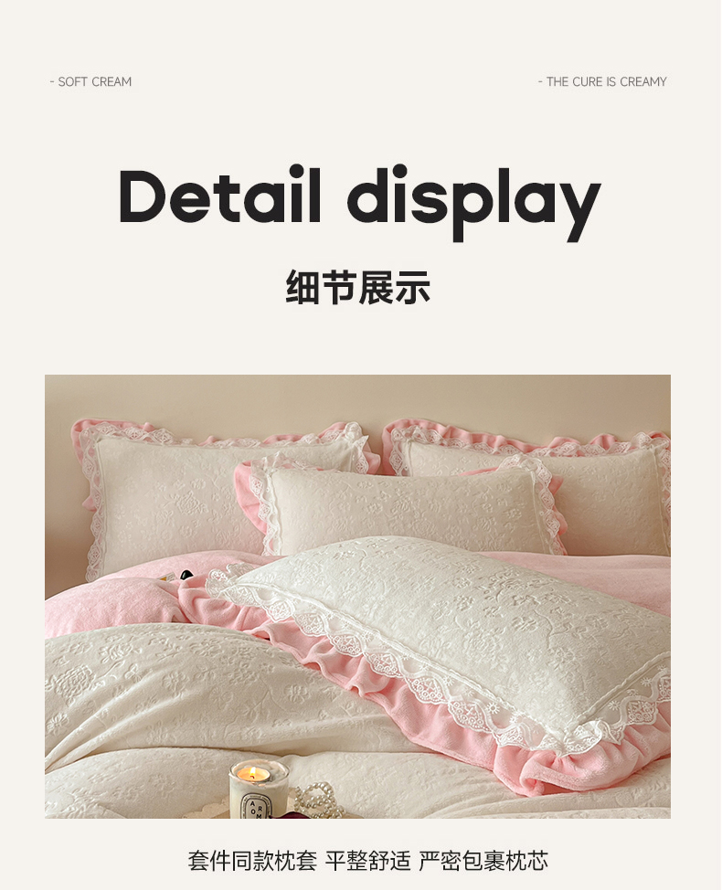 商品名称:逸尚阁 2025新款立体雕花牛奶绒花边款四件套--塔丽娜系列 塔丽娜-奶白粉