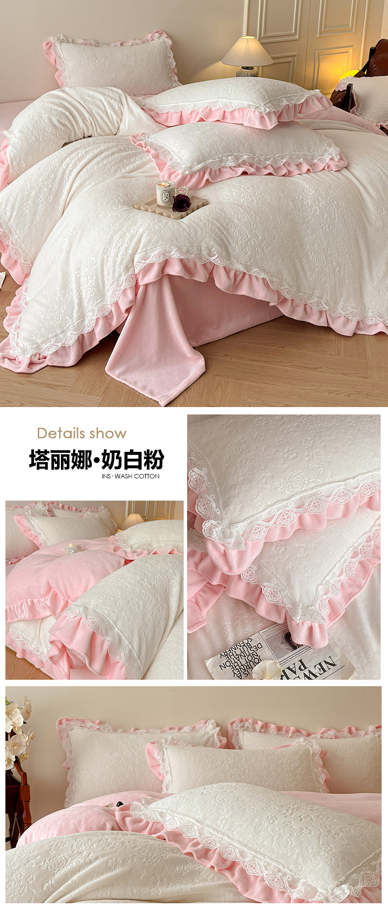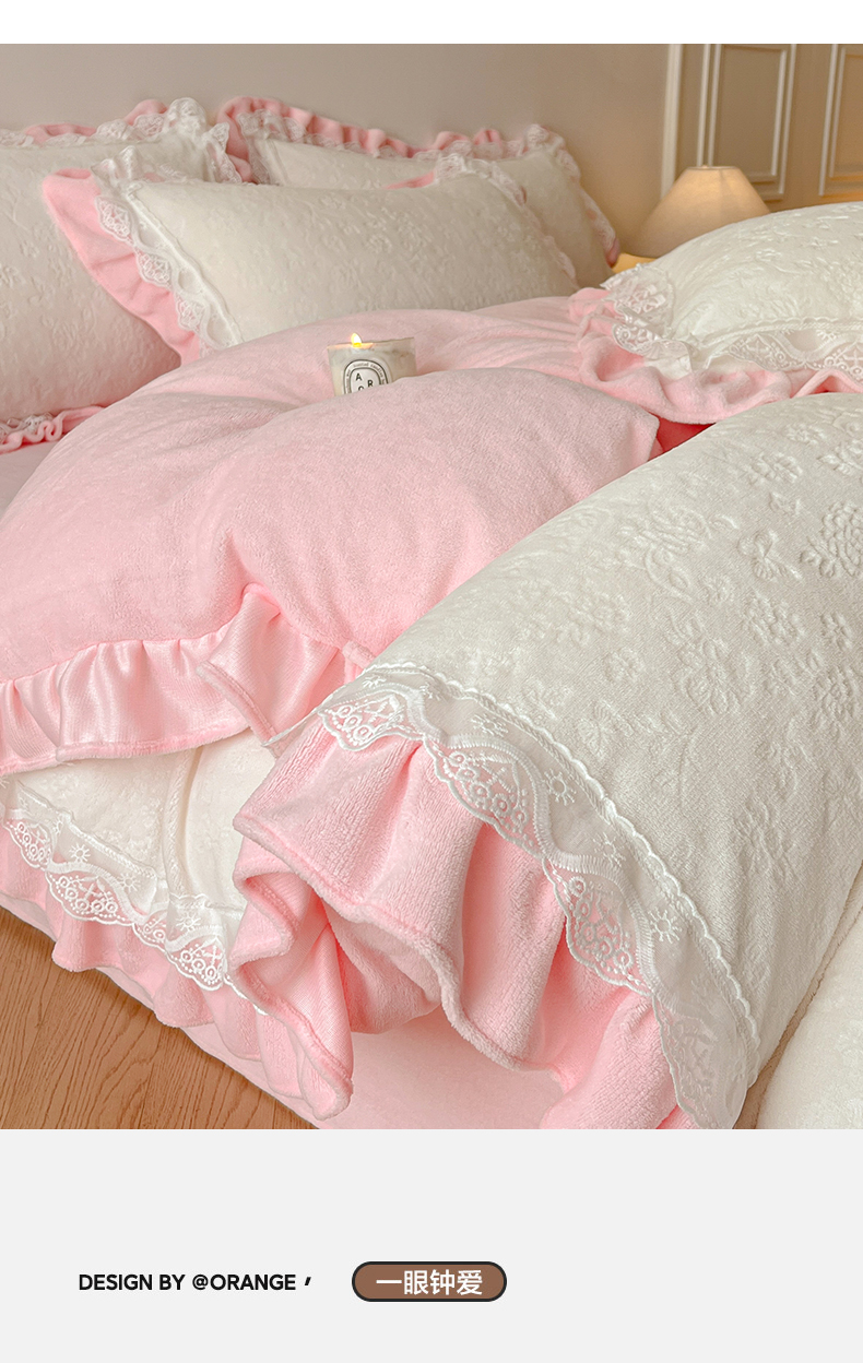逸尚阁 2025新款立体雕花牛奶绒花边款四件套--塔丽娜系列 塔丽娜-奶白粉