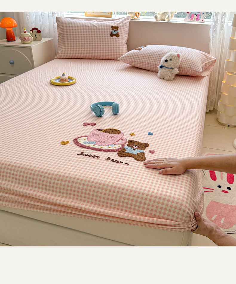 慕尚家纺 2025新款全棉磨毛毛巾绣单床笠 床笠单件 茶杯小熊