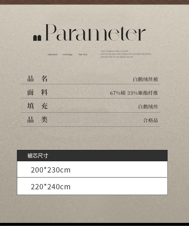 白鹅绒丝 200-230 填充1100克 春秋被 | ¥645.00 |