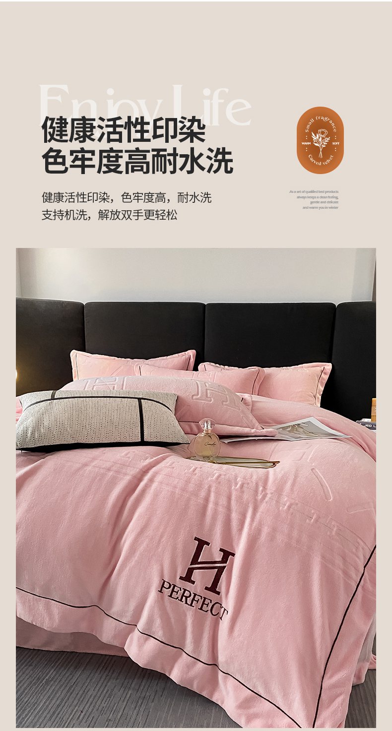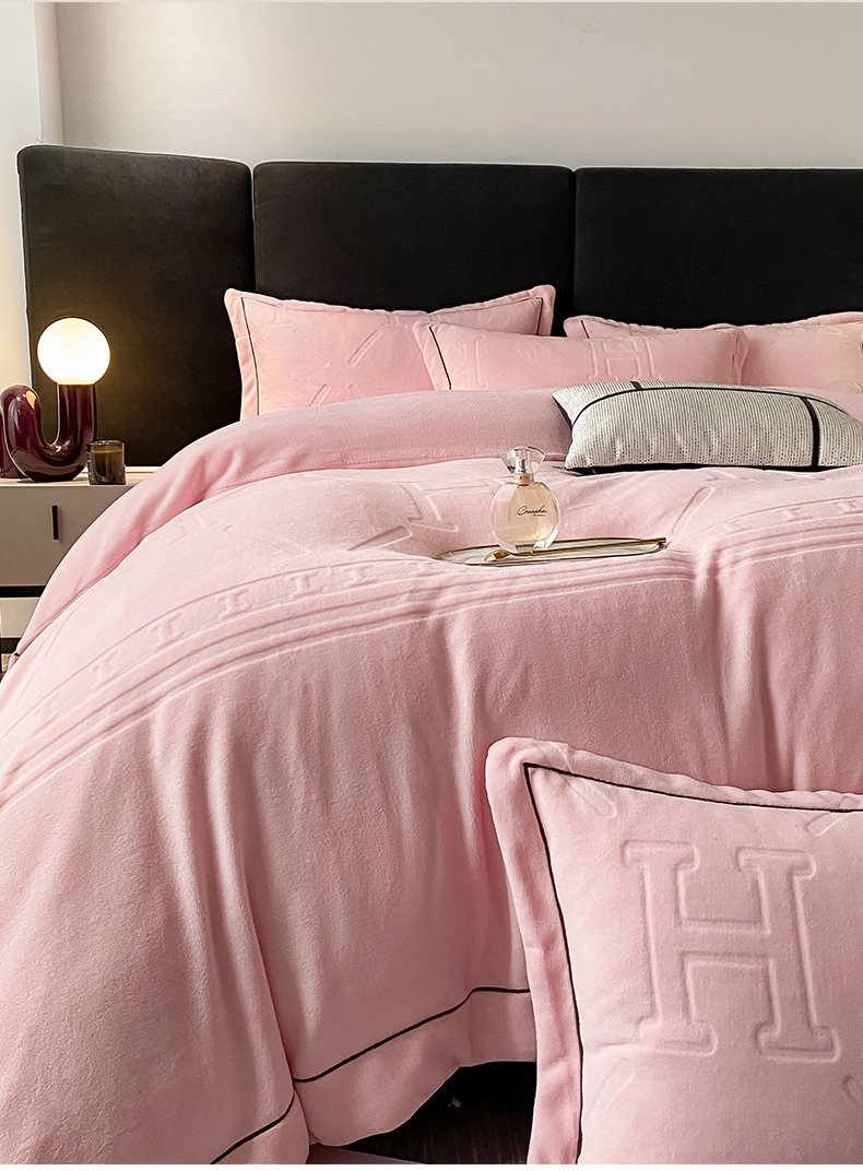 当前位置: 91家纺网 > 商品网购 > 床品套件 > 四件套 > 牛奶绒四件套 > 艾佳 2025新款A类全高克重雕花烂花刺绣牛奶绒四件套-小H系列 小H蜜桃粉