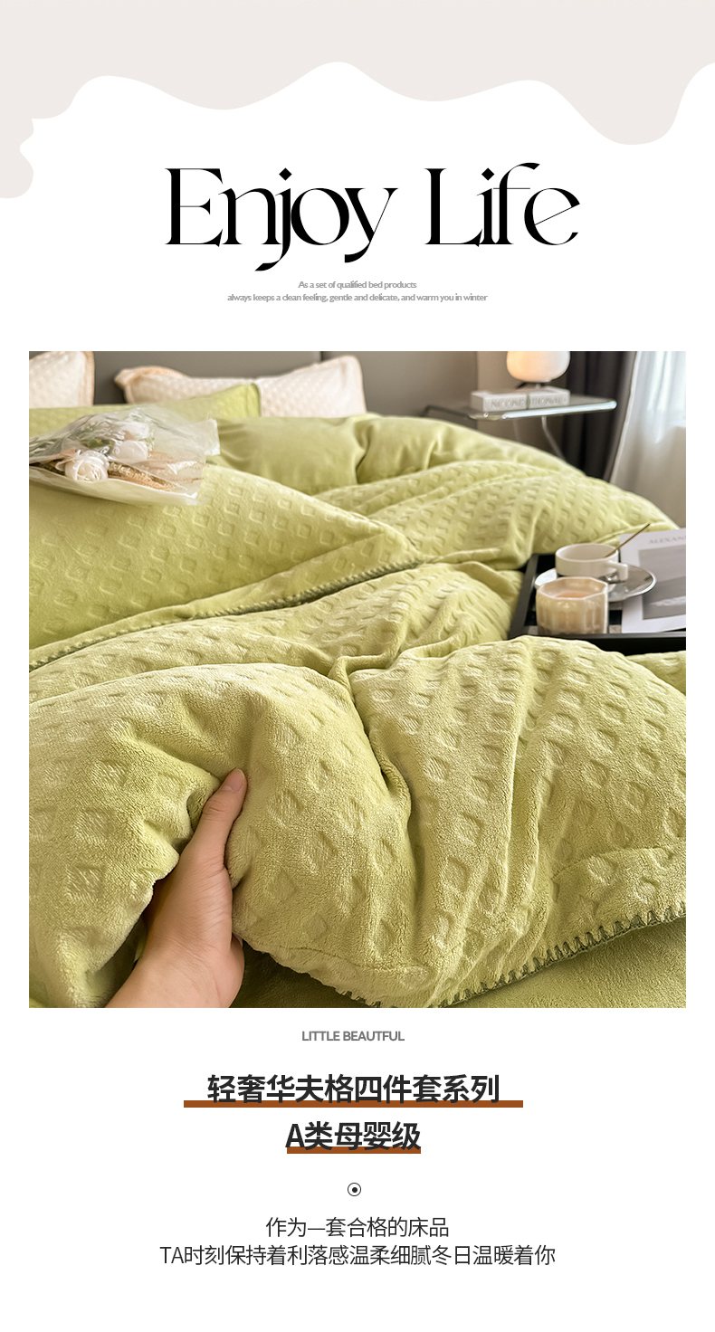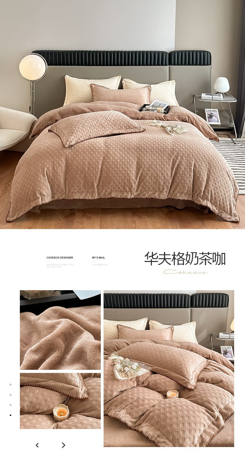当前位置: 91家纺网 > 商品网购 > 床品套件 > 四件套 > 牛奶绒四件套 > 艾佳 2025新款华夫格高克重牛奶绒雕花三角贝壳边工艺加厚保暖四件套 华夫格奶茶咖