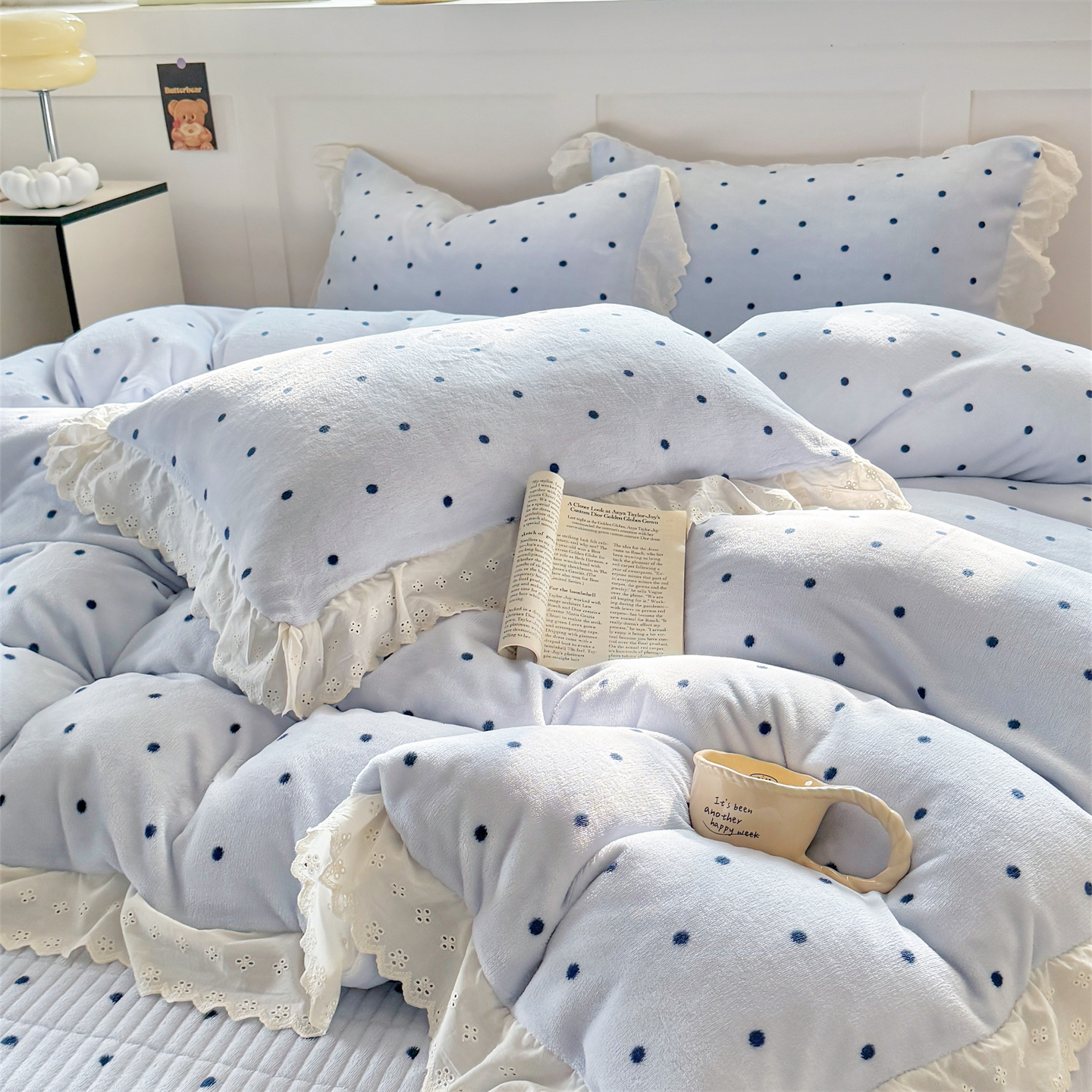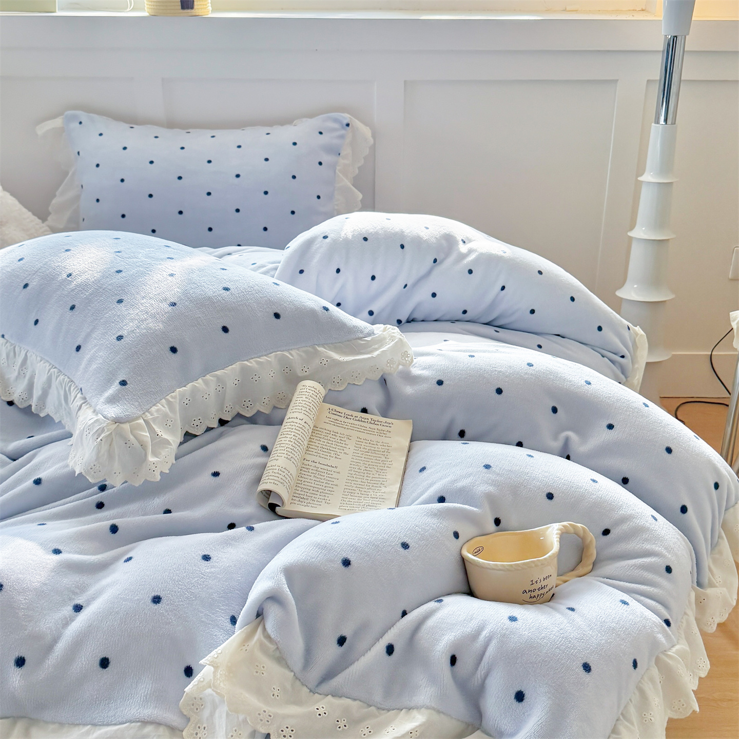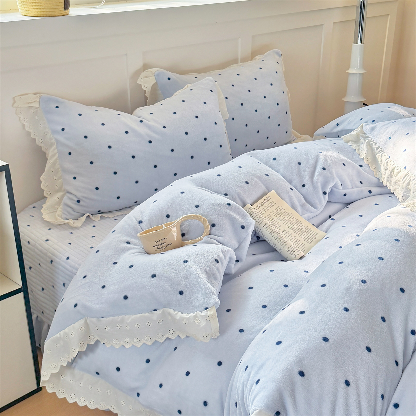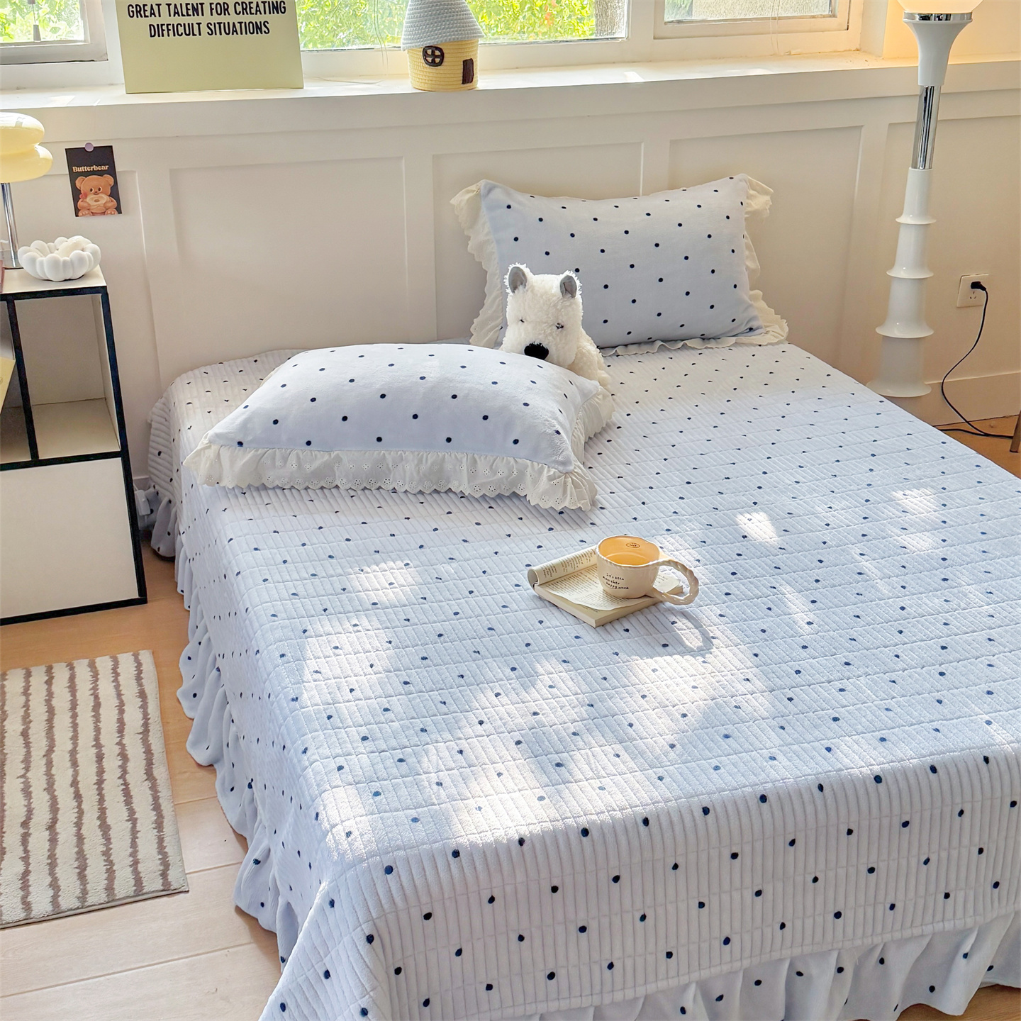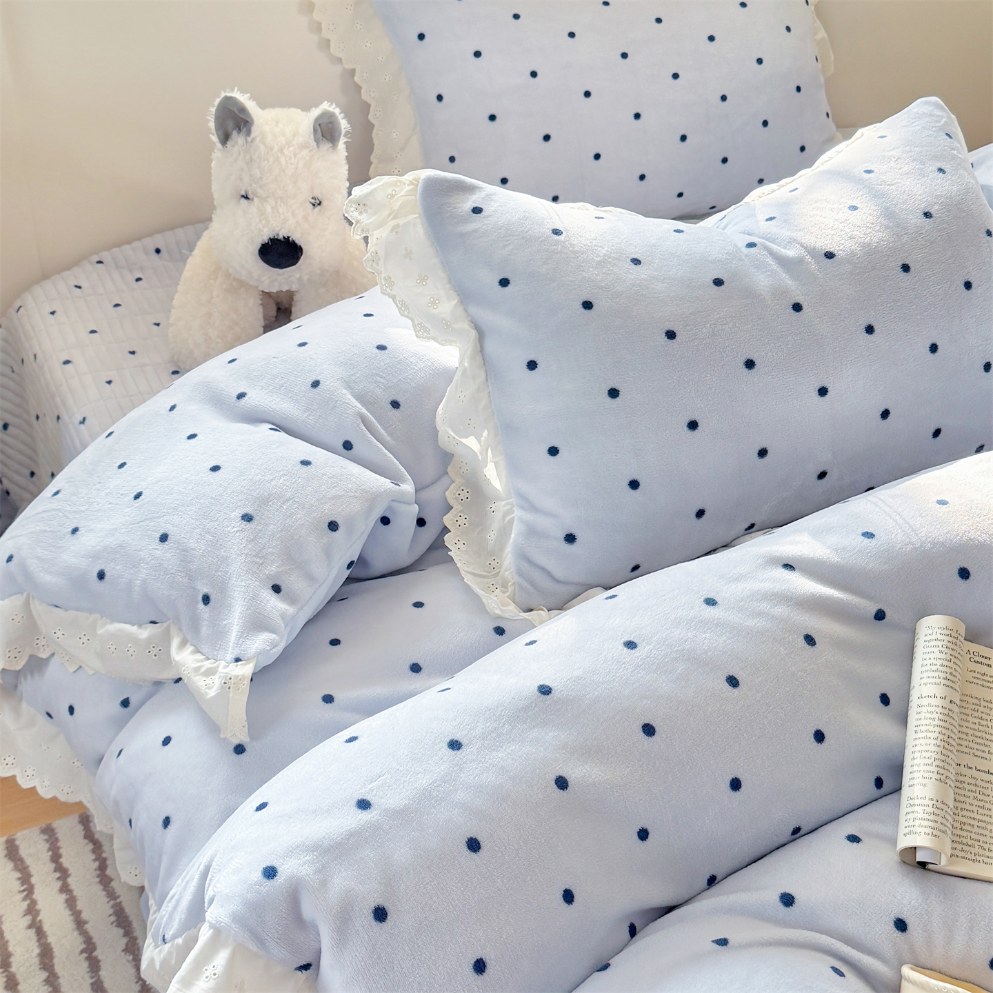 欧尚 2025新款牛奶绒花边床盖四件套 蓝点点