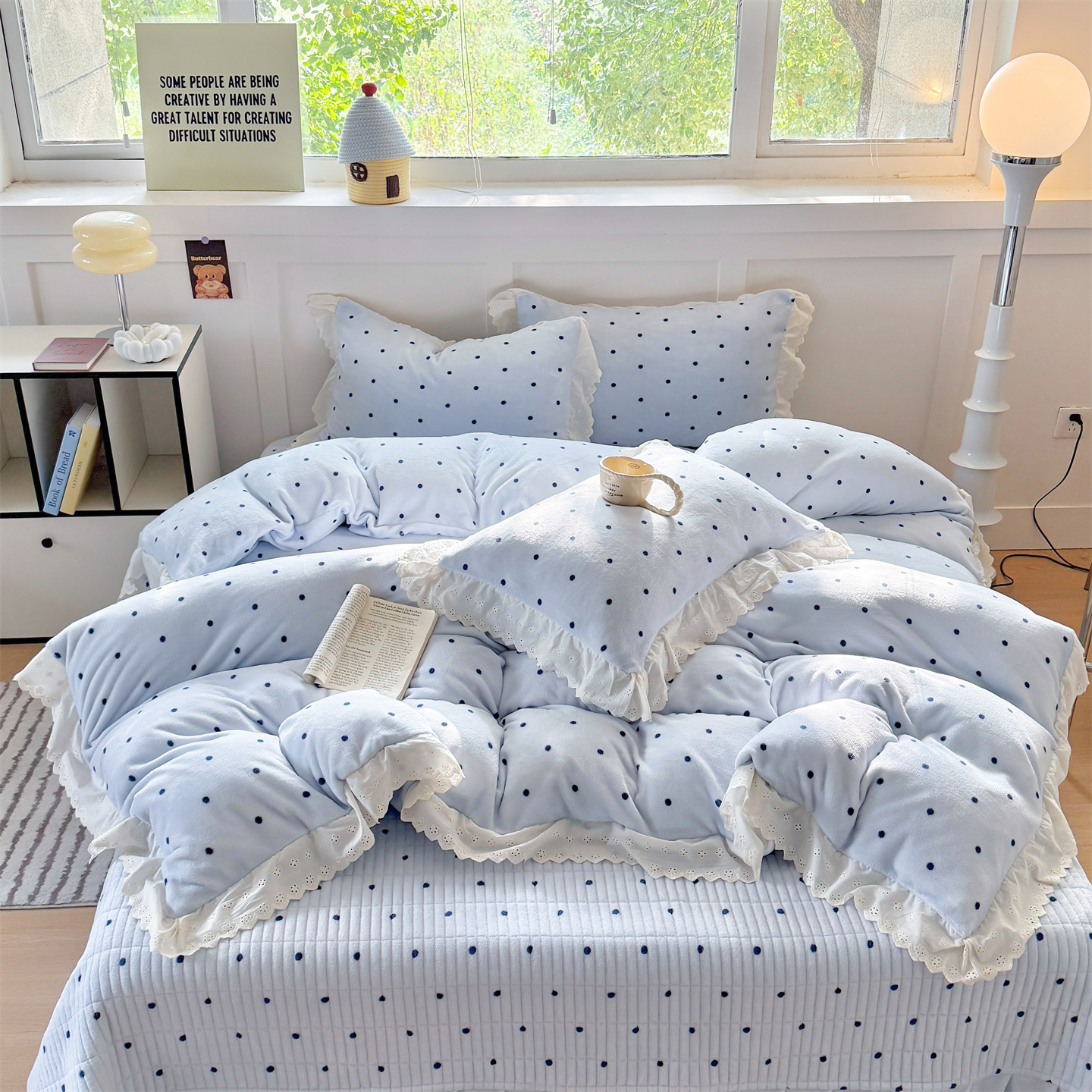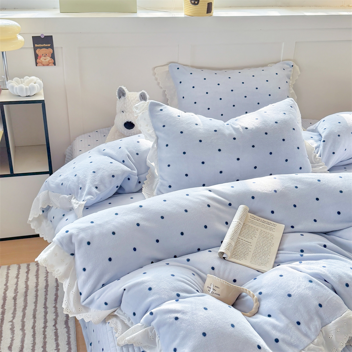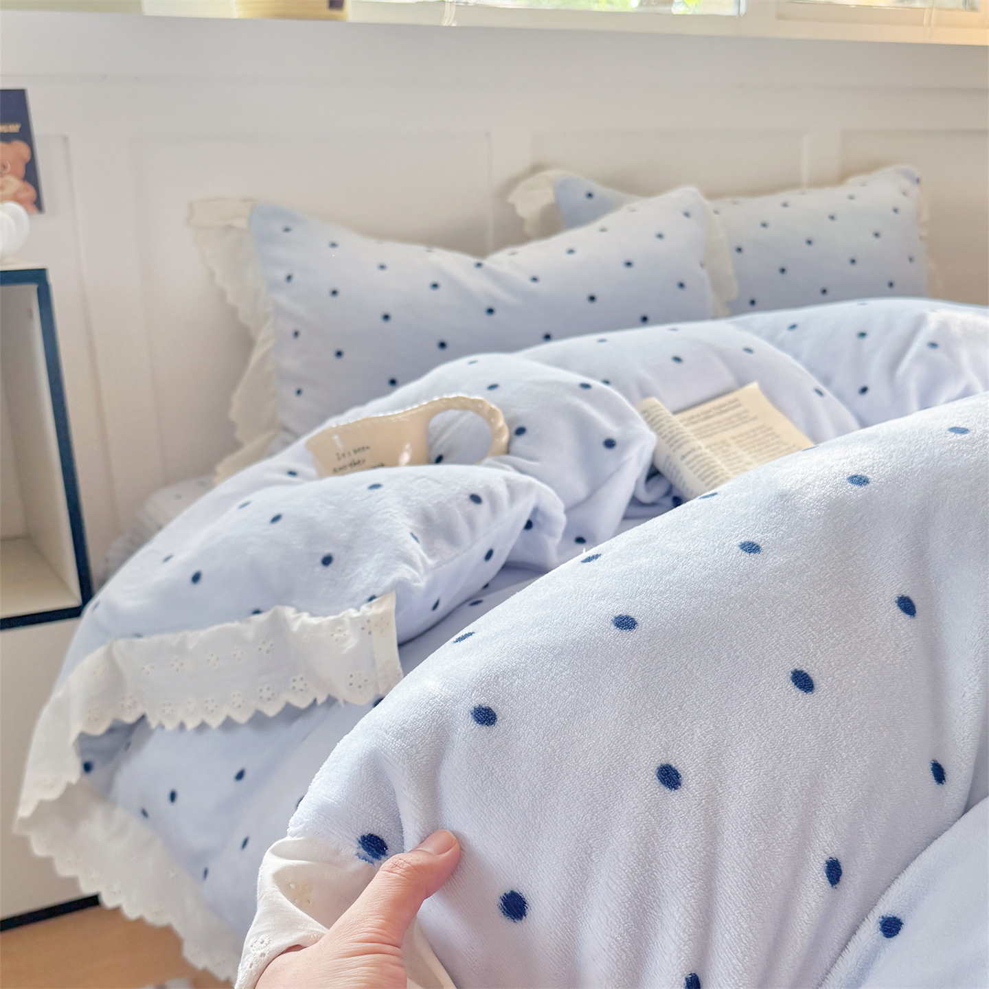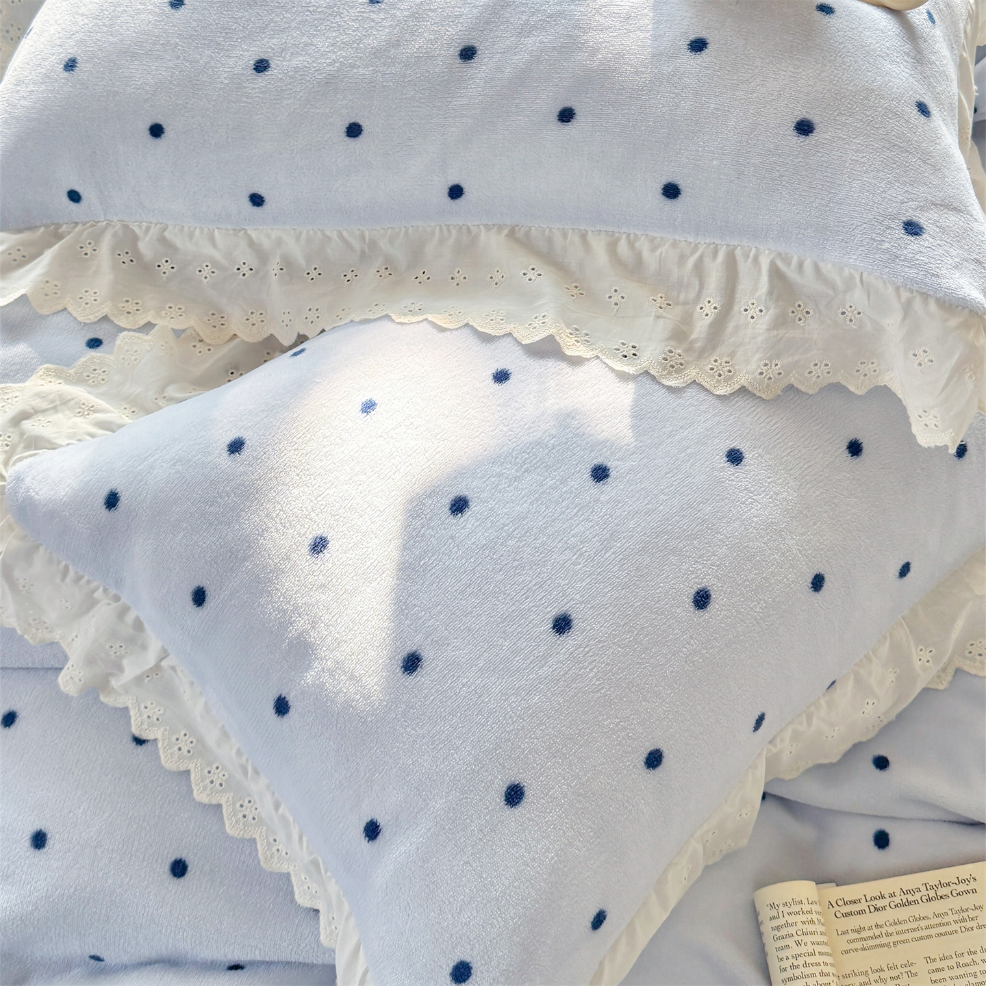 欧尚 2025新款牛奶绒花边床盖四件套 蓝点点