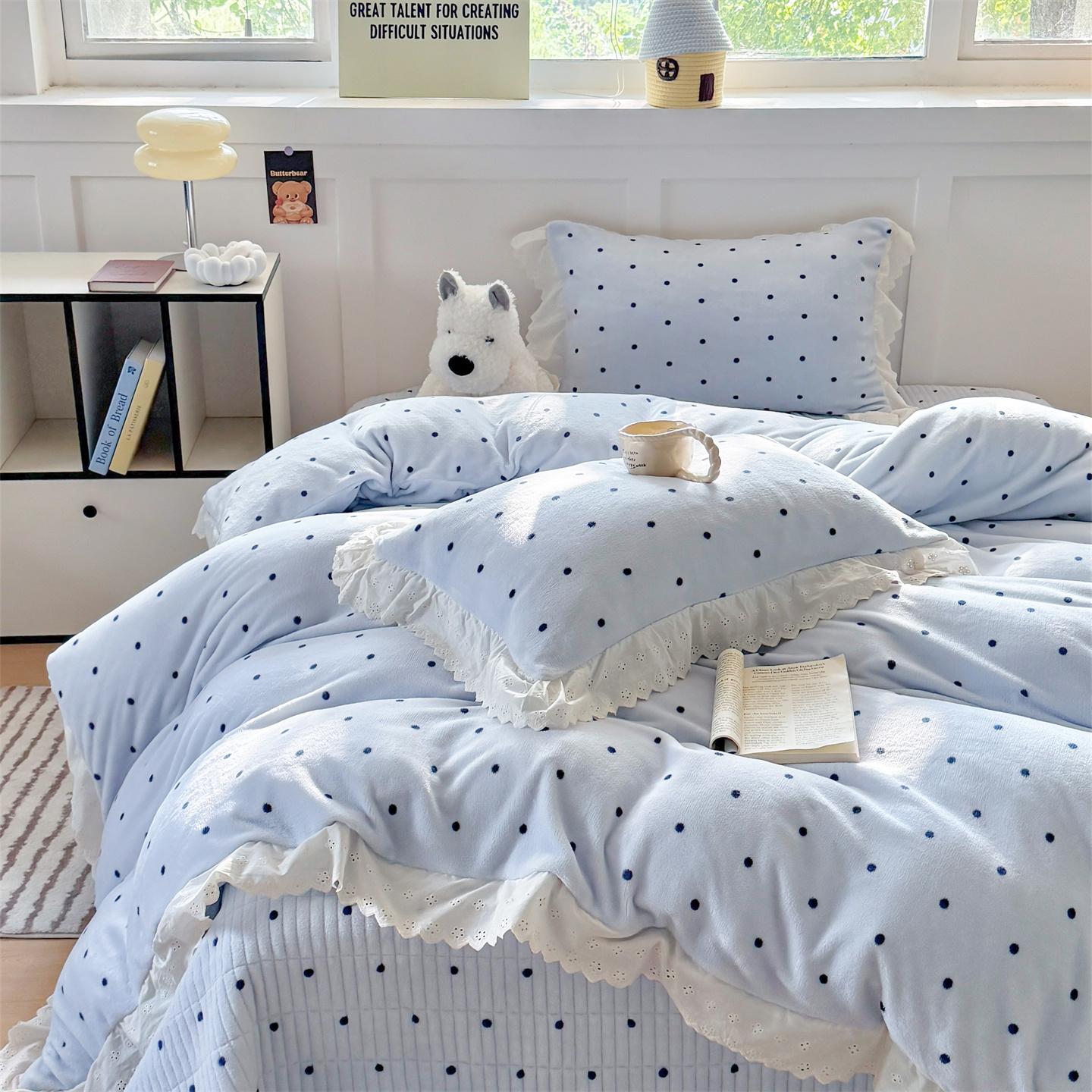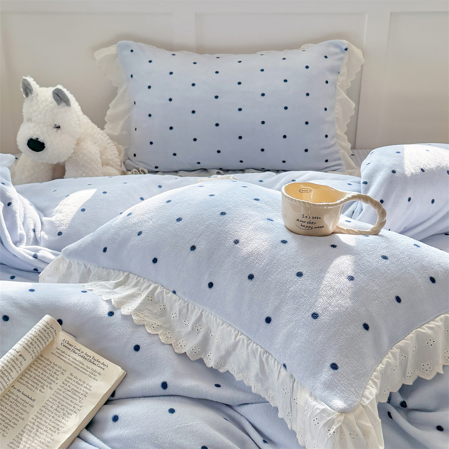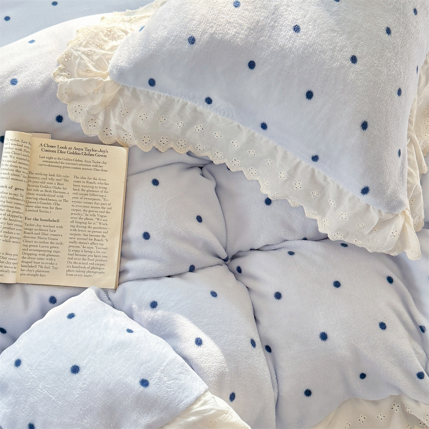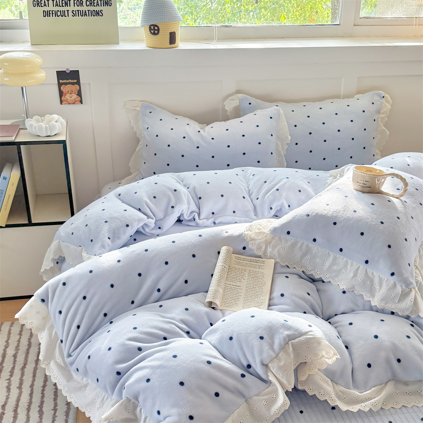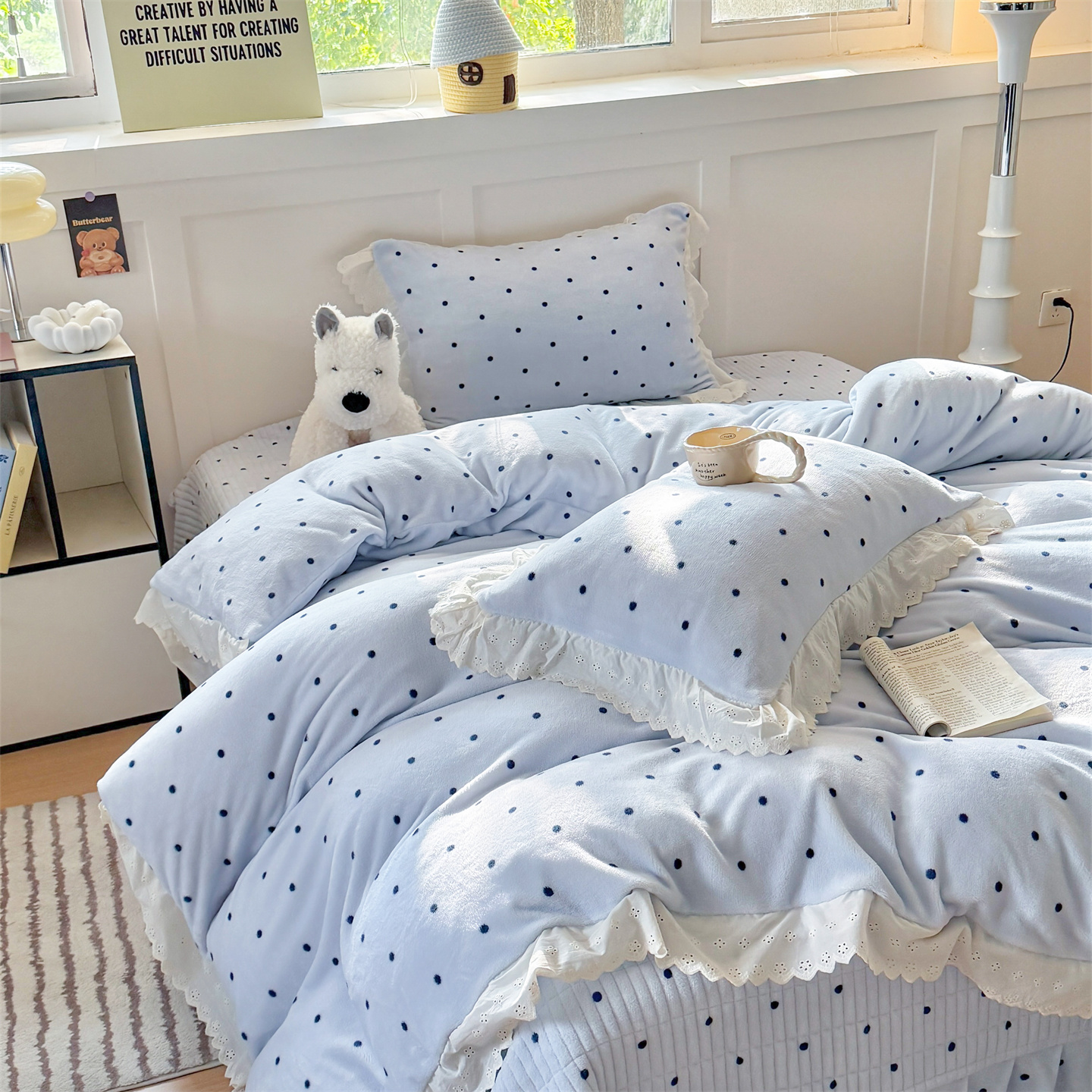 欧尚 2025新款牛奶绒花边床盖四件套 蓝点点