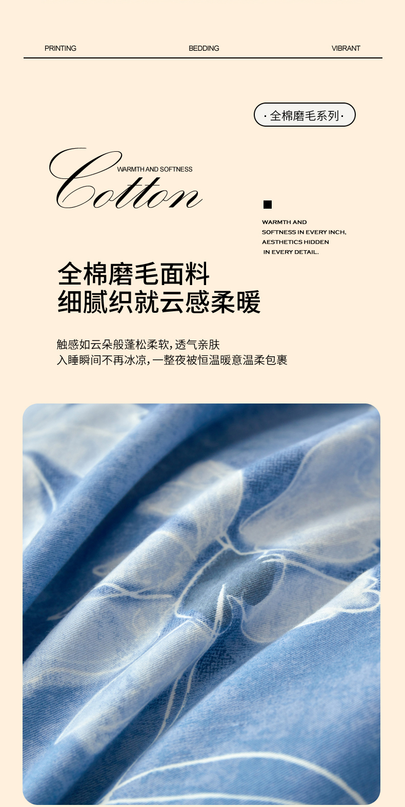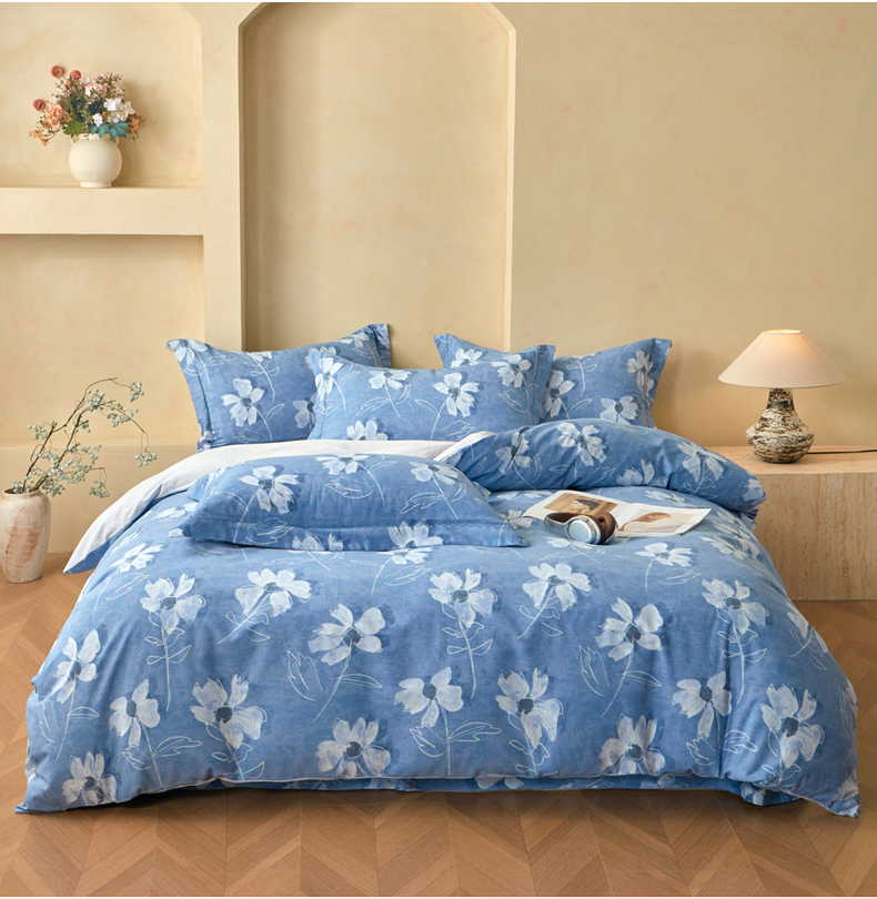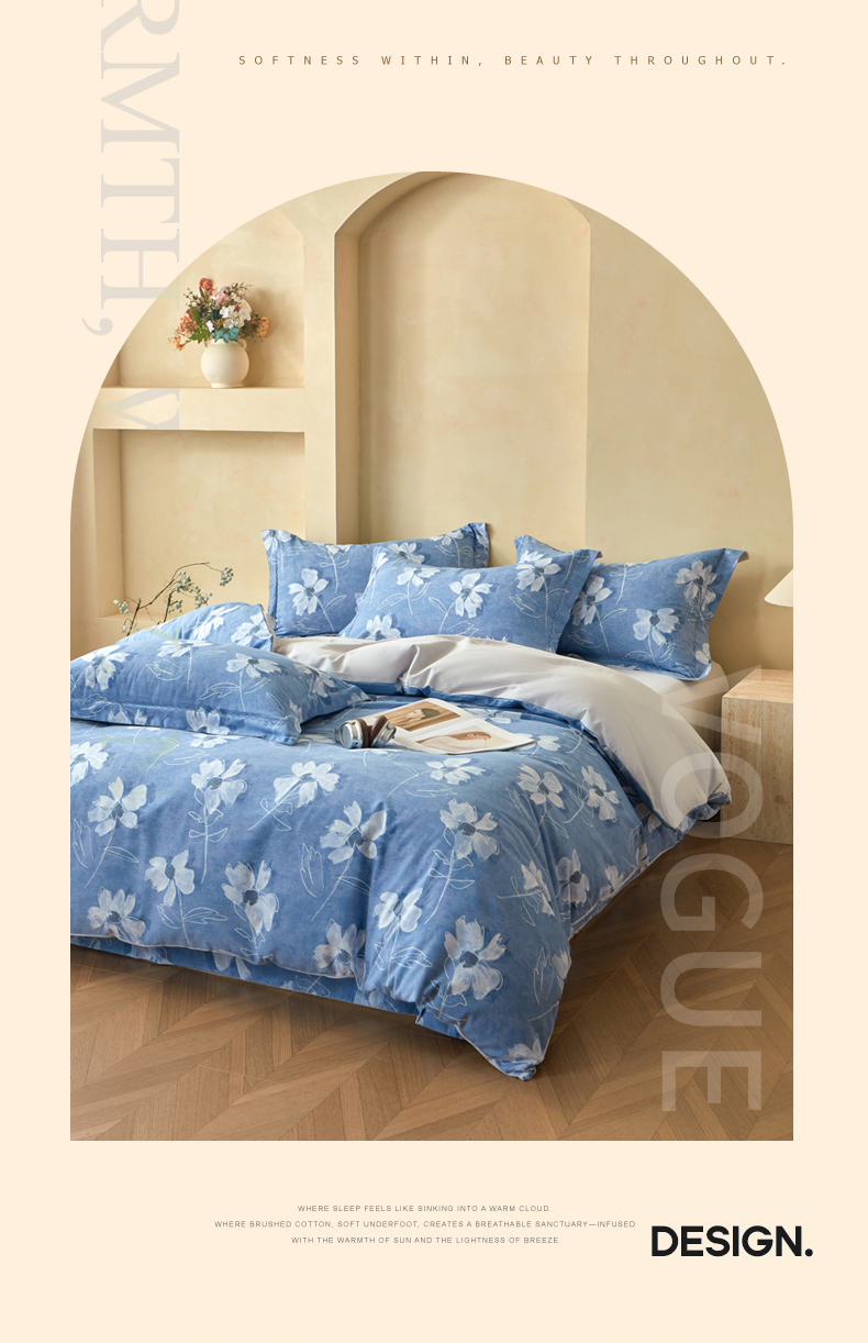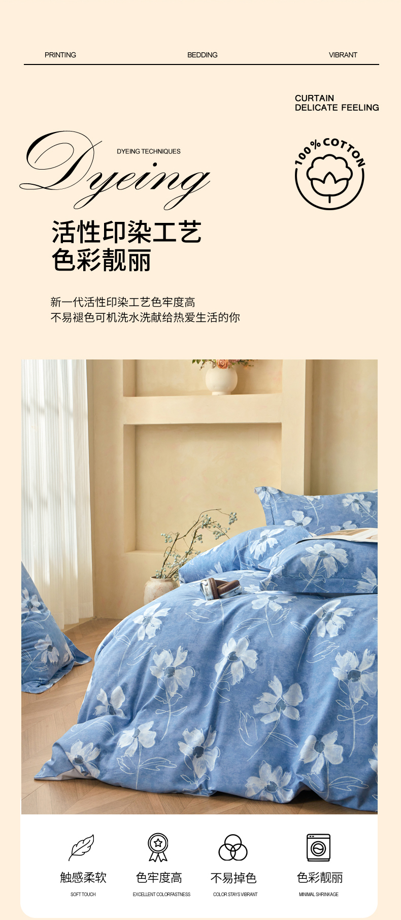 洺兰家居 2025年新款秋冬加厚全棉磨毛四件套纯棉生态磨毛印花套件 琼芳玉露-蓝