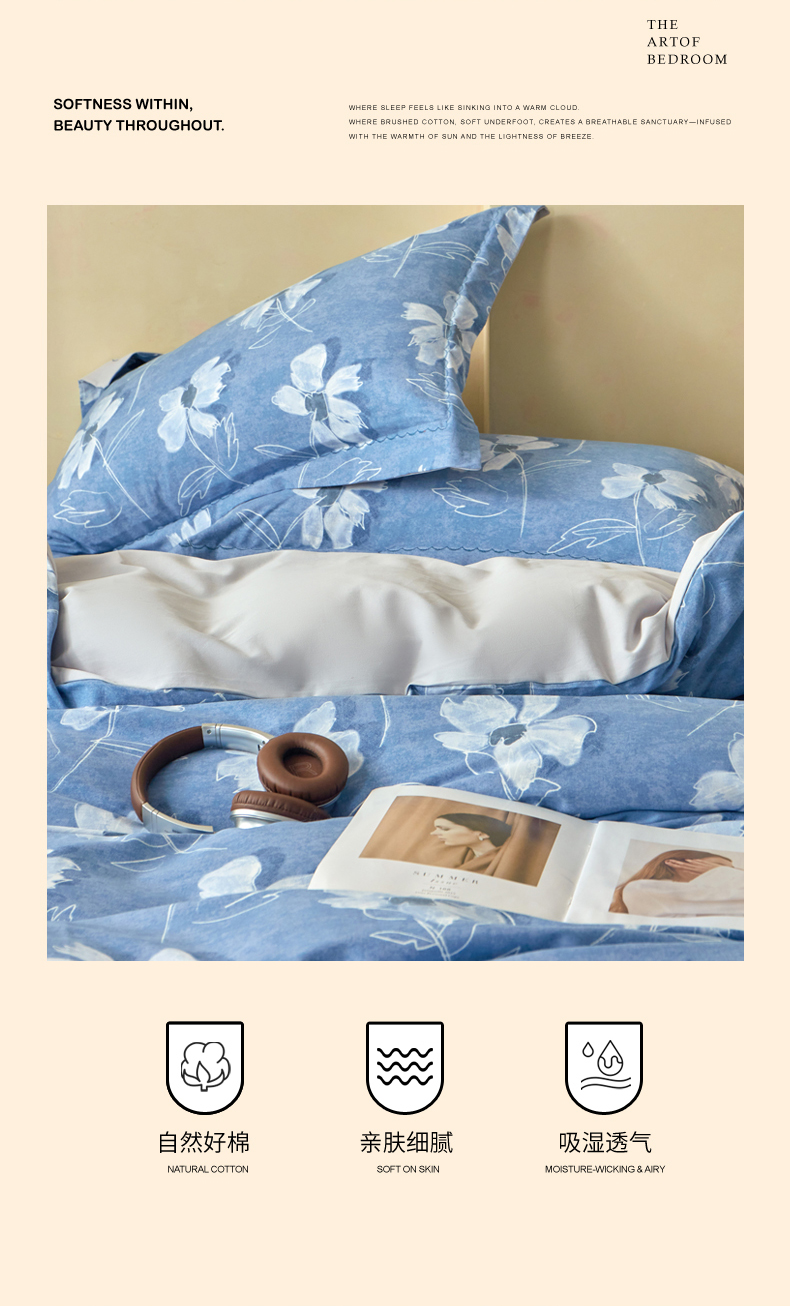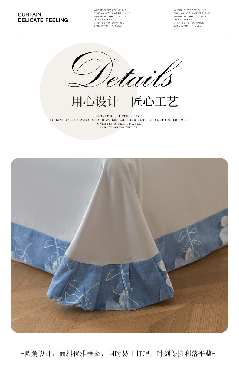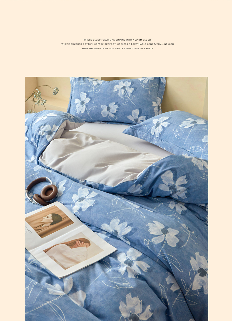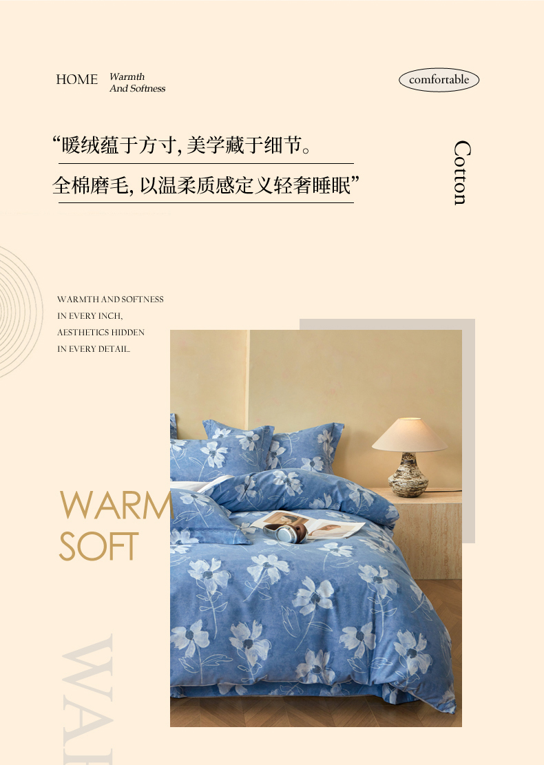 洺兰家居 2025年新款秋冬加厚全棉磨毛四件套纯棉生态磨毛印花套件 琼芳玉露-蓝