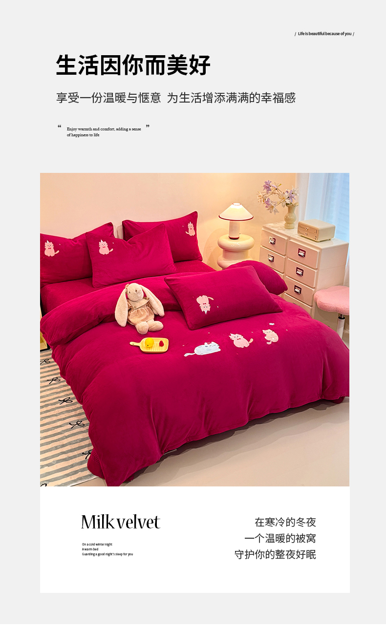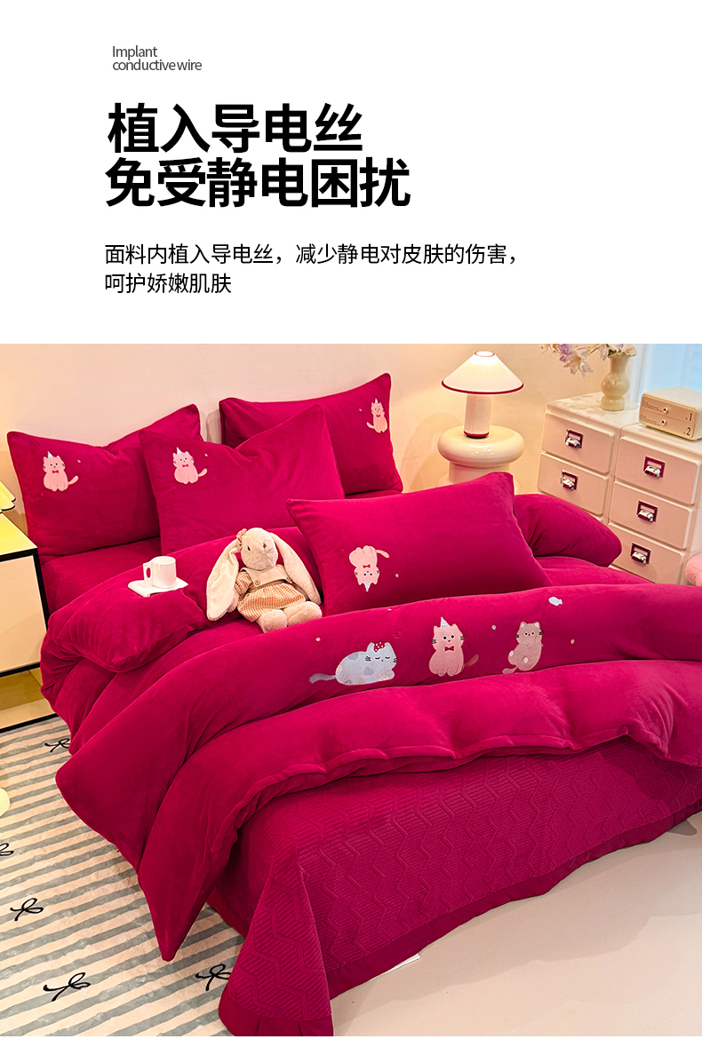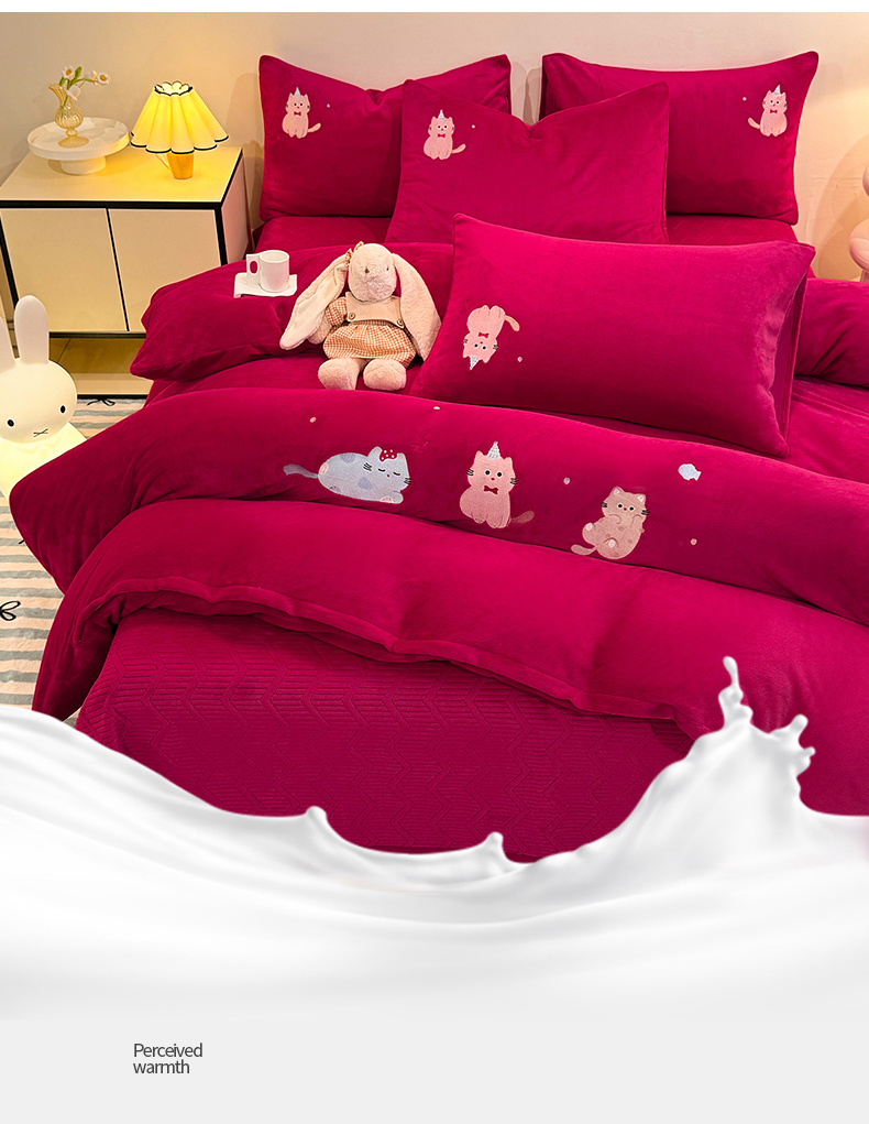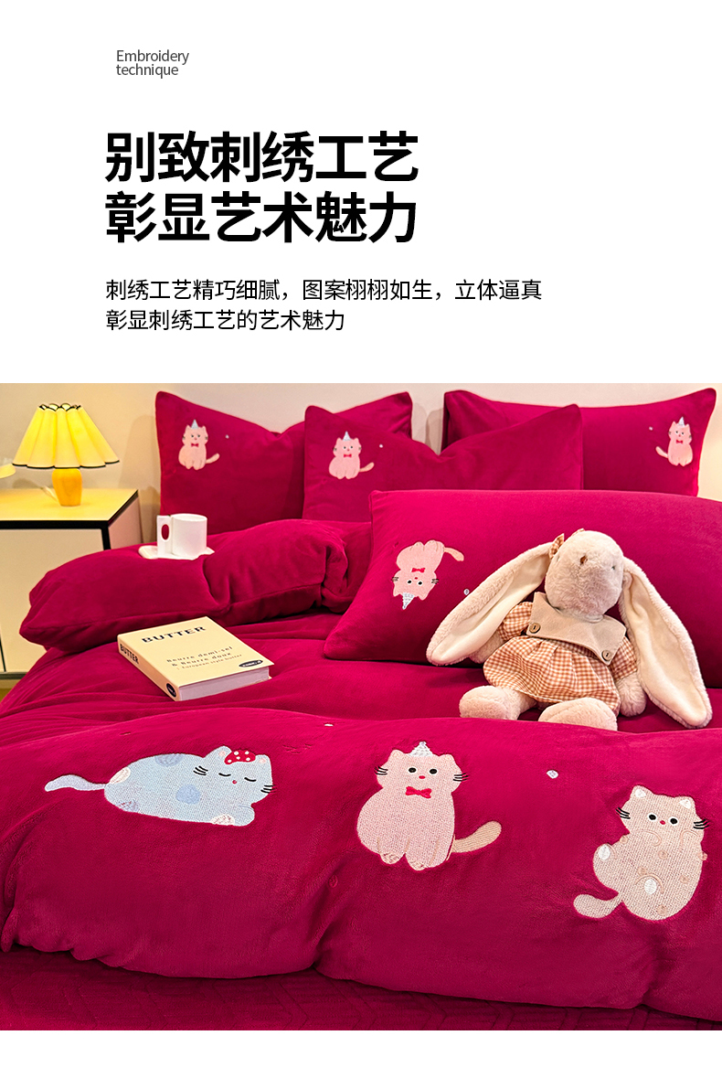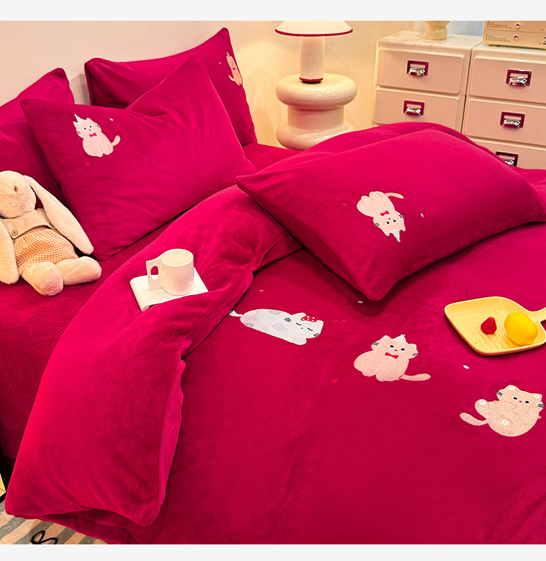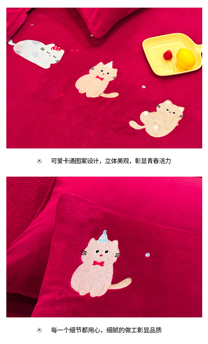 当前位置: 91家纺网 > 商品网购 > 床品套件 > 四件套 > 牛奶绒四件套 > 新方向 2025年新款 全消光A类刺绣牛奶绒四件套-卡通红色系列 可爱猫-洋酒红