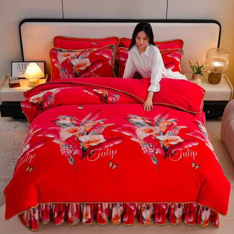 新8.5-9.5斤法莱绒四件套珊瑚牛奶金貂绒四件套床裙 蝶恋花间