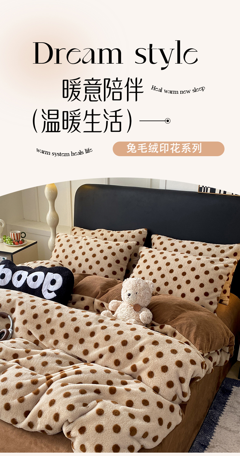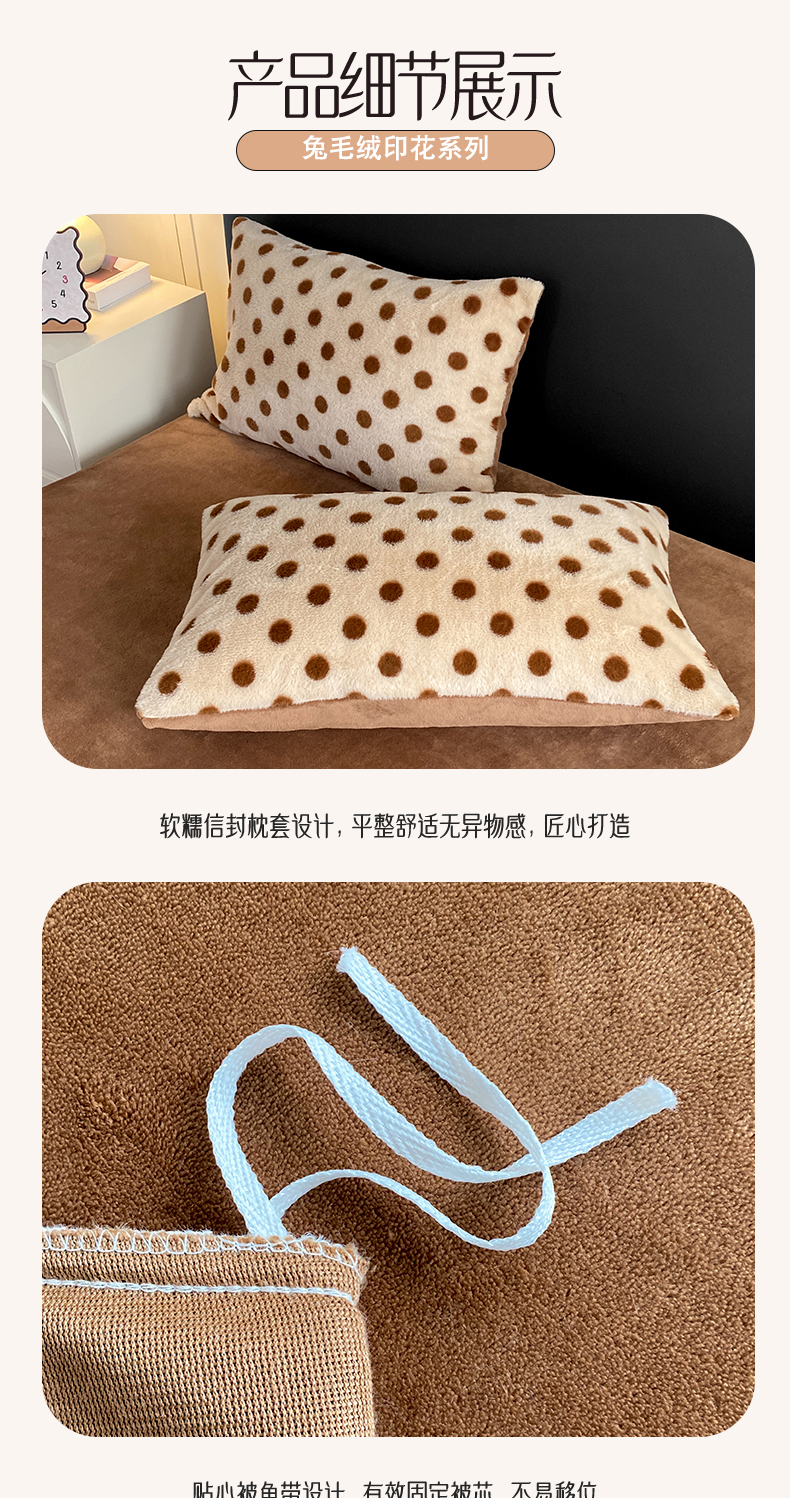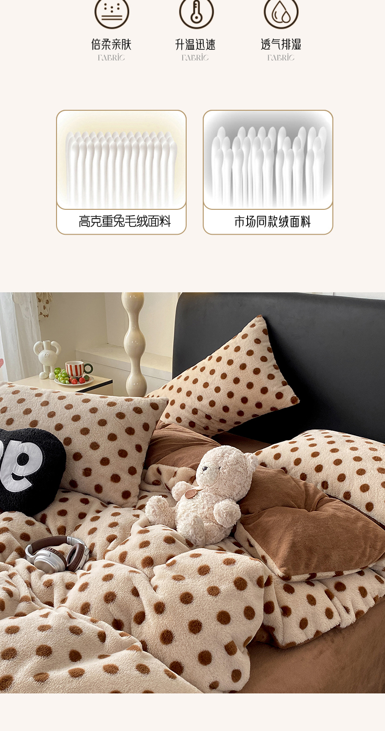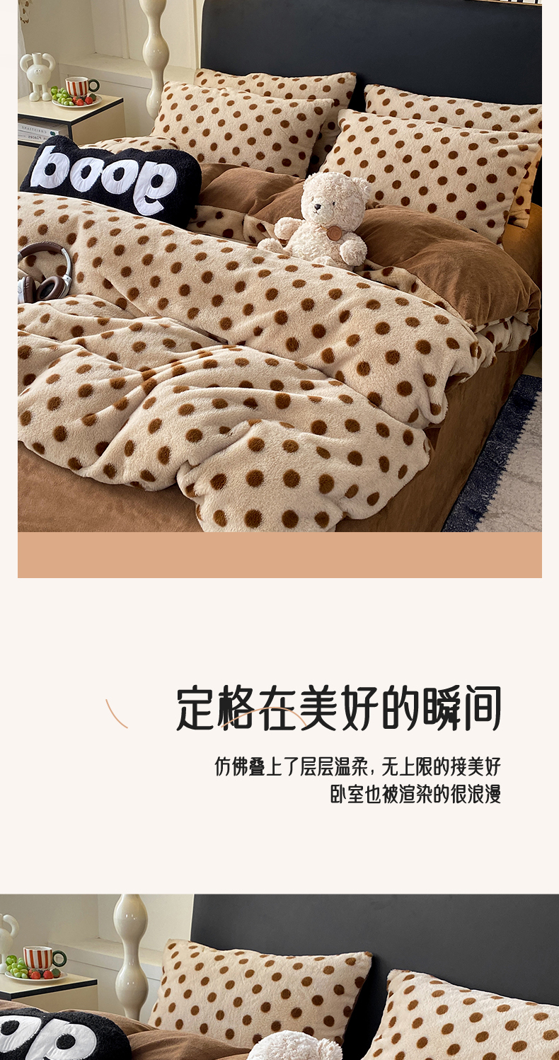 商品名称:蝶帕家纺 2025新款兔毛绒印花四件套 波点咖