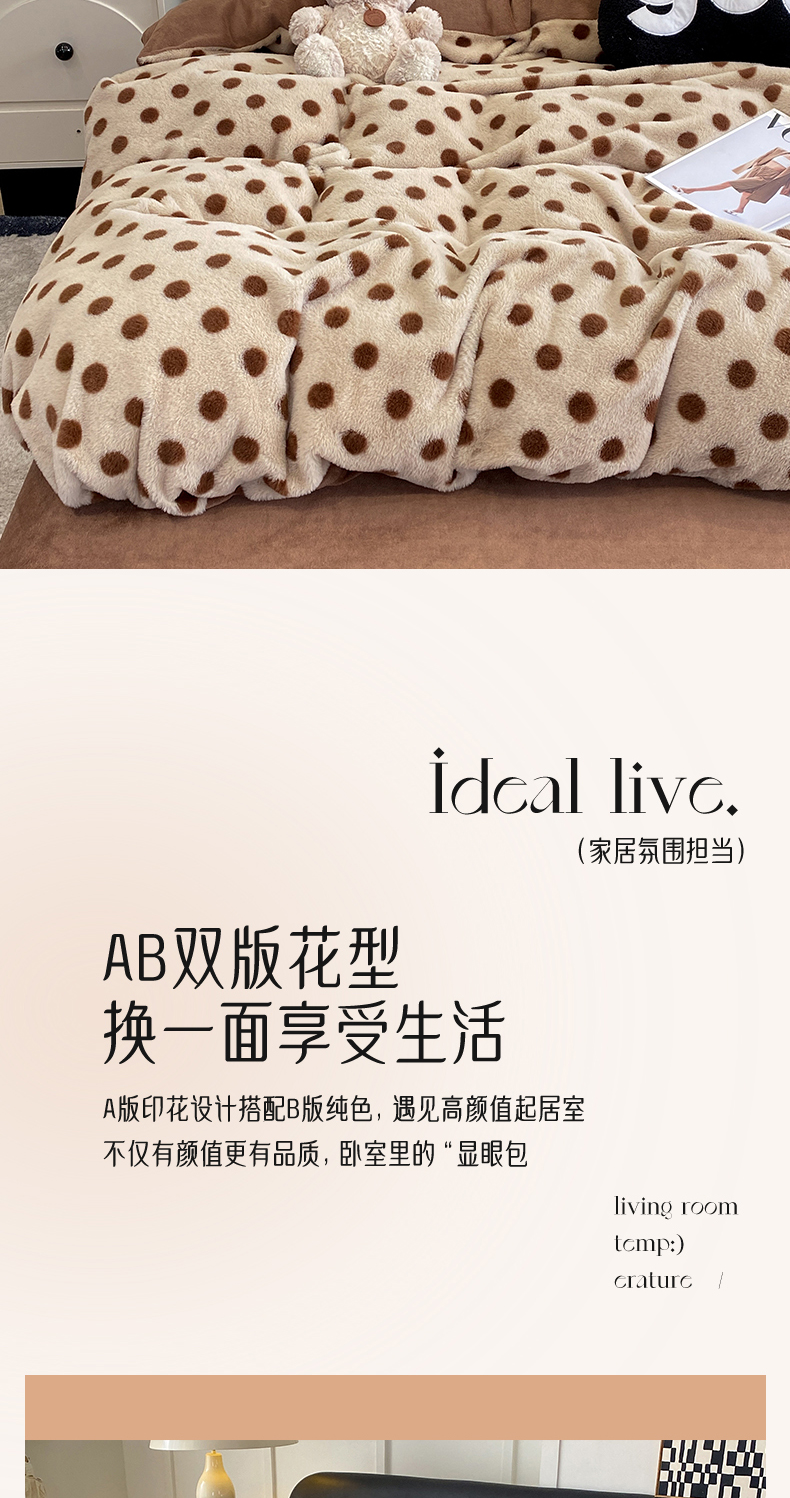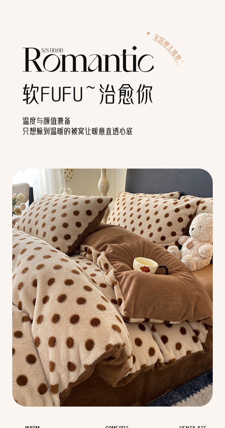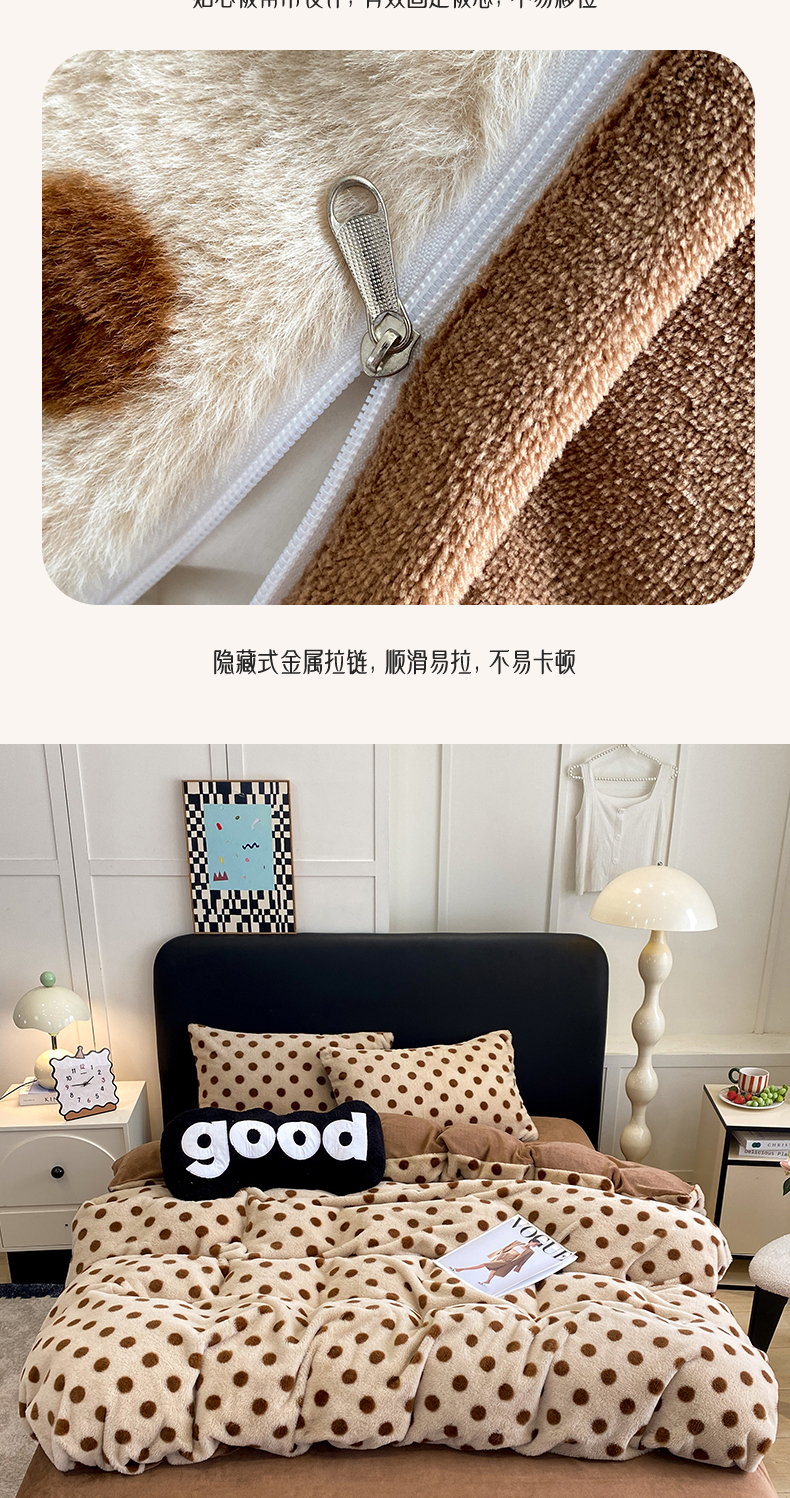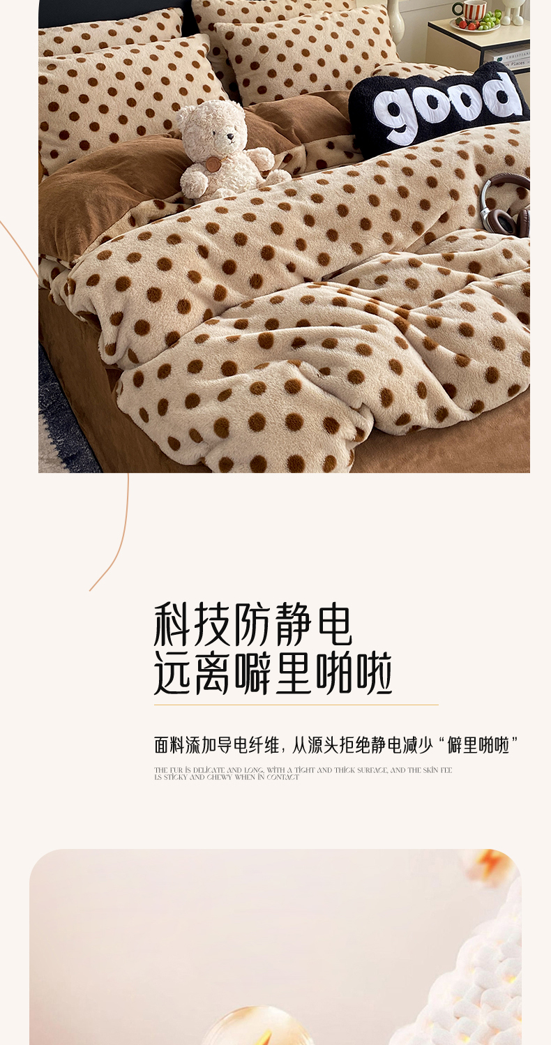 商品名称:蝶帕家纺 2025新款兔毛绒印花四件套 波点咖