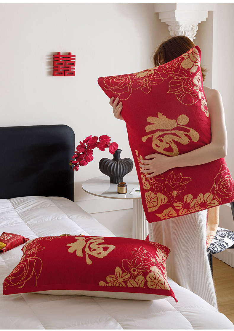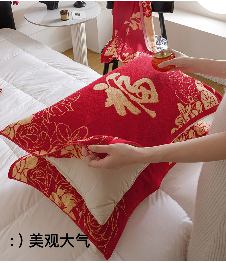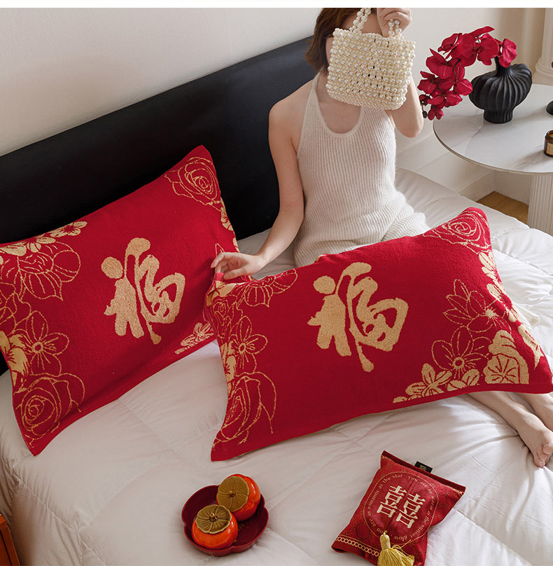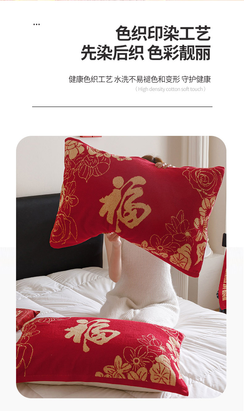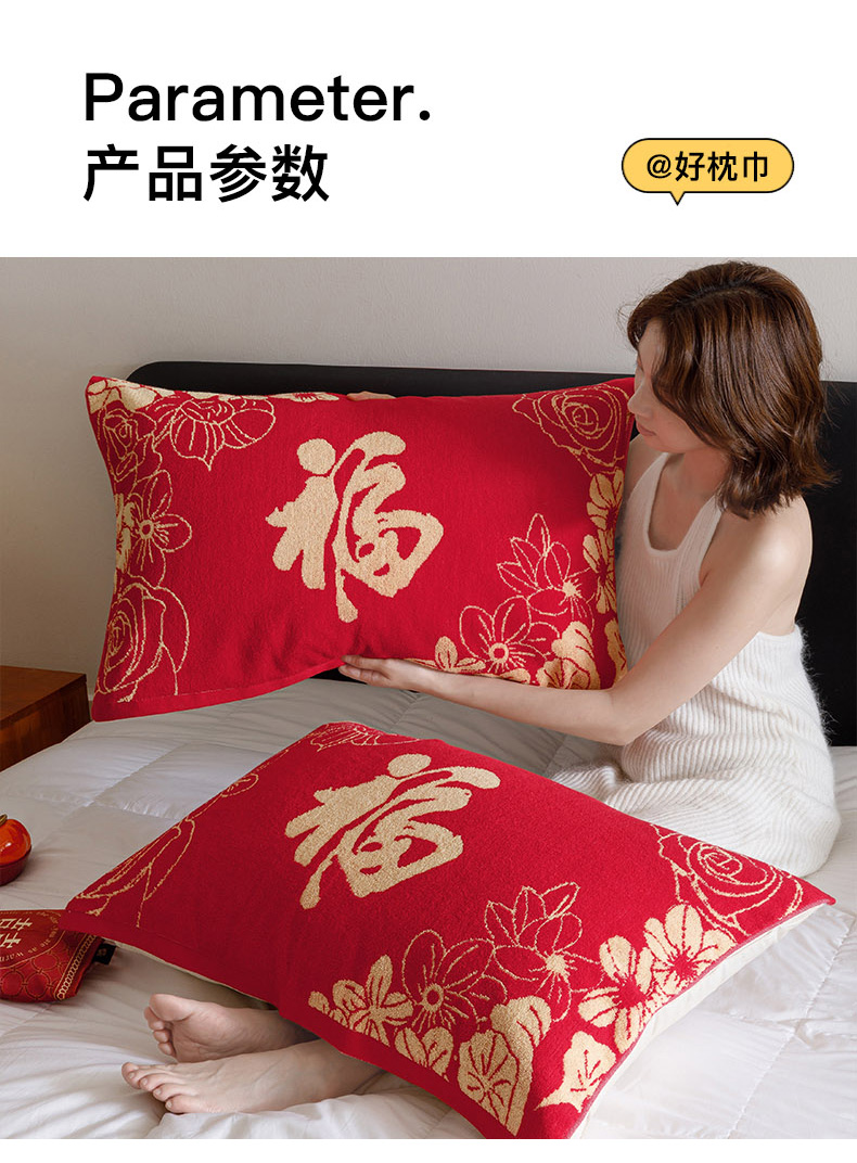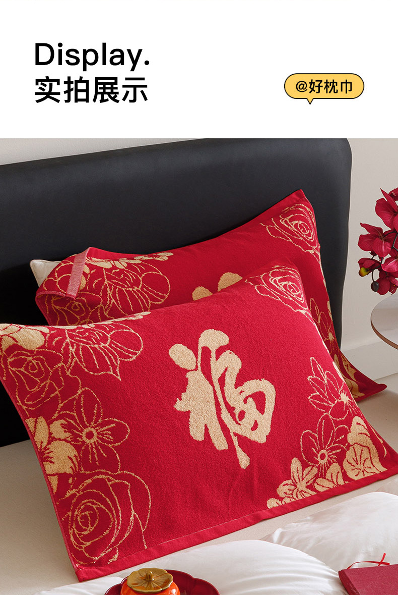 爱港家纺 2025专版新款老式全棉大红枕巾结婚枕巾喜庆百福枕巾 锦绣花福