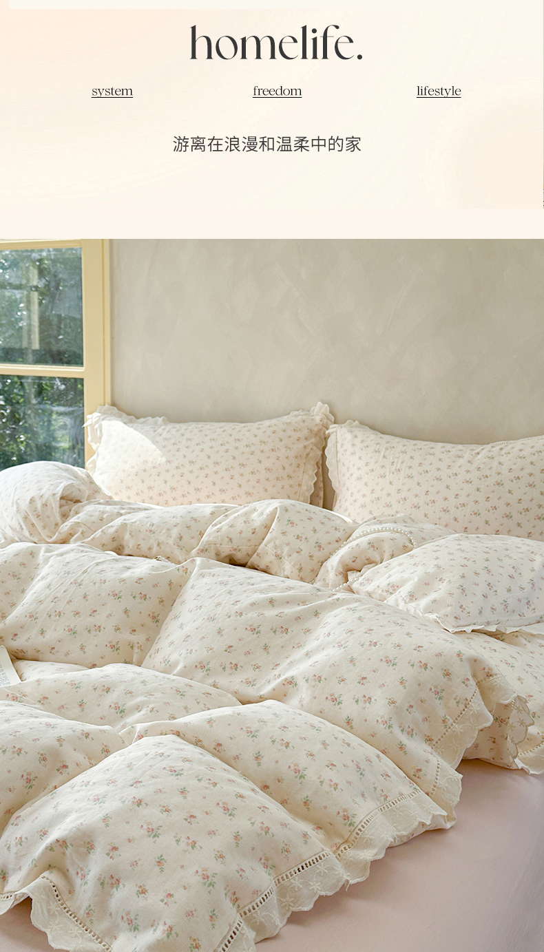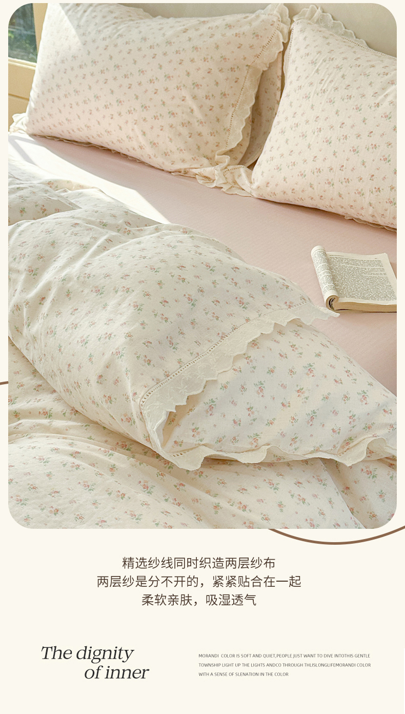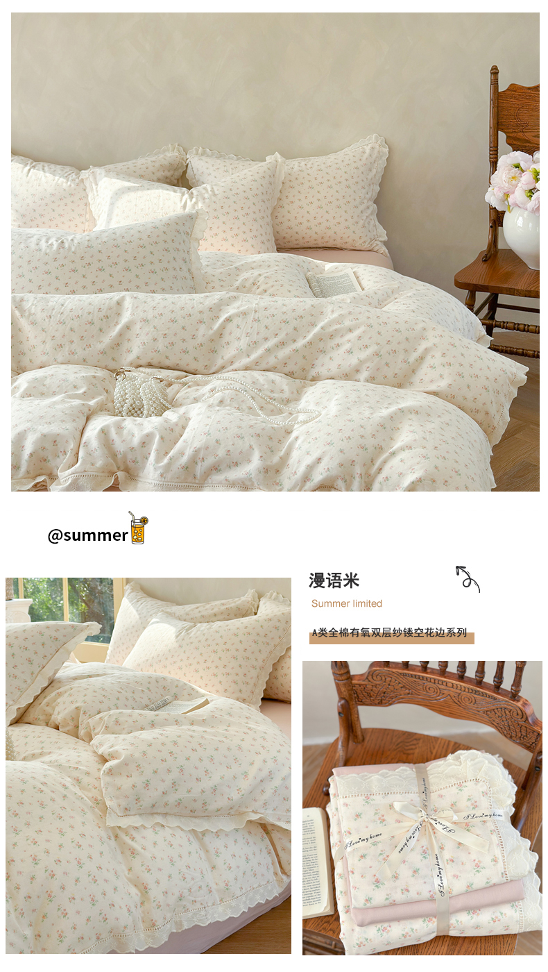 当前位置: 91家纺网 > 商品网购 > 床品套件 > 四件套 > 双层纱四件套 > 麦伦家居 2025新款A类全棉有氧双层纱印花系列四件套-镂空系列 漫语米