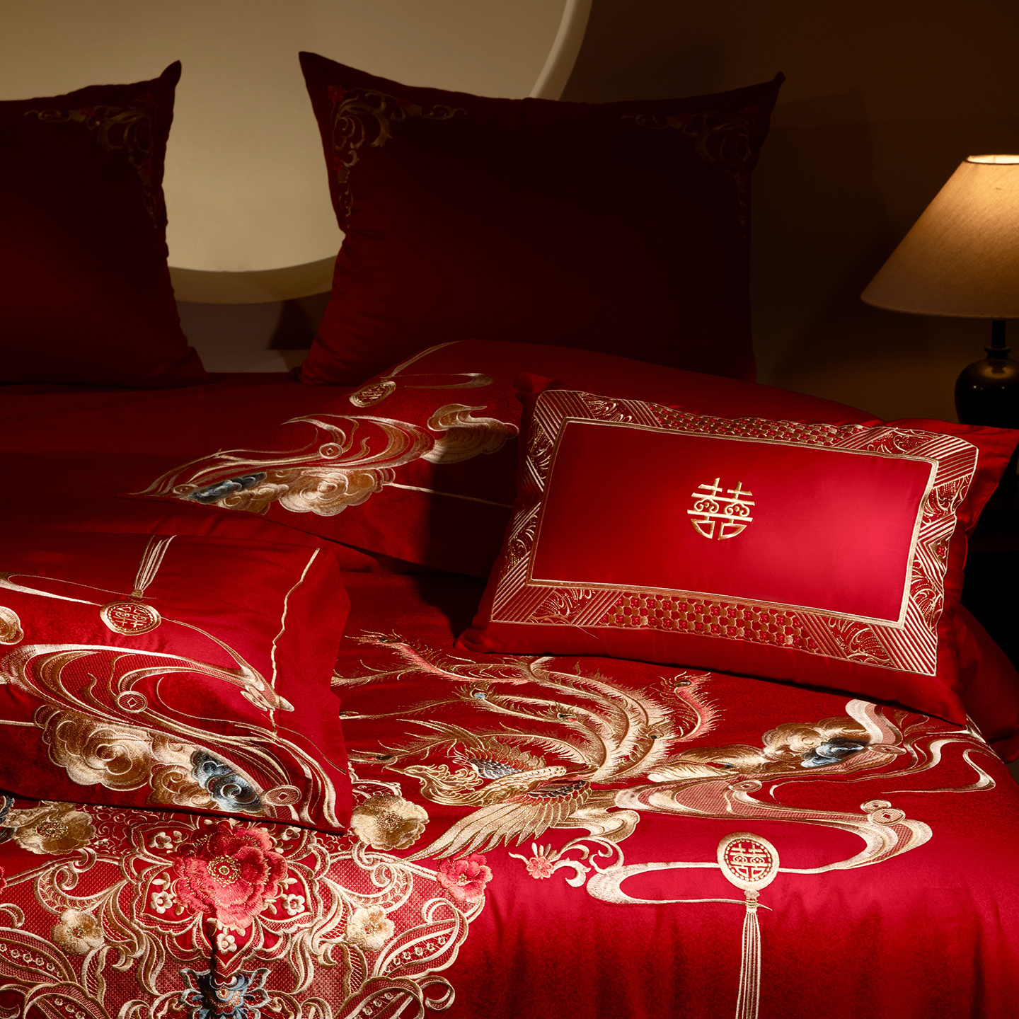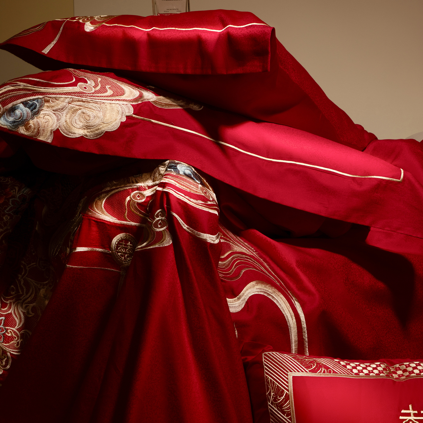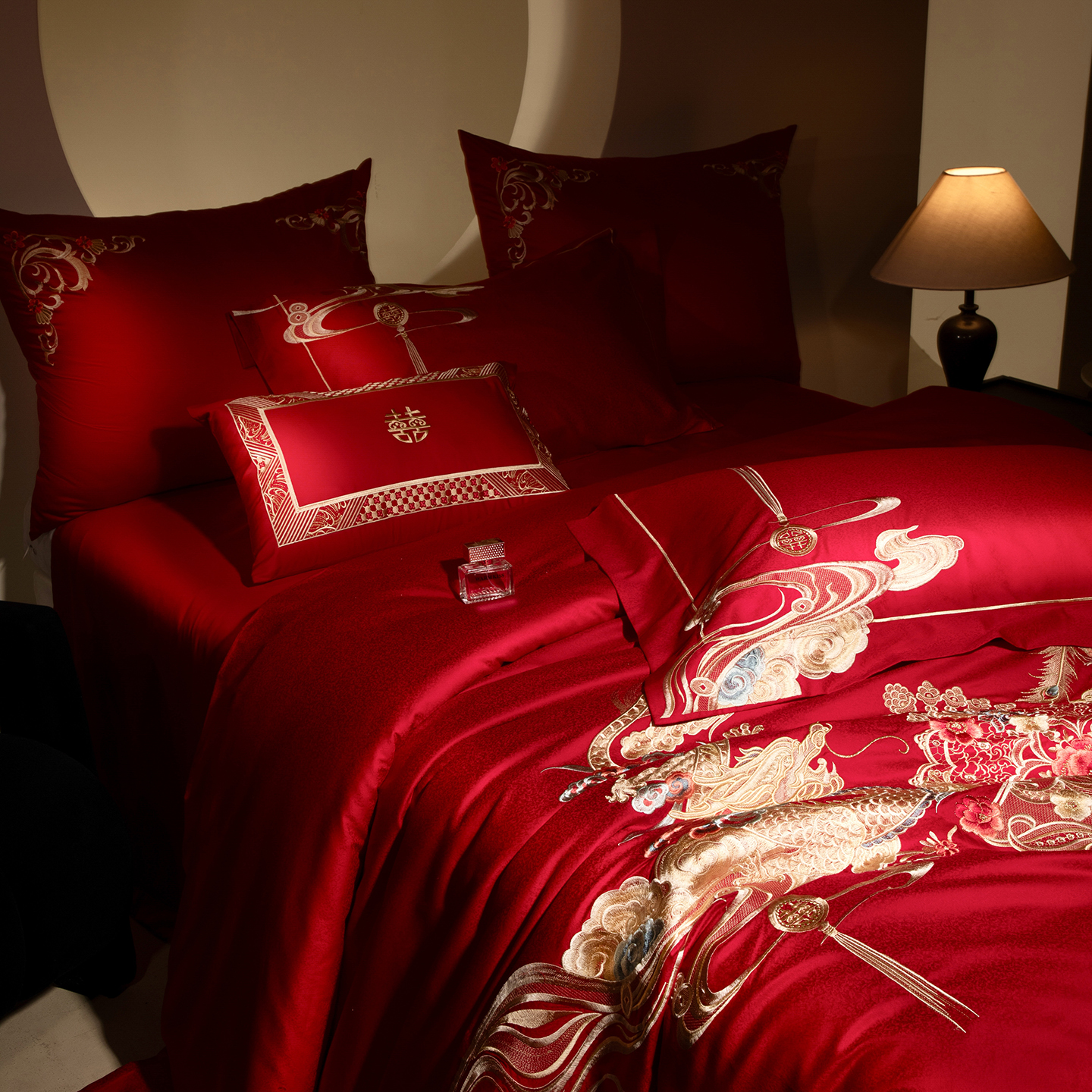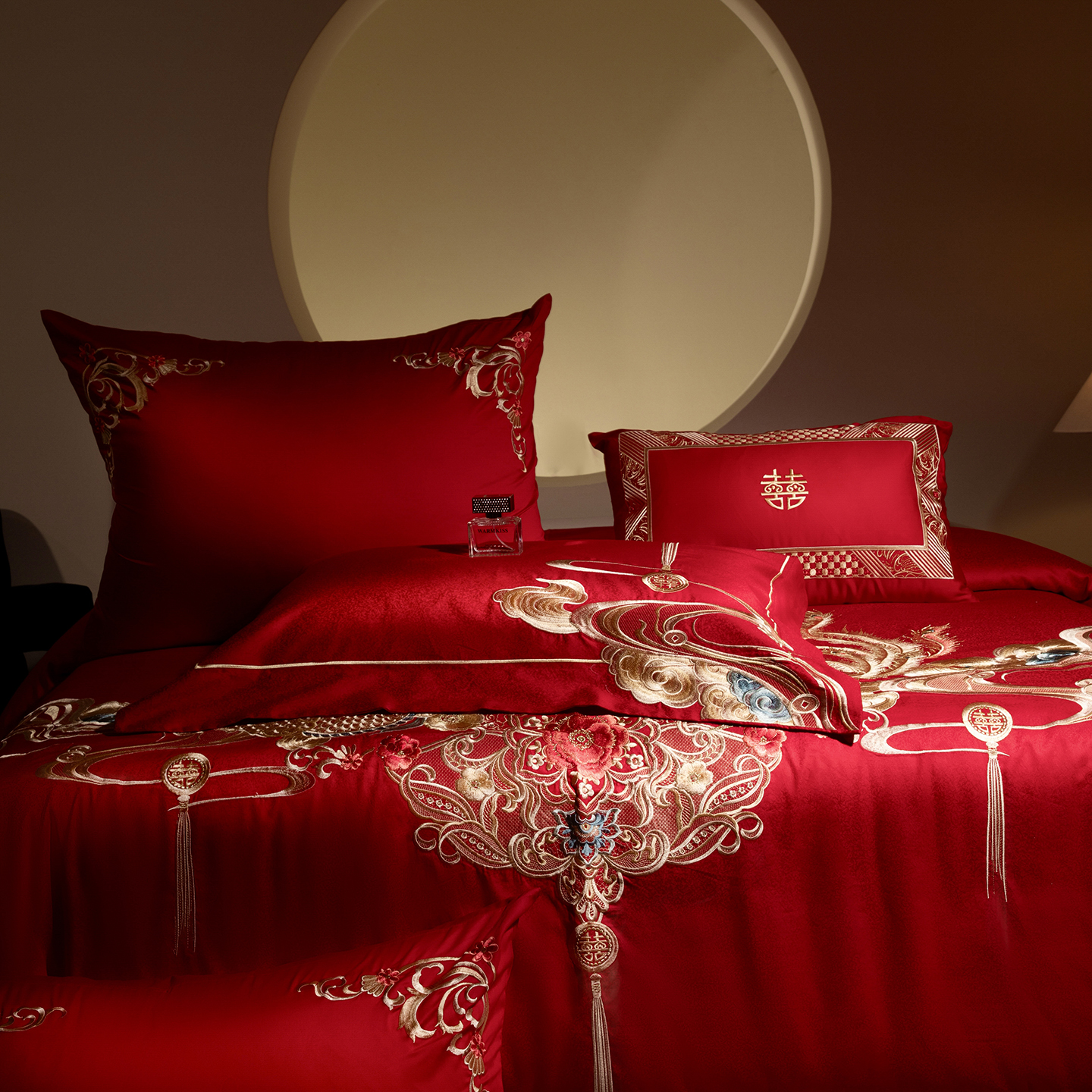 商品名称:(总)佳汐蓝家纺 2025新款100支贡缎提花全棉刺绣婚庆四件套-相亲相爱