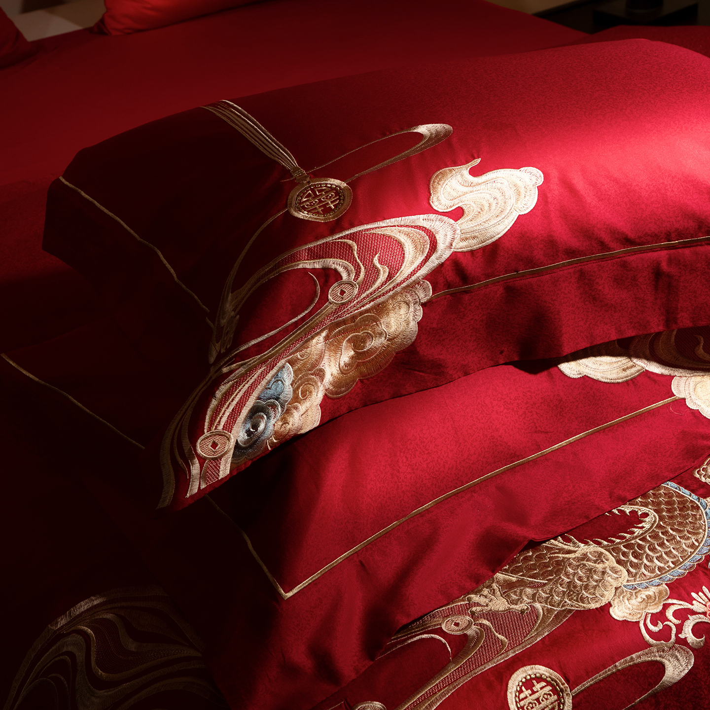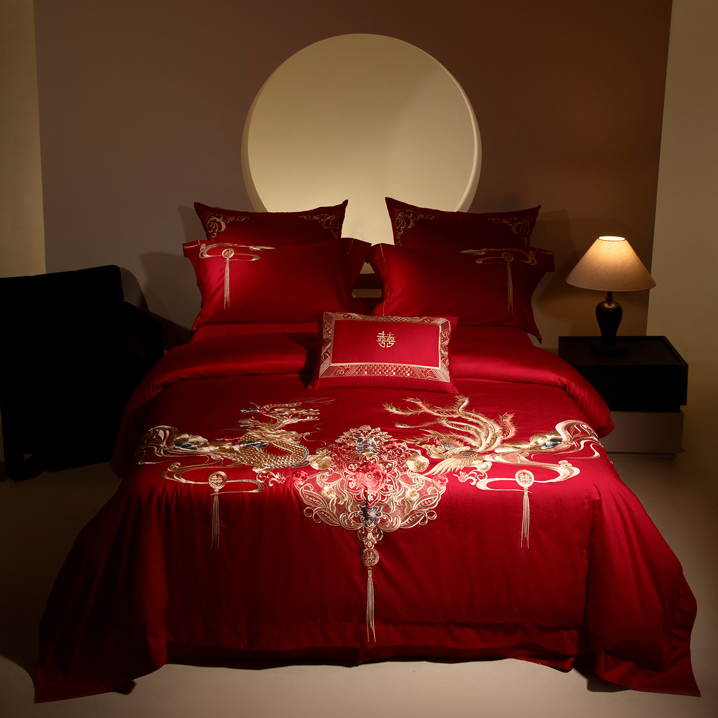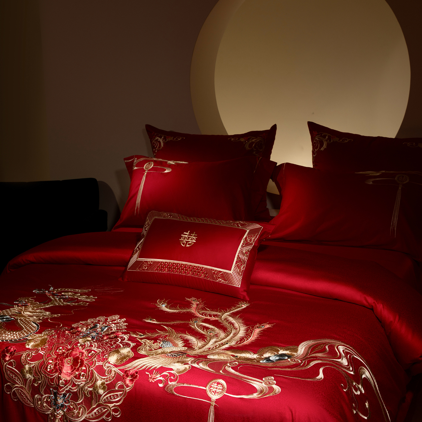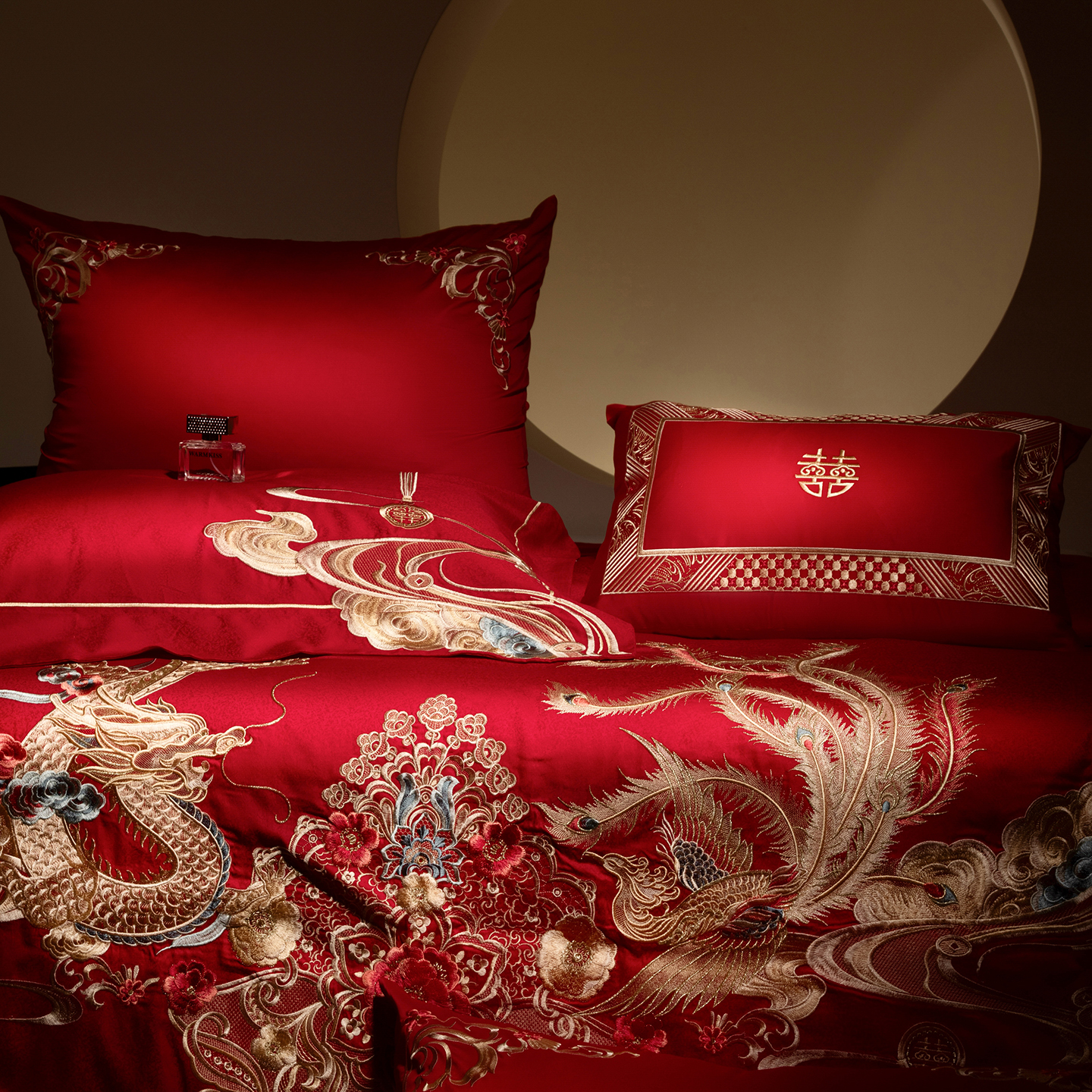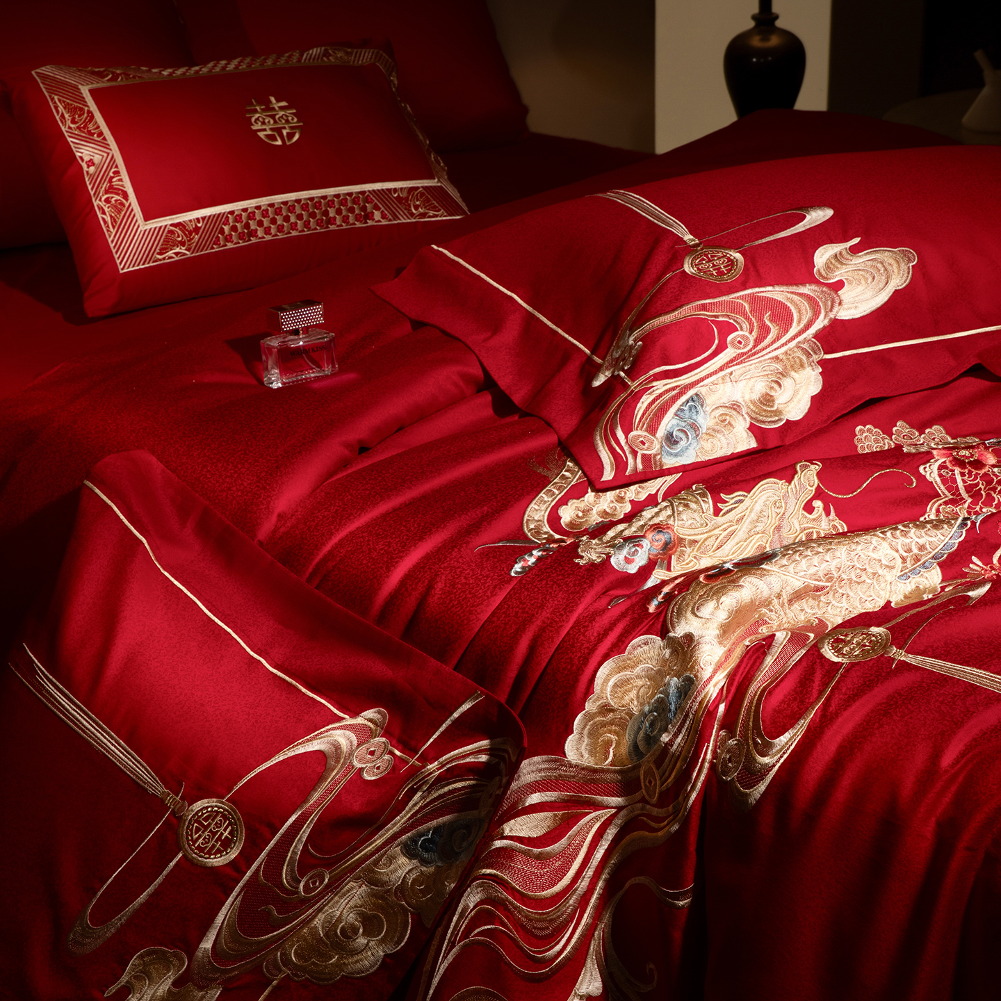 商品名称:(总)佳汐蓝家纺 2025新款100支贡缎提花全棉刺绣婚庆四件套-相亲相爱
