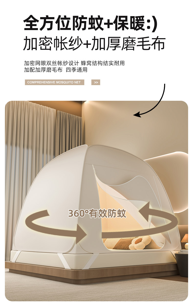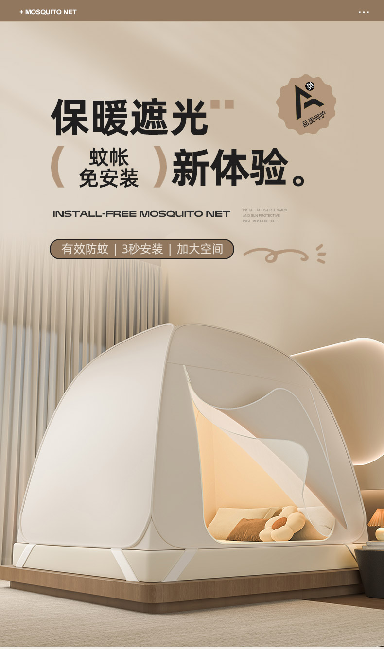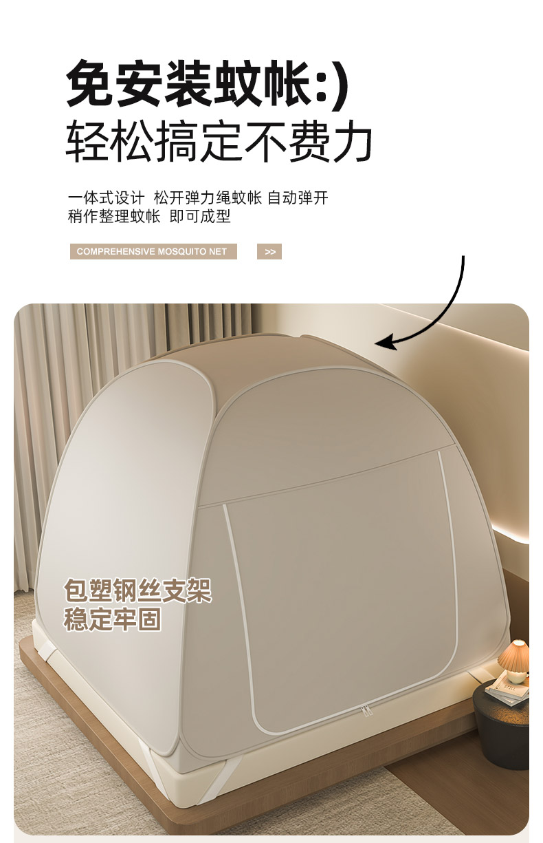 商品名称:海虹蚊帐 2025新款免安装保暖遮光钢丝蚊帐 浅米咖加厚全底