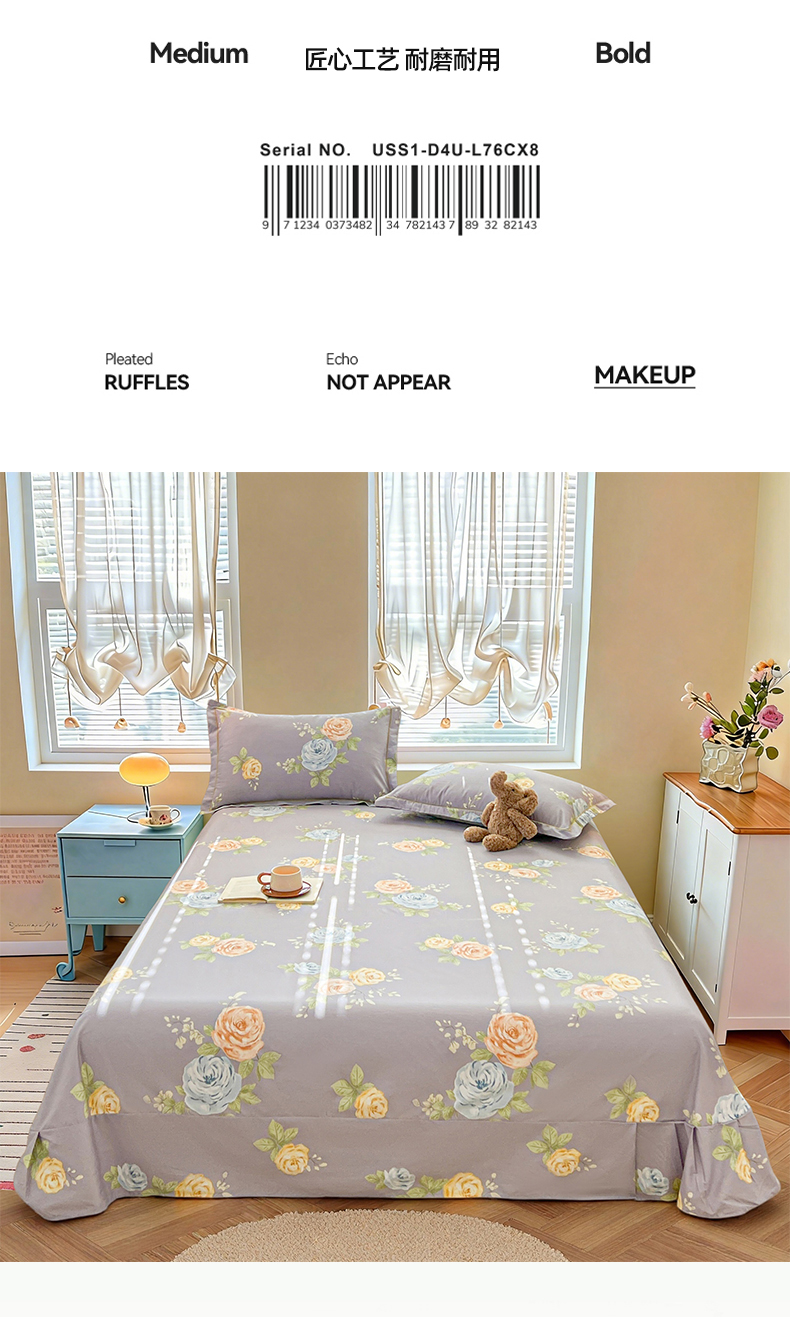 当前位置: 91家纺网 > 商品网购 > 床上用品 > 床单 > 名优家纺 2026新款60S13374高支密全棉印花纯色单床单 絮棠-灰