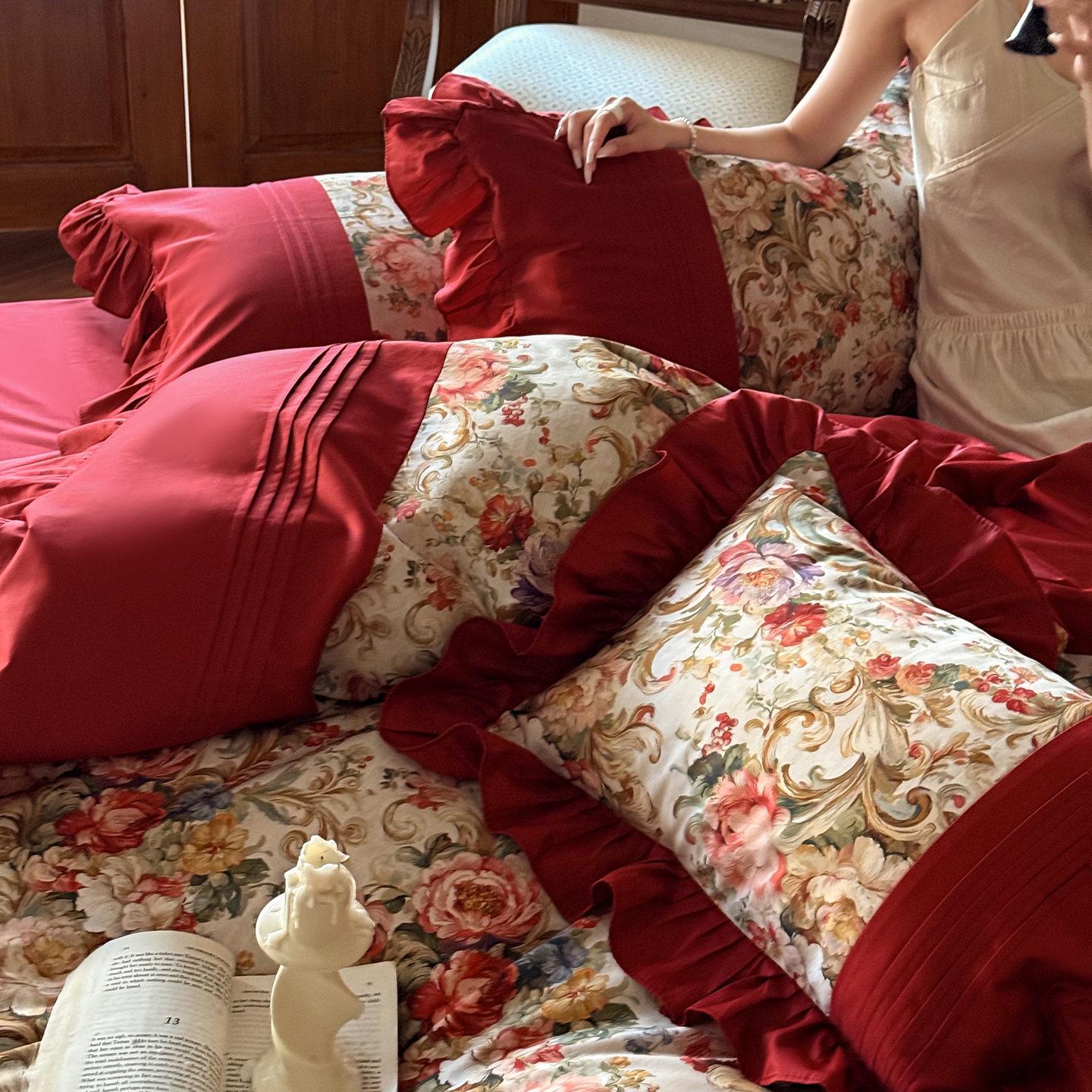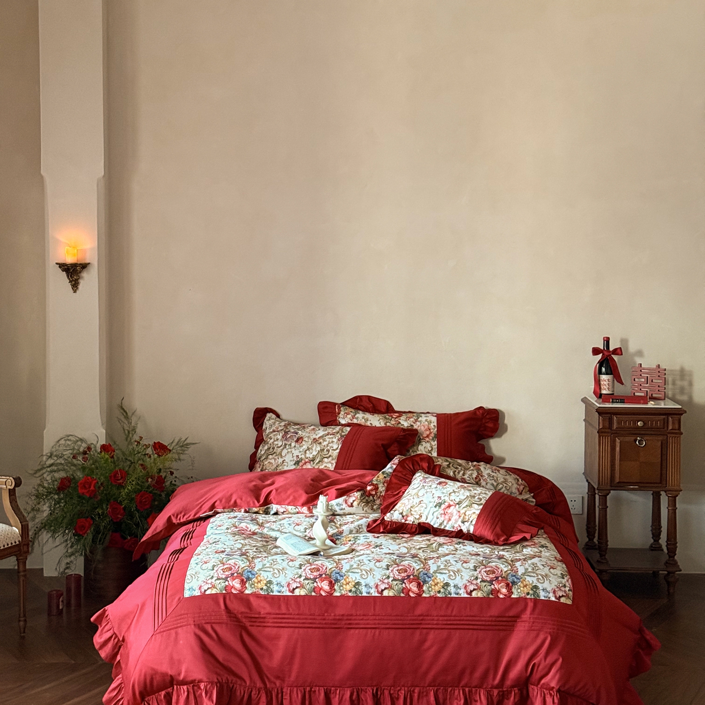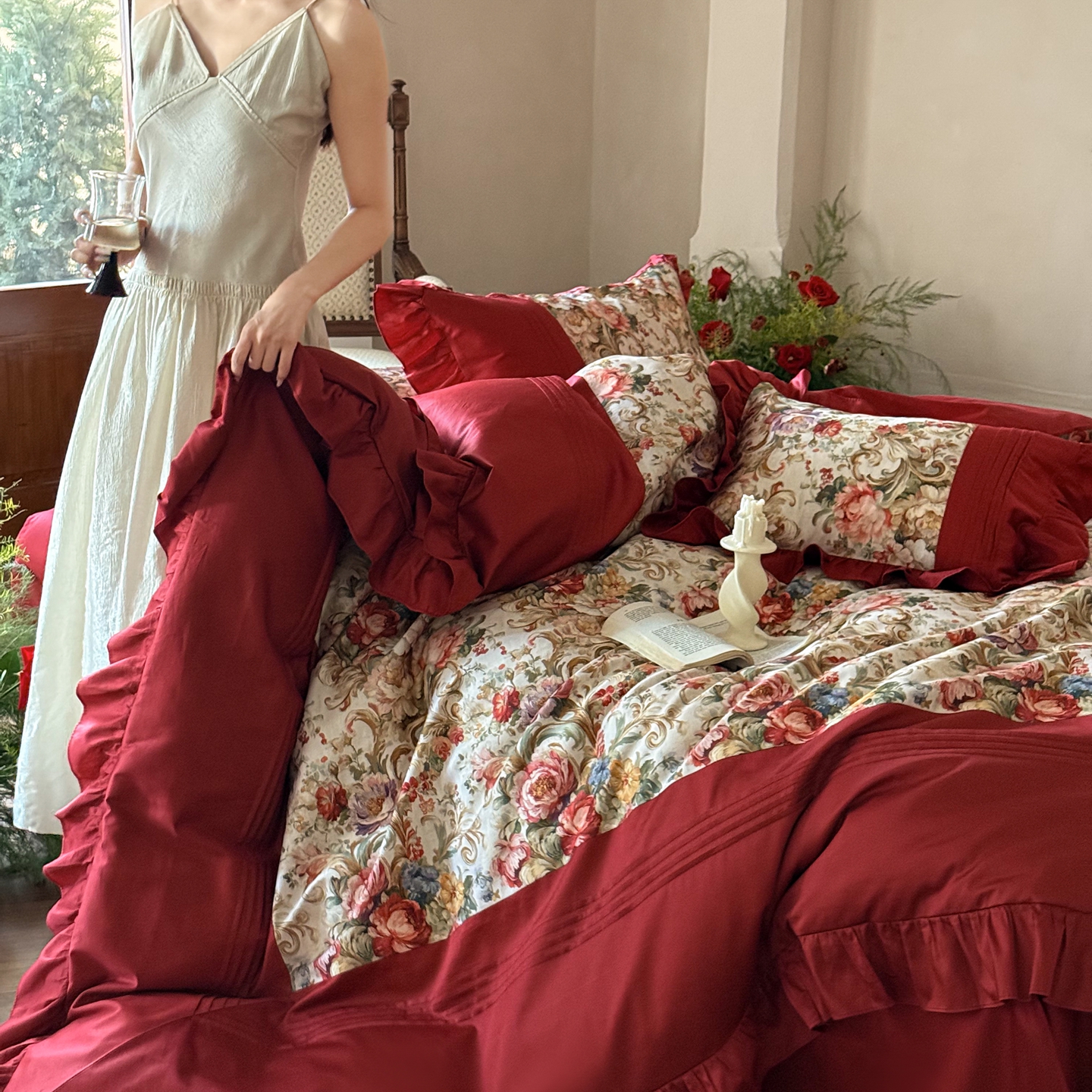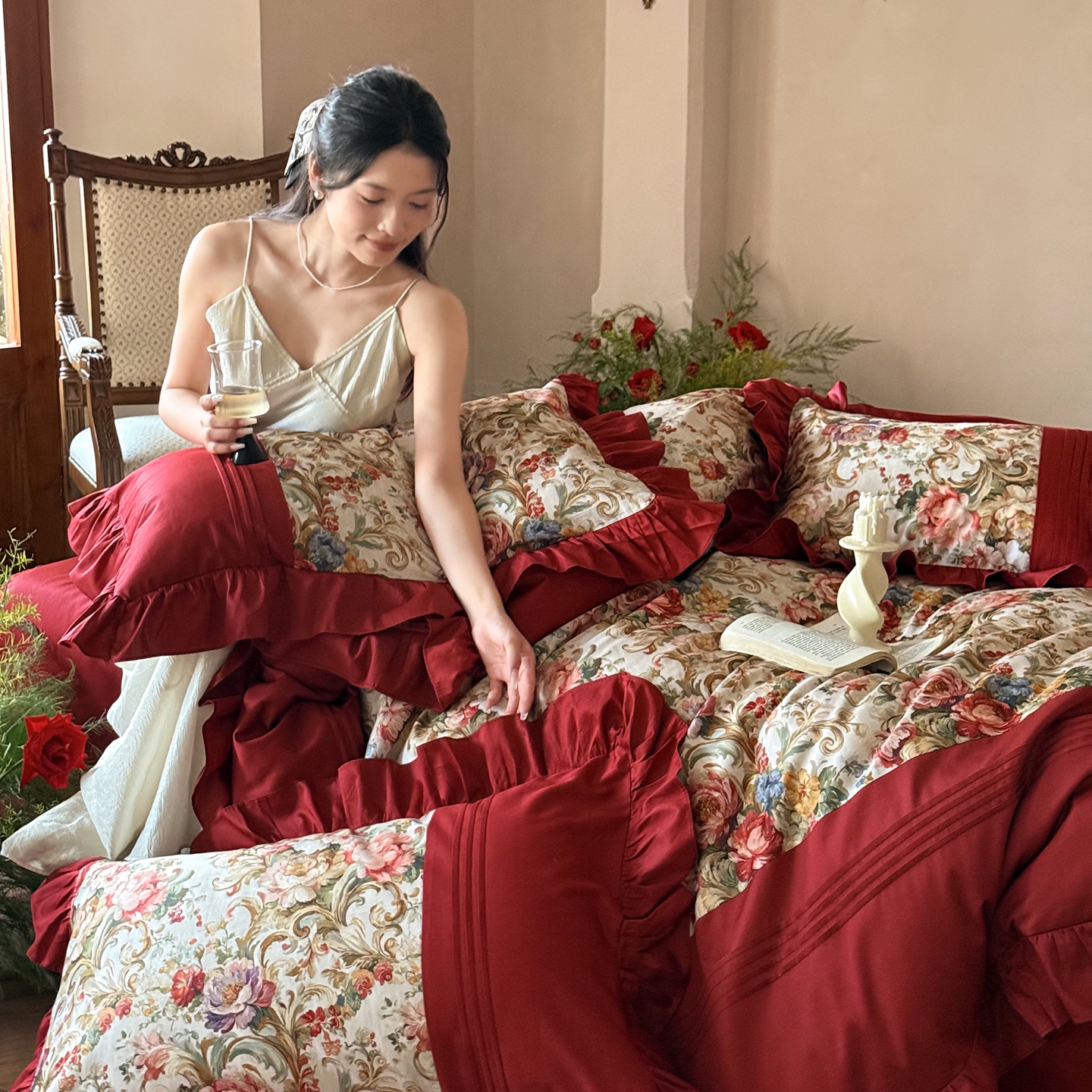 (总)优然居家纺 2025春夏新款木耳边喜字蝴蝶结小爱心复古红四件套-小欢喜,小欢喜